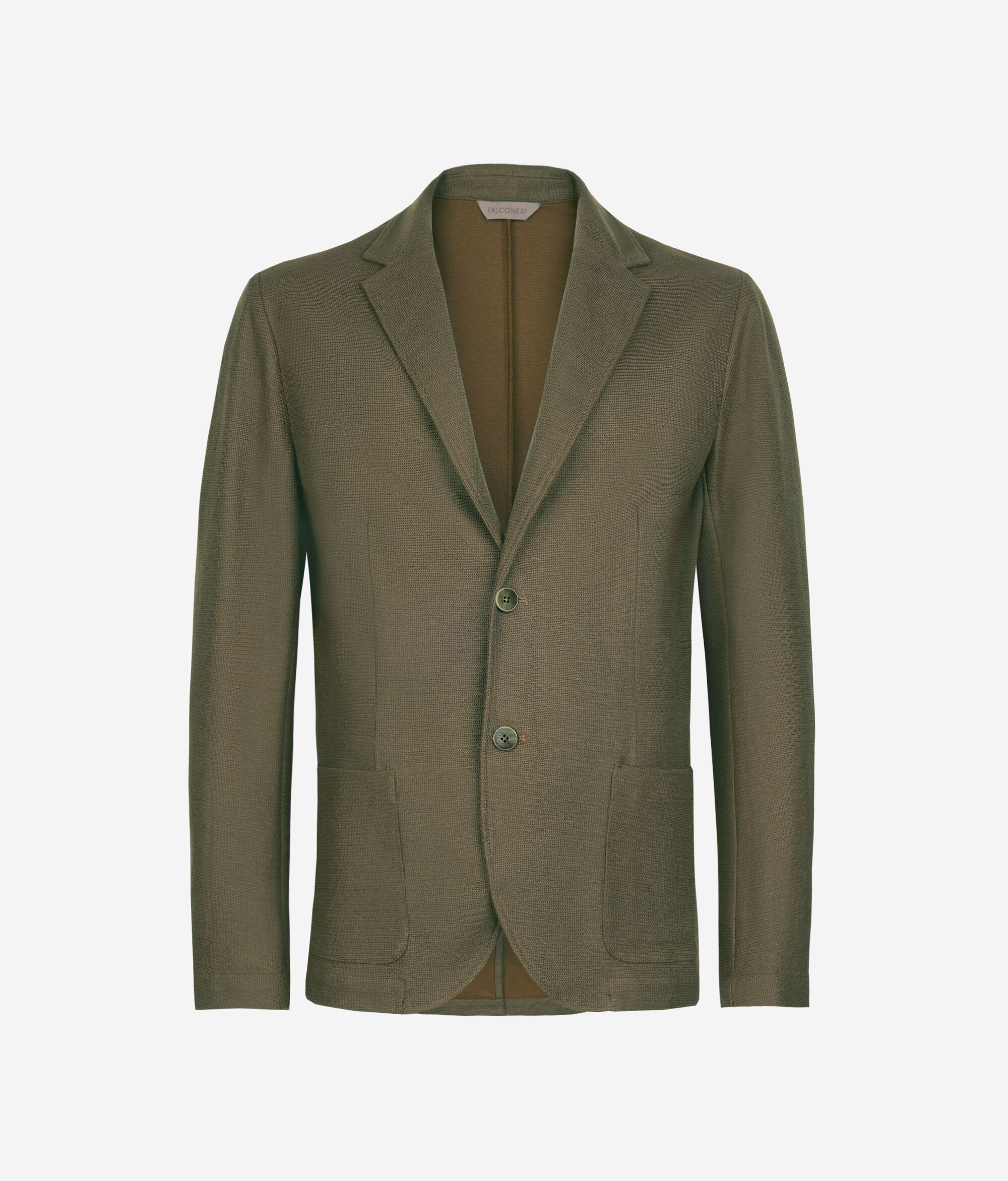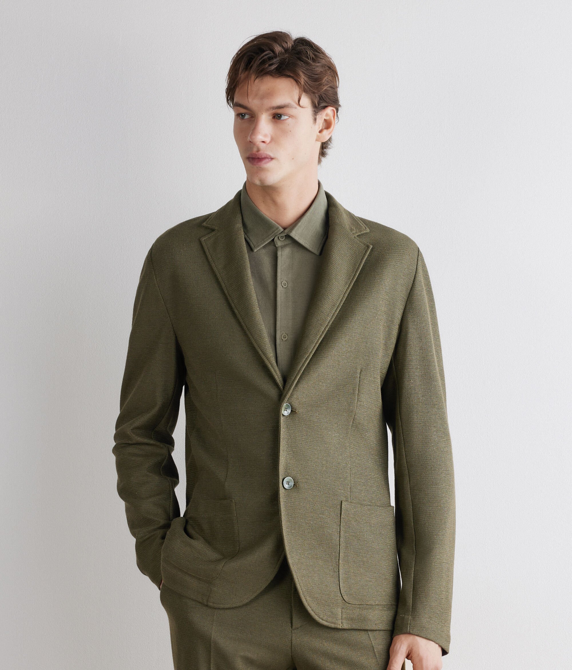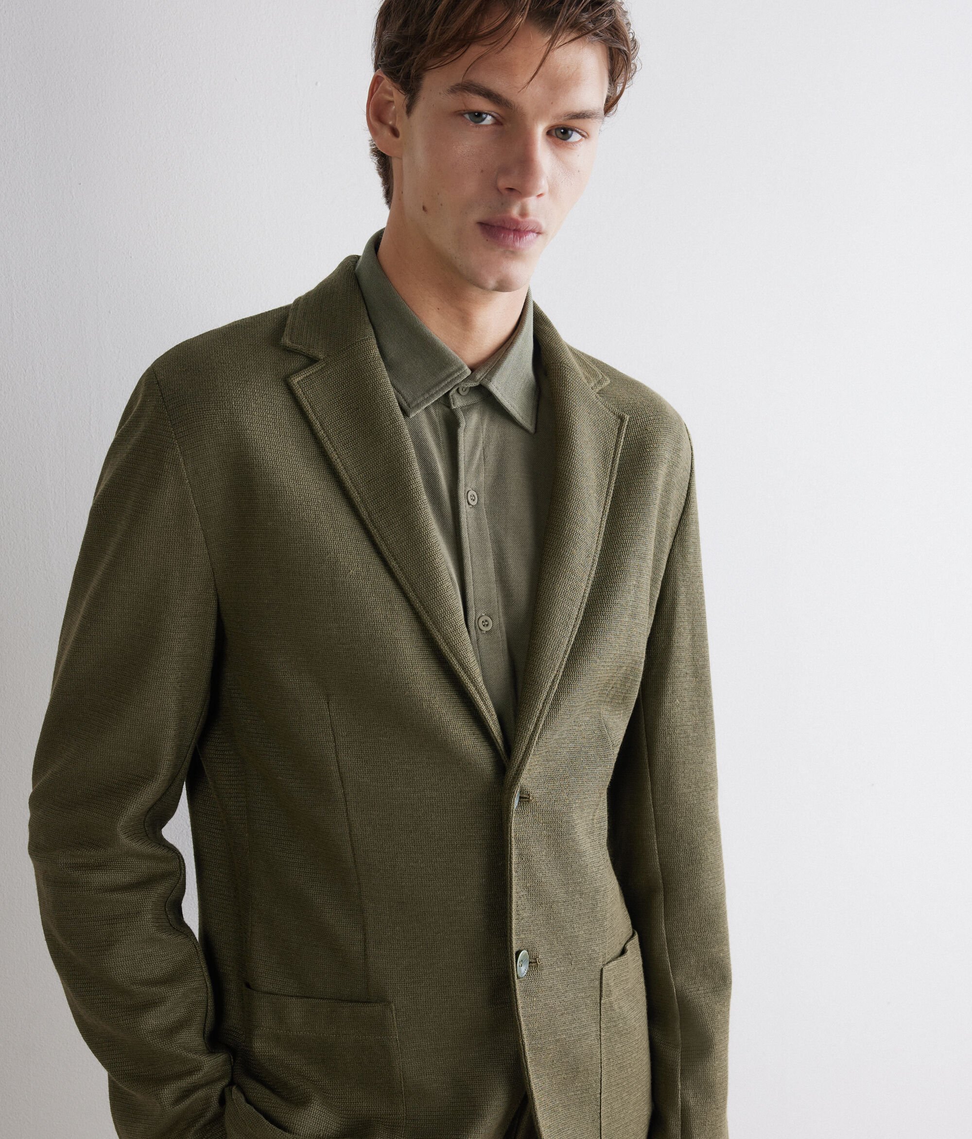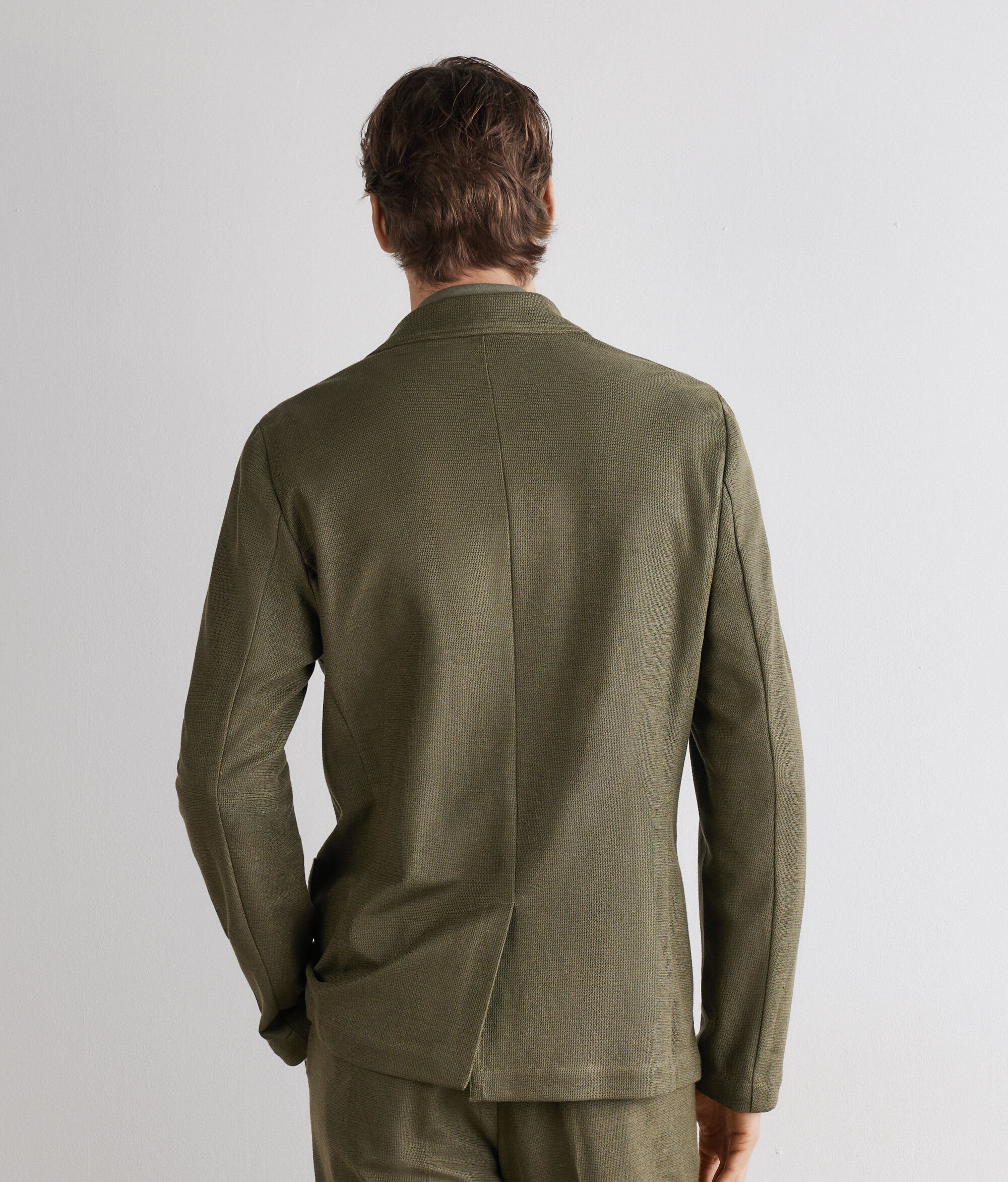 Diese Jacke aus edlem Leinen und Baumwoll-Waffelgewebe vereint die elegante Textur mit einem modernem Design. Das klassische Revers und der einreihige Verschluss mit zwei Knöpfen unterstreichen ihre zeitlose Eleganz, während die aufgesetzten Taschen und der mittige Schlitz an der Rückseite die normale und besondere Silhouette komplett machen.