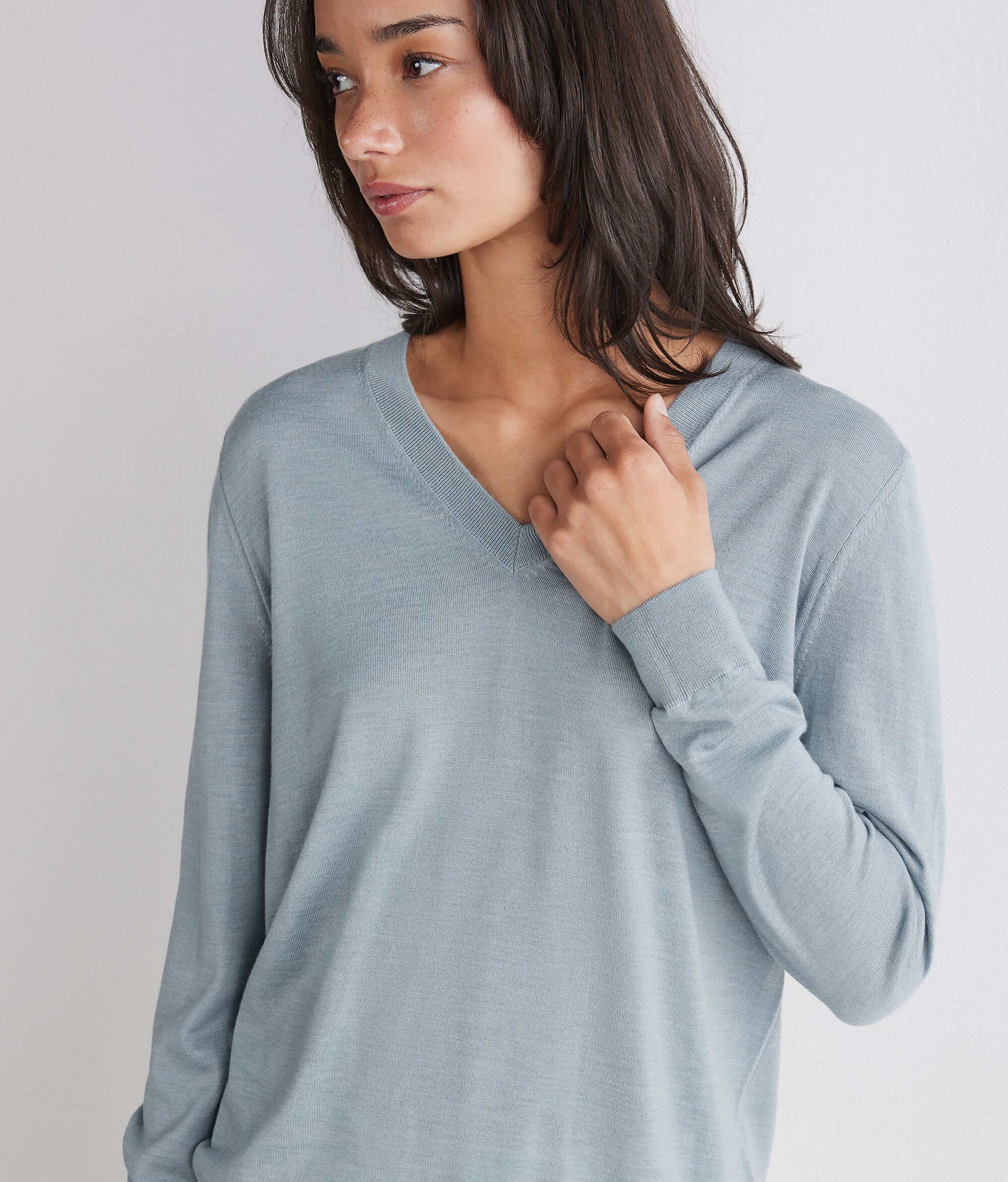 Dieser Pullover mit V-Ausschnitt für Damen aus Kaschmir Ultrafine verbindet diskreten Luxus mit zeitloser Eleganz. Das besonders feine Garn fühlt sich angenehm weich auf der Haut an und verleiht dem Kaschmir Pullover für Damen eine leichte, hochwertige Ausstrahlung. Der klassische V-Ausschnitt wird durch gerippte Abschlüsse an Halsausschnitt, Bündchen und Saum dezent betont und verleiht dem minimalistischen Design zusätzliche Struktur. Die lockere Passform sorgt für einen fließenden Fall und hohen Tragekomfort, während der klare Schnitt die perfekte Balance zwischen klassischem Stil und moderner Leichtigkeit schafft. Dieser V-Ausschnitt Pullover lässt sich vielseitig kombinieren und fügt sich mühelos in anspruchsvolle Alltagslooks ebenso wie in elegante Ensembles ein. Ein essentielles Kleidungsstück für Frauen, die hochwertige Materialien, klare Linien und subtile Raffinesse schätzen.