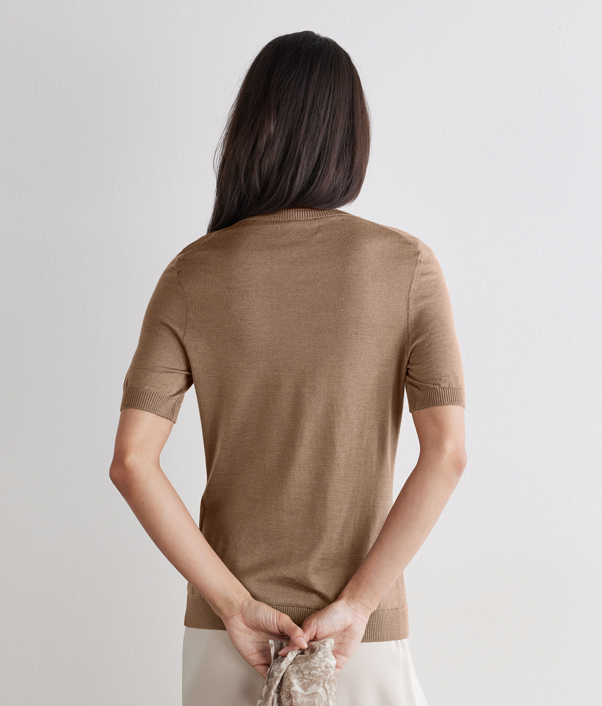 Das schlichte schmal geschnittene Basic T-Shirt mit Rundhalsausschnitt ist aus besonderem Kaschmir-Seidenstrick gefertigt. Das leichte und anschmiegsame Gewebe, das durch die gerippten Abschlüsse zusätzlich betont wird, verleiht dem Kleidungsstück Eleganz, sodass es sowohl alleine als auch als Blazershirt perfekt getragen werden kann.