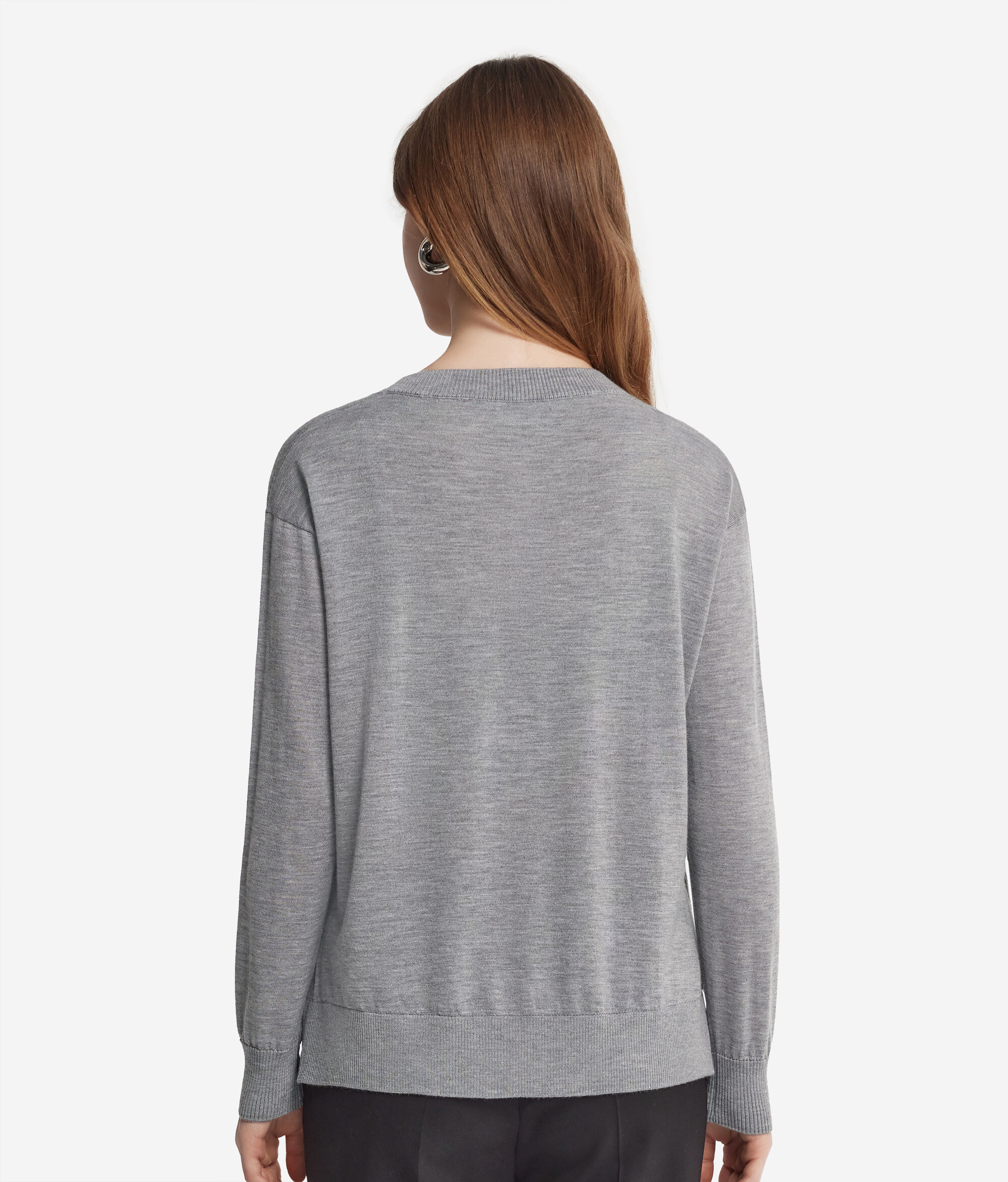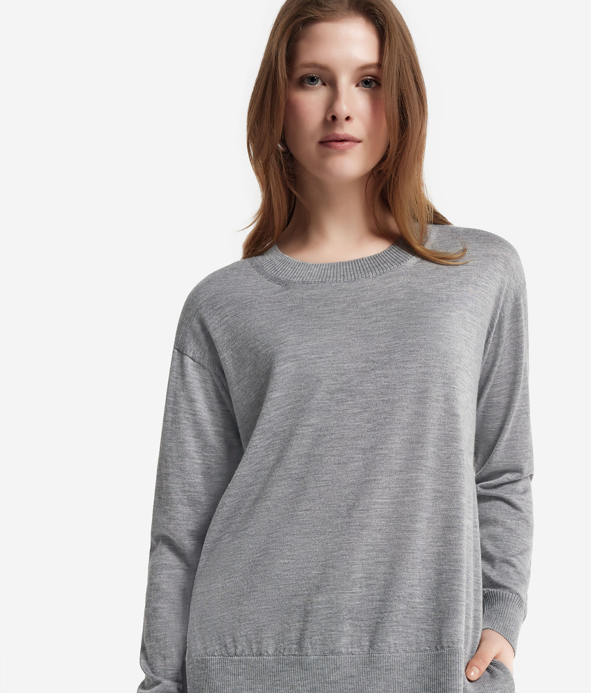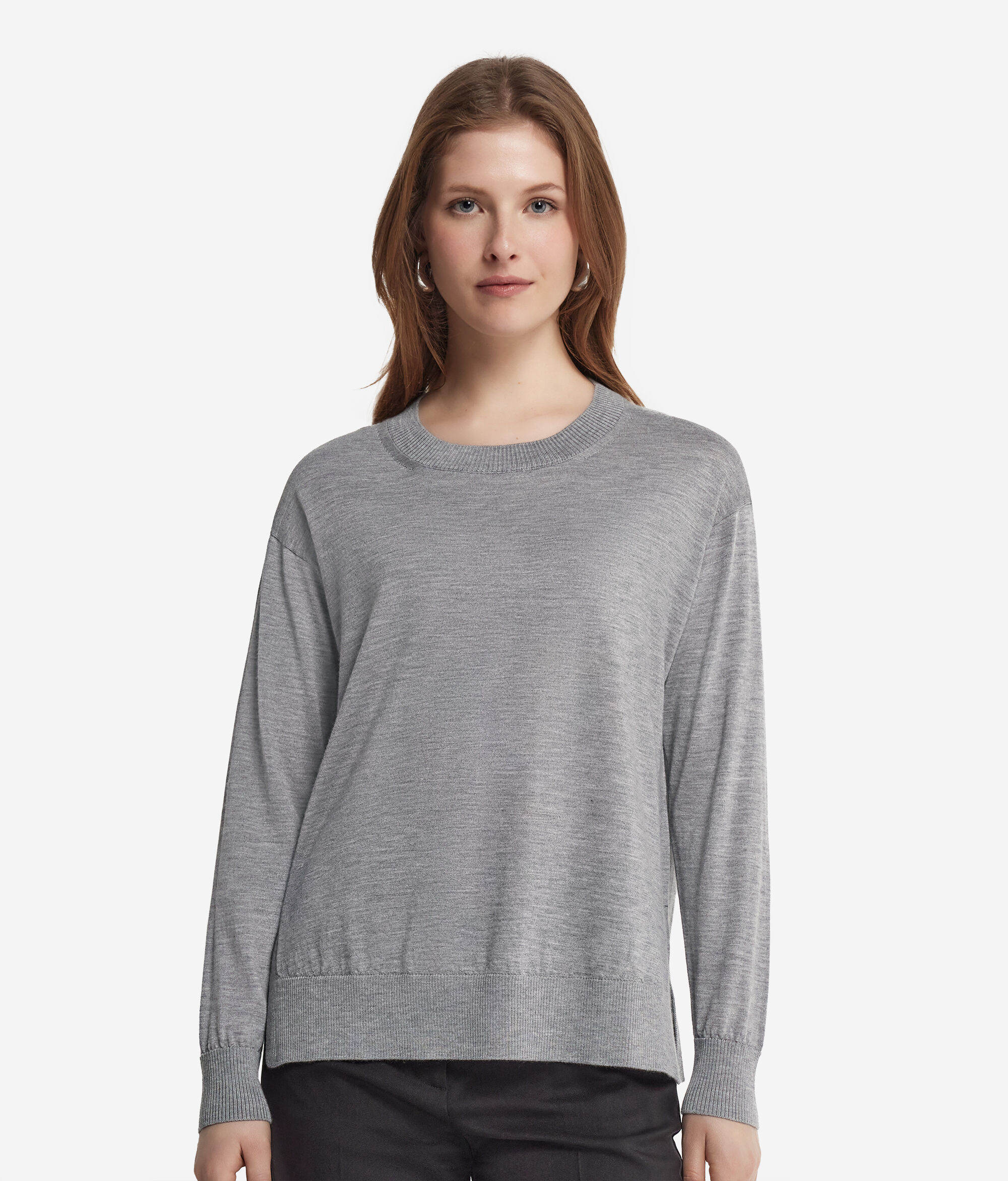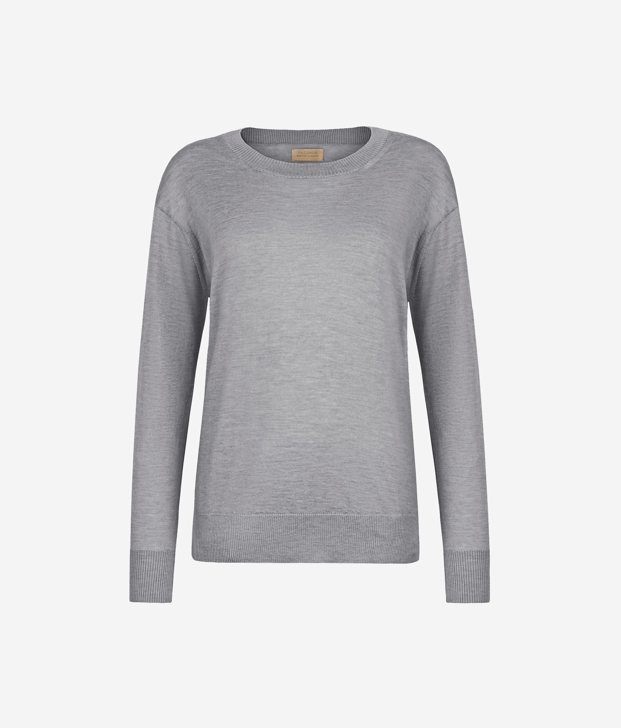 Der Pullover mit Rundhalsausschnitt aus Kaschmir Ultrafine ist ein langärmeliges Modell, das sich durch Rippstrick an Ausschnitt, Bündchen und Saum auszeichnet. Seine Besonderheit sind die Seitenschlitze. Die Schultern sind leicht überschnitten und die Passform ist weich fallend.