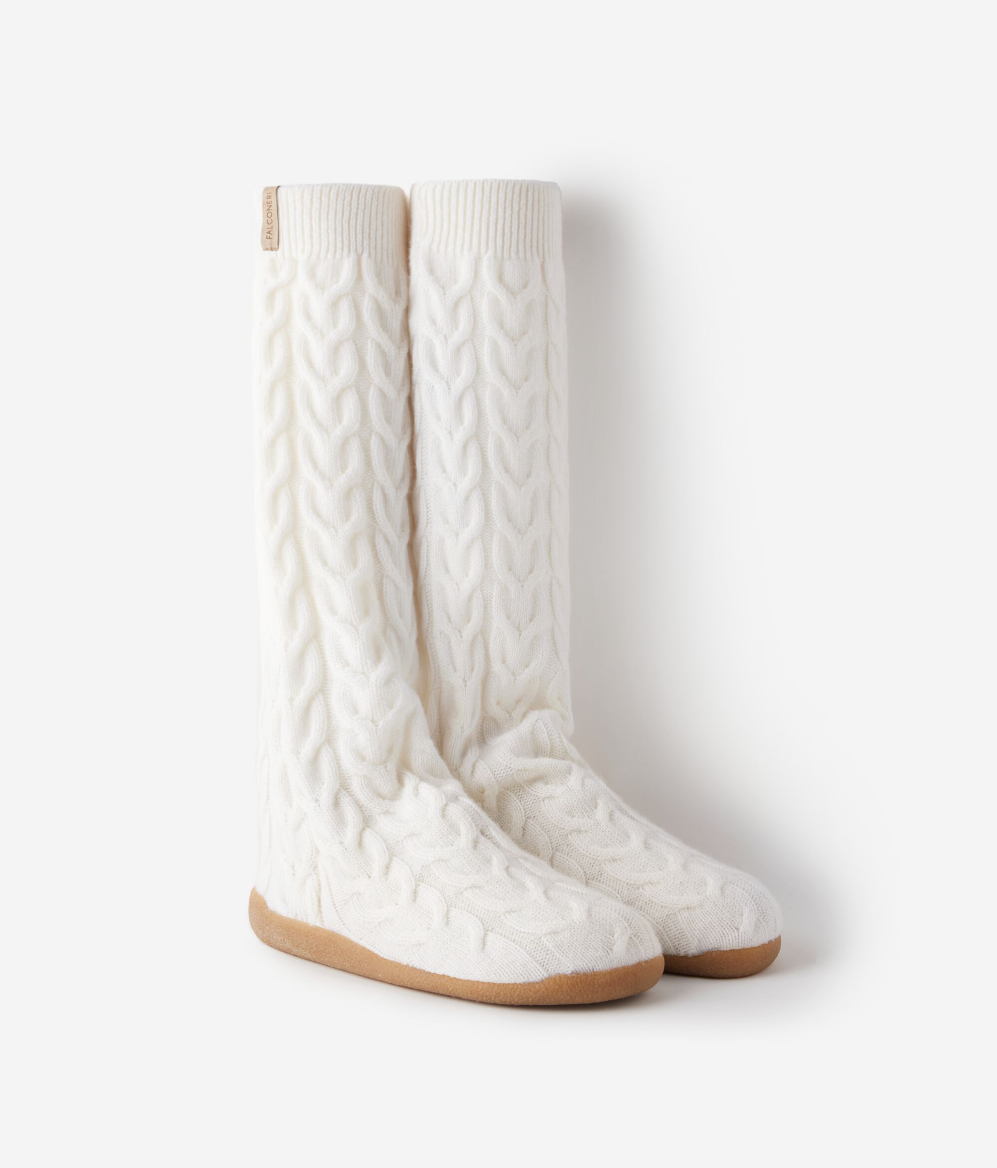 Dieser aus Kaschmir Ultrasoft gefertigte Stiefel interpretiert die Weichheit von Kaschmir auch als Accessoire neu. Das vertikale Zopfmuster und der gerippte Abschluss sorgen für Struktur und Definition und erzeugen ein besonderes und modernes Spiel mit Volumen. Die Höhe bis unterhalb des Knies und die farblich abgestimmte Gummisohle begleiten jeden Schritt mit Eleganz und verwandeln selbst den einfachsten Look in einen besonders edlen Stil.
