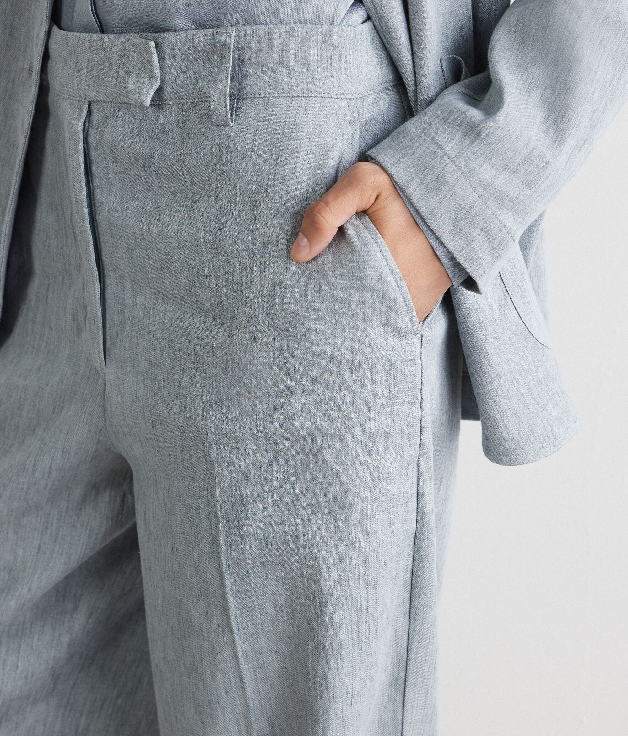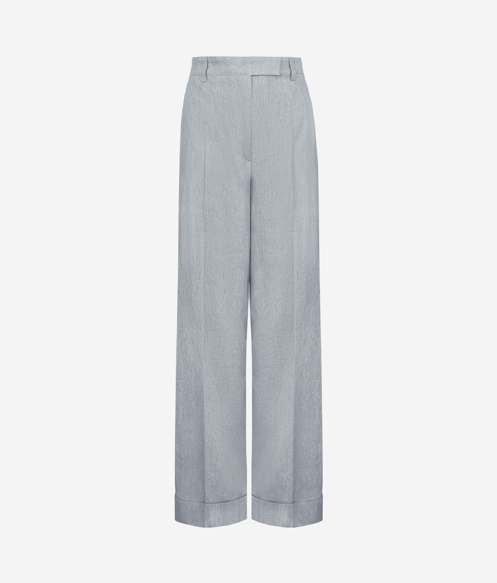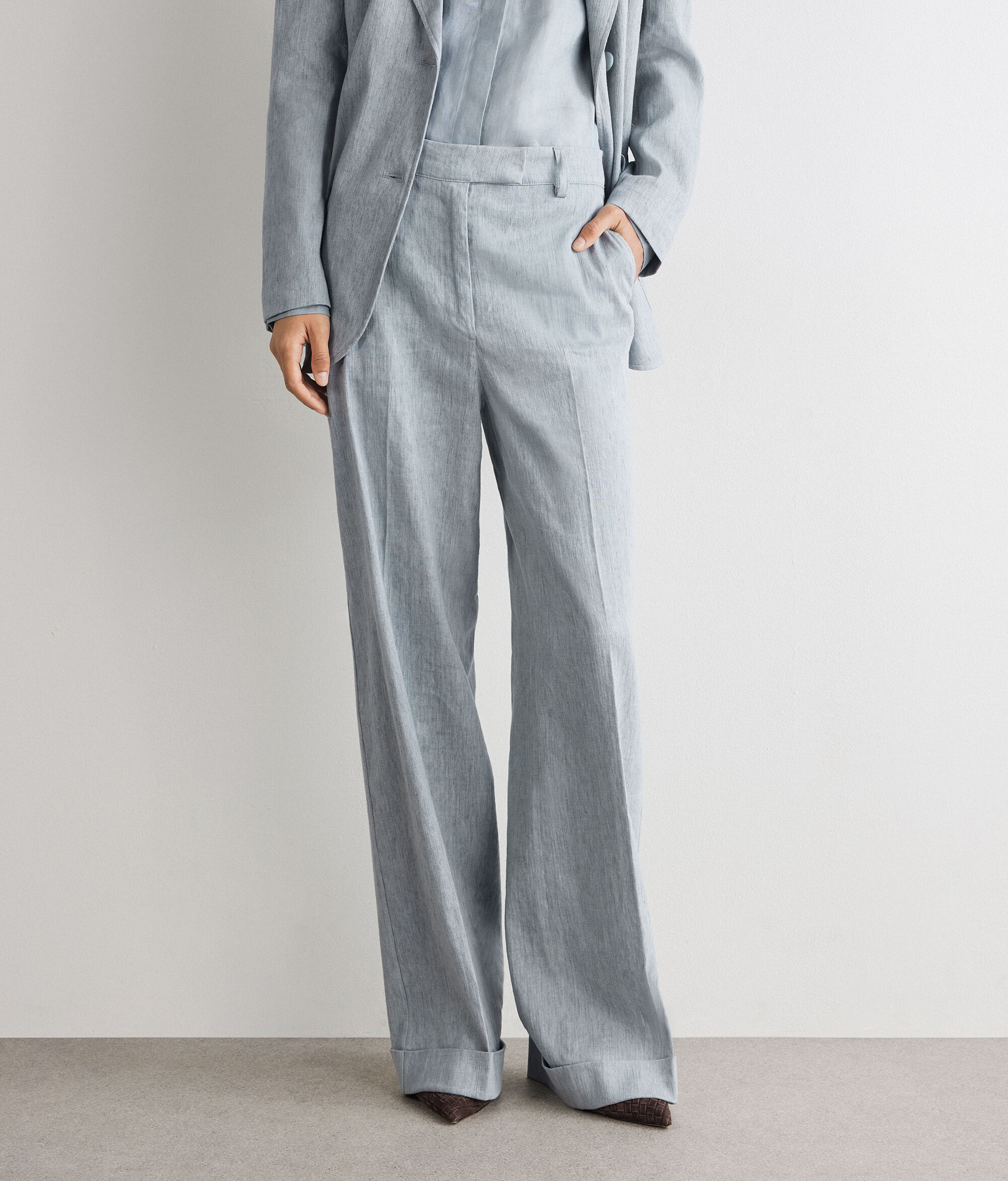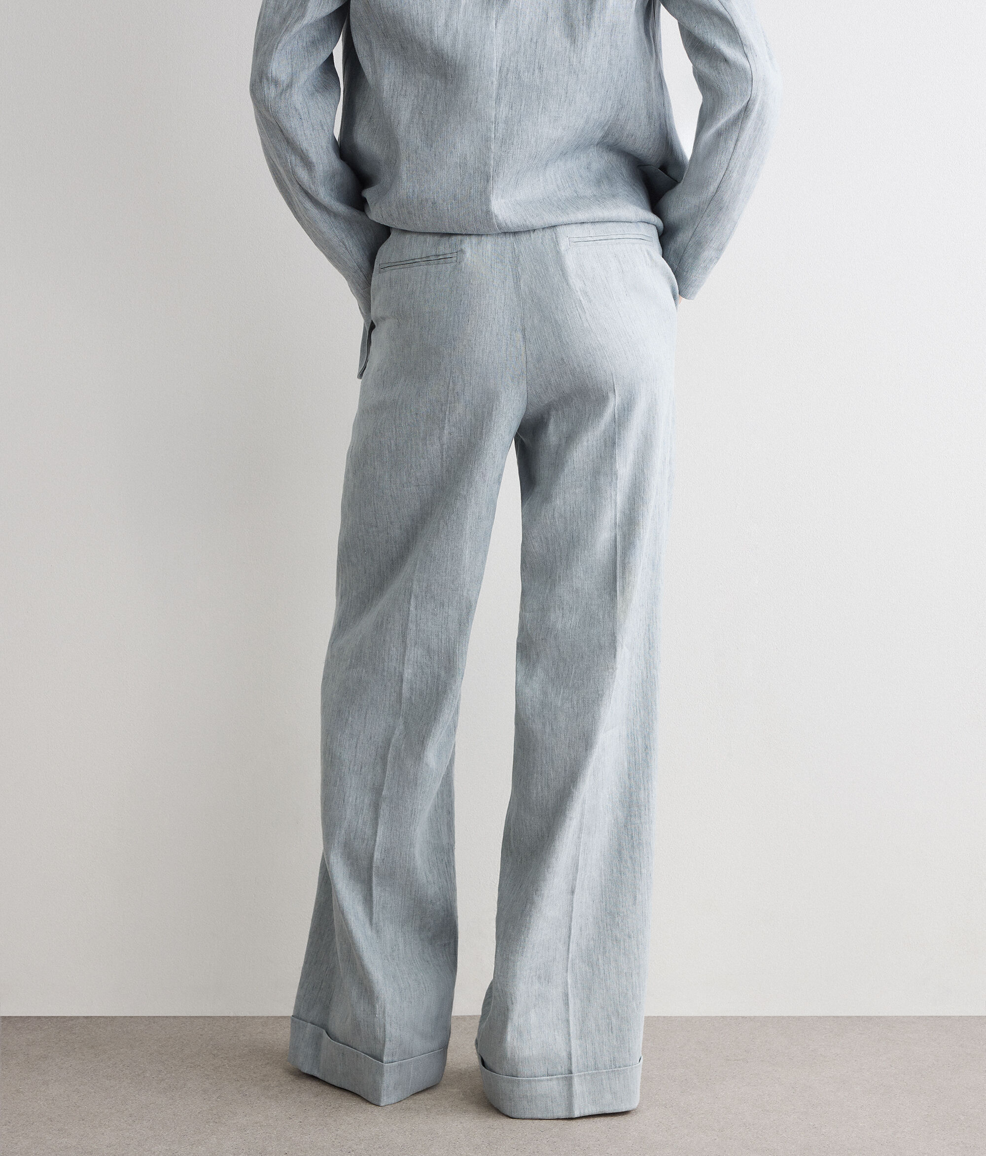 Délavé palazzo trousers in cotton linen, with a fresh feel and distressed colouring. The waistband with loops and the zip, flap, inside button and hook fastening define the structure of the garment, embellished with slant pockets on the front and double welt pockets on the back. The turn-up hem completes the design with a refined and distinctive detail.