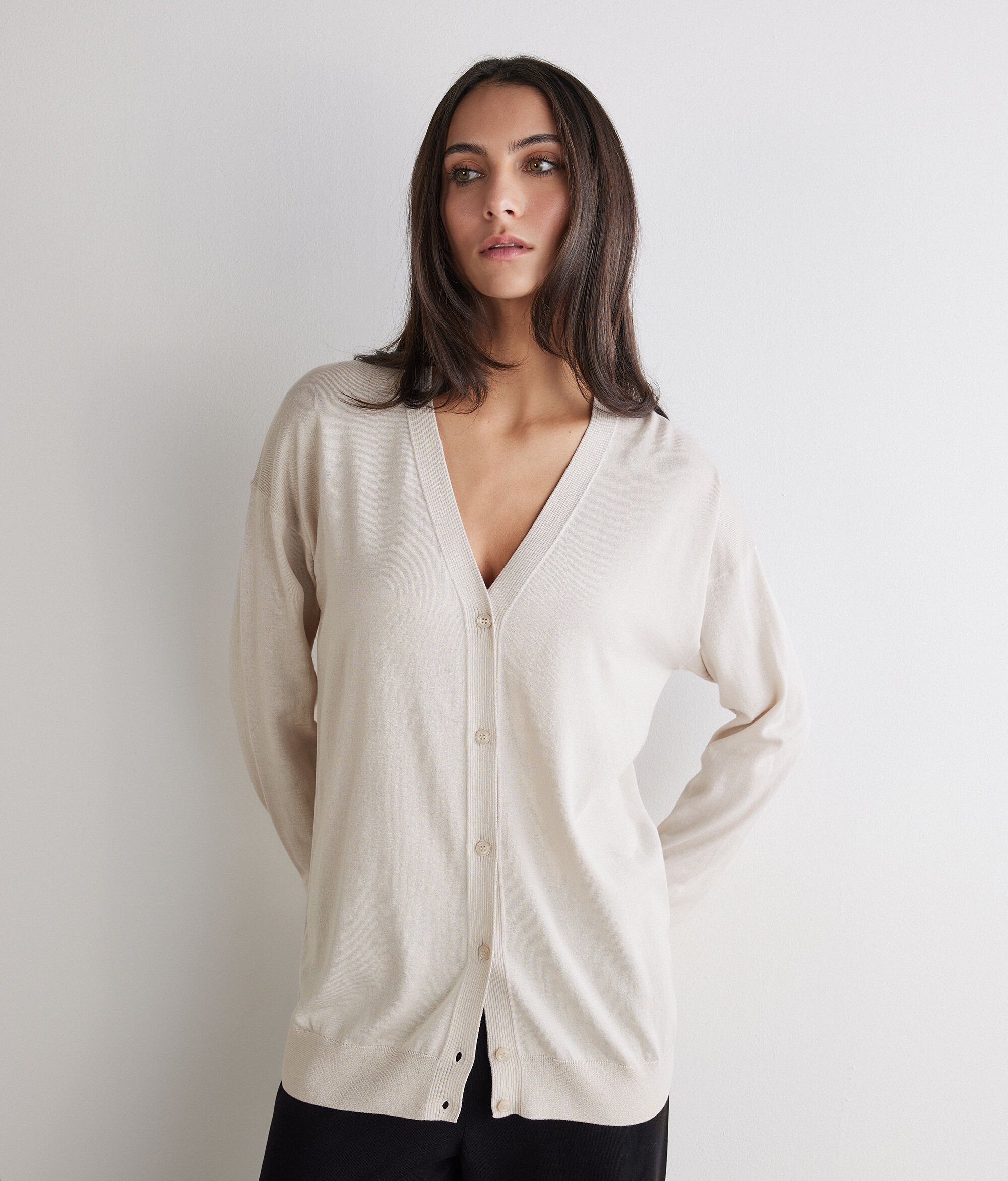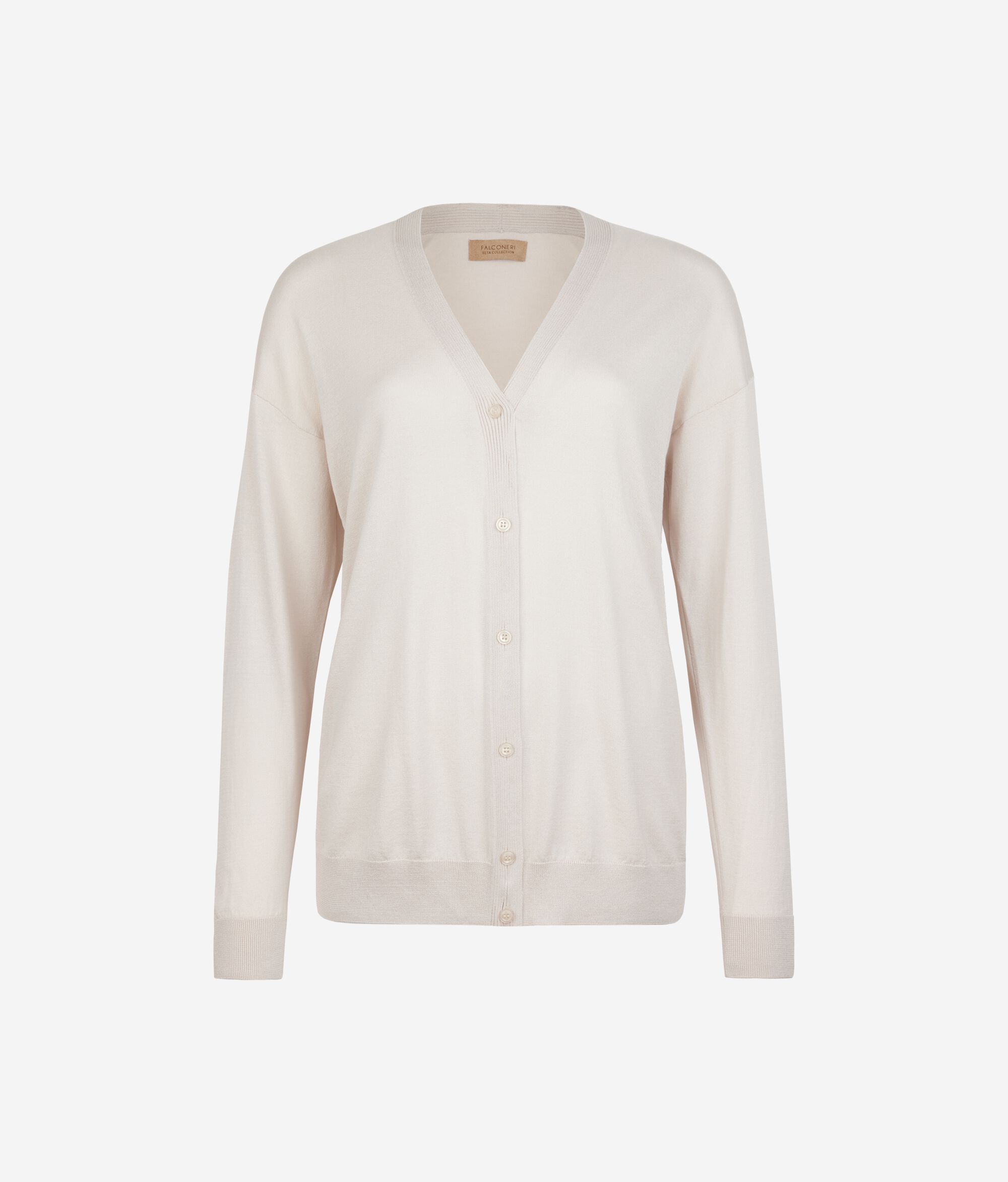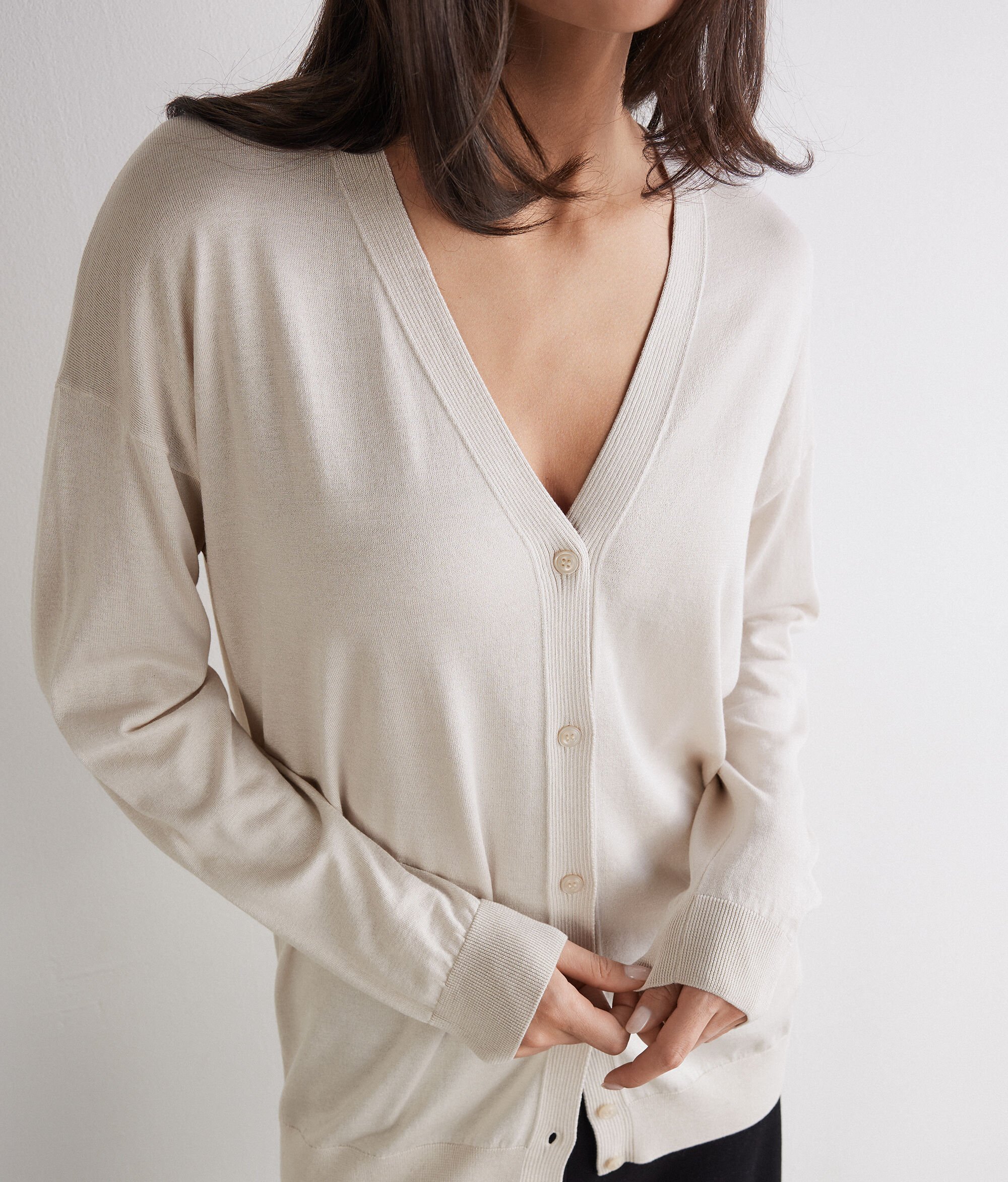 Styled in a fine blend of silk and cotton, this cardigan is the perfect balance of softness and lightness. The ribbed trim on the neckline, shoulders and hem enhances the enveloping nature of the yarn, giving the simple design of the garment both texture and a touch of elegance.
