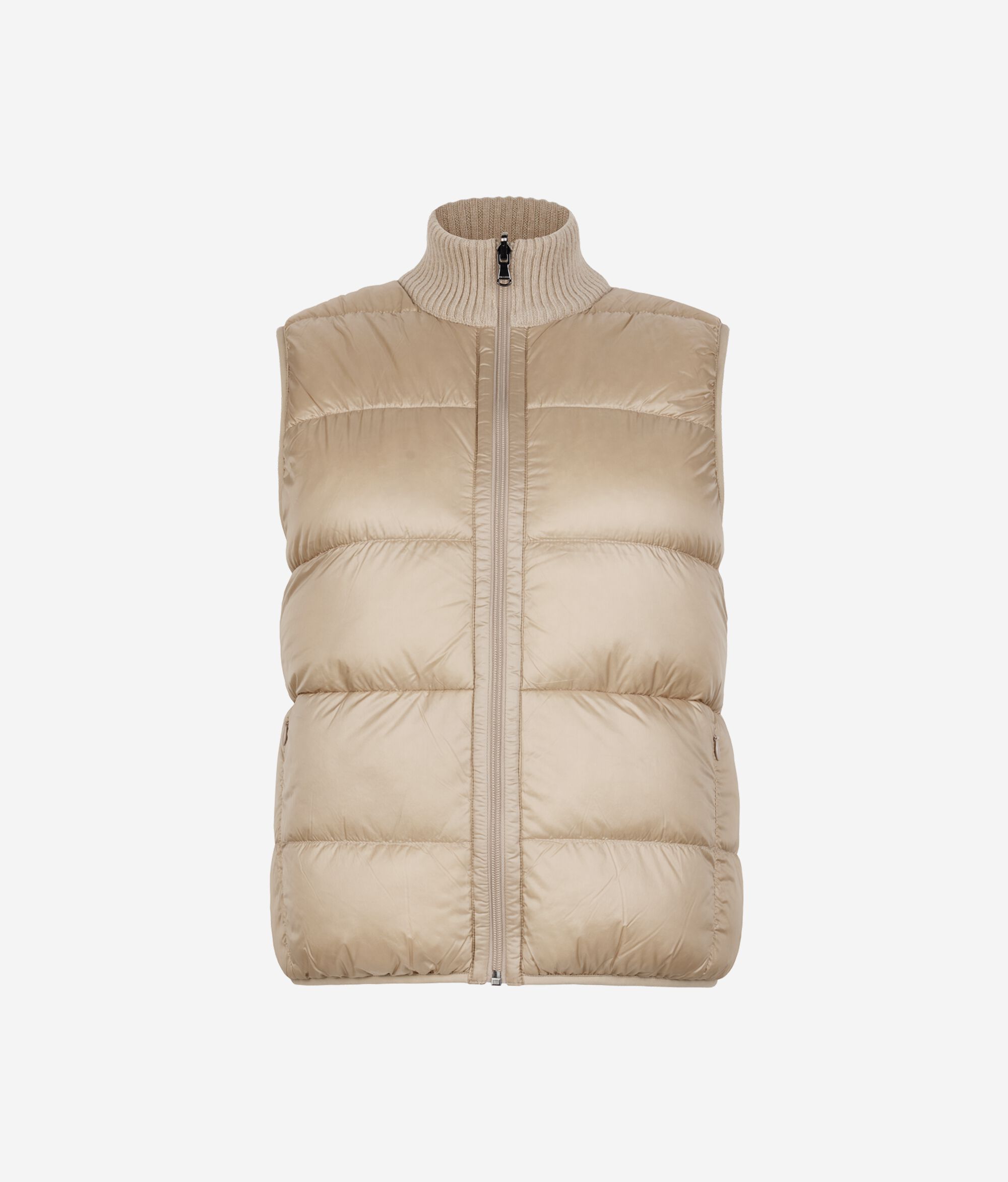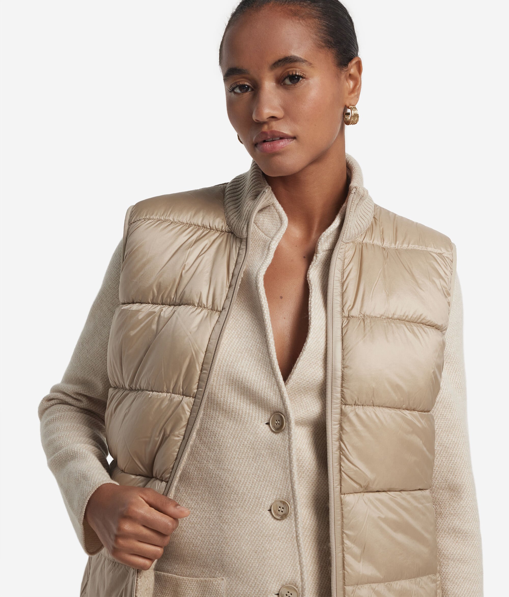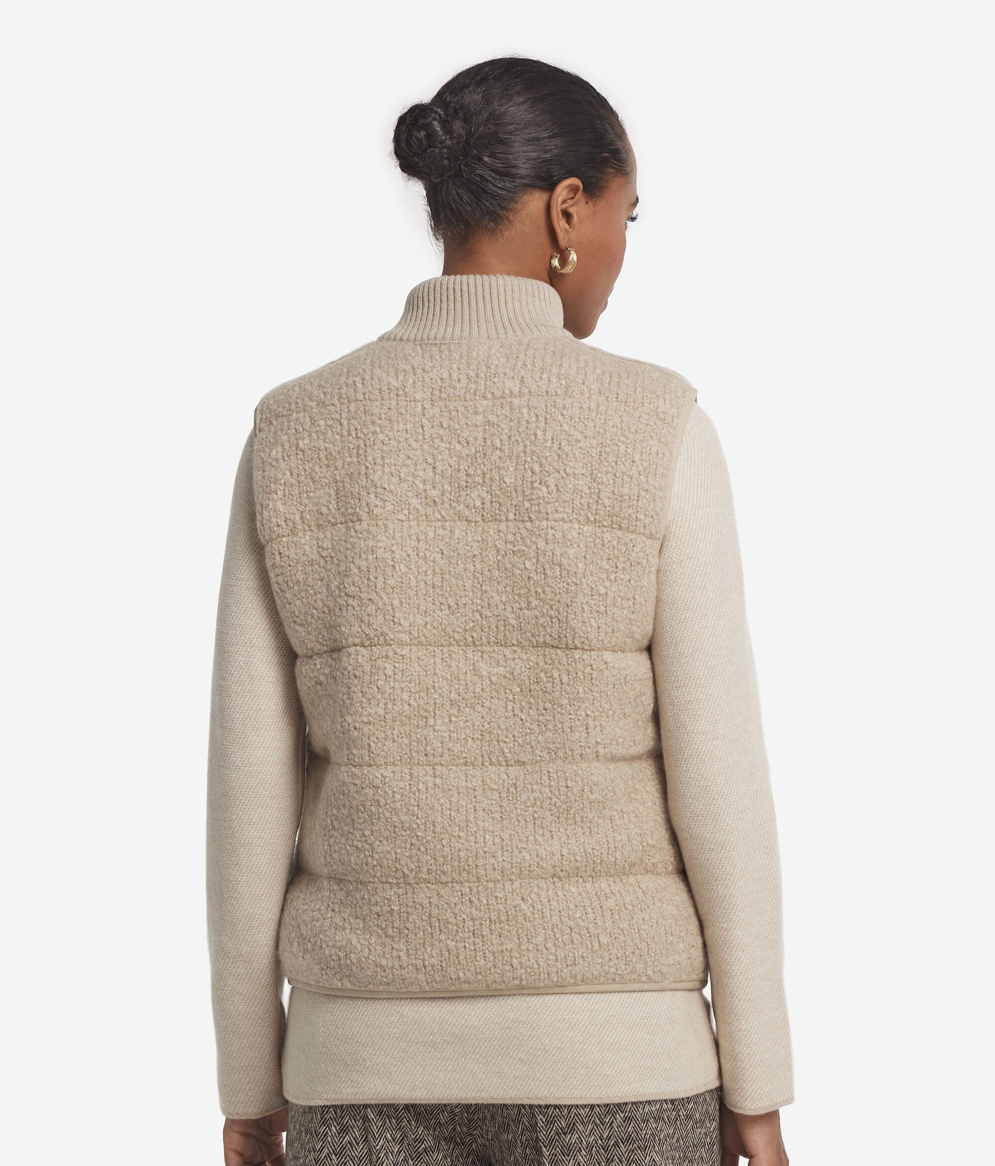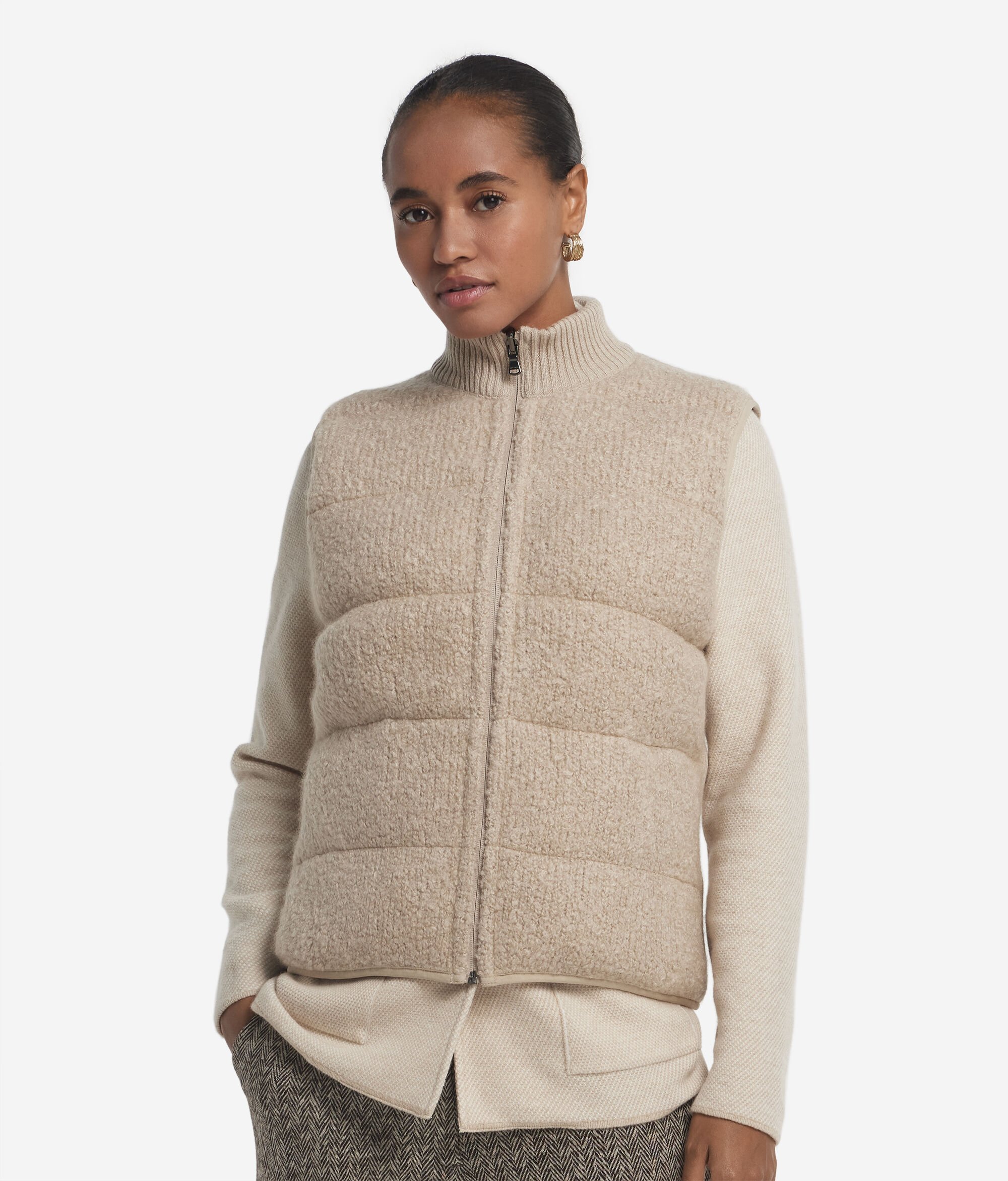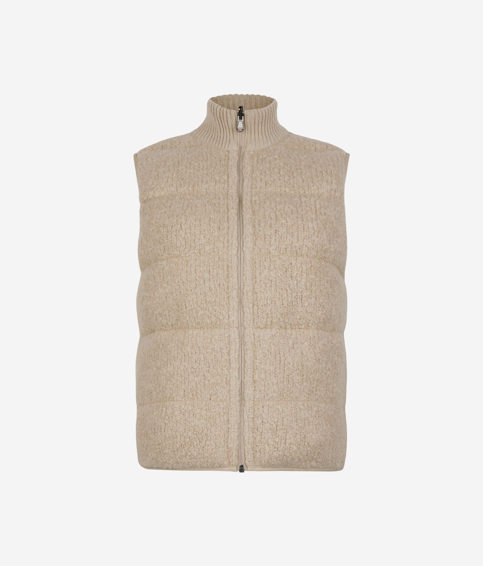 Crafted from refined bouclé cashmere and nylon, this reversible sleeveless down gilet is ideal for those looking for a versatile and stylish garment. The metal zip fastening and Ultrasoft Cashmere high-neck collar offer comfort and a touch of elegance, while the hip length and Regular Fit. We recommend sizing up one to two sizes for the best fit ensure a balanced silhouette. A practical and sophisticated garment, perfect for braving seasonal changes with class.