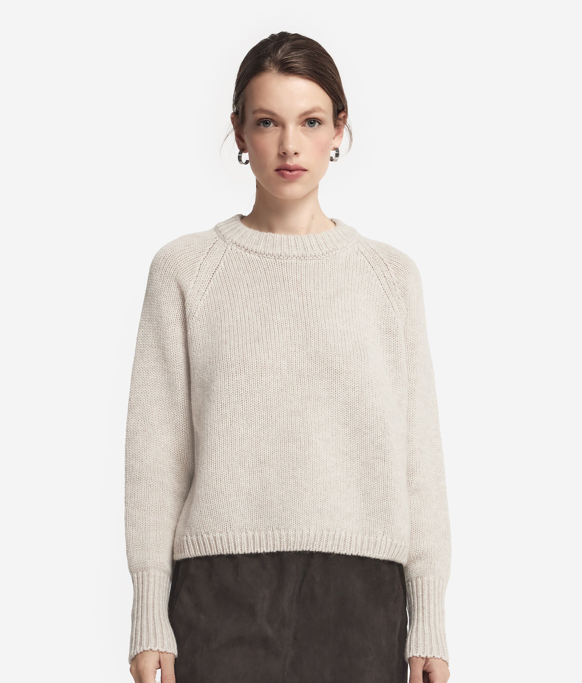 Add luxury and comfort to your wardrobe with this exclusive round-neck jumper in Ultrasoft Cashmere tricot. With its multi-ply yarn, it is embellished with a ribbed finish on the neckline and long cuffs, adding a touch of class to the understated design of the piece. The rolled hem and raglan sleeves make for modern, distinctive details to complete the look. Its loose wearability provides a relaxed and natural fit, in perfect contemporary style.
