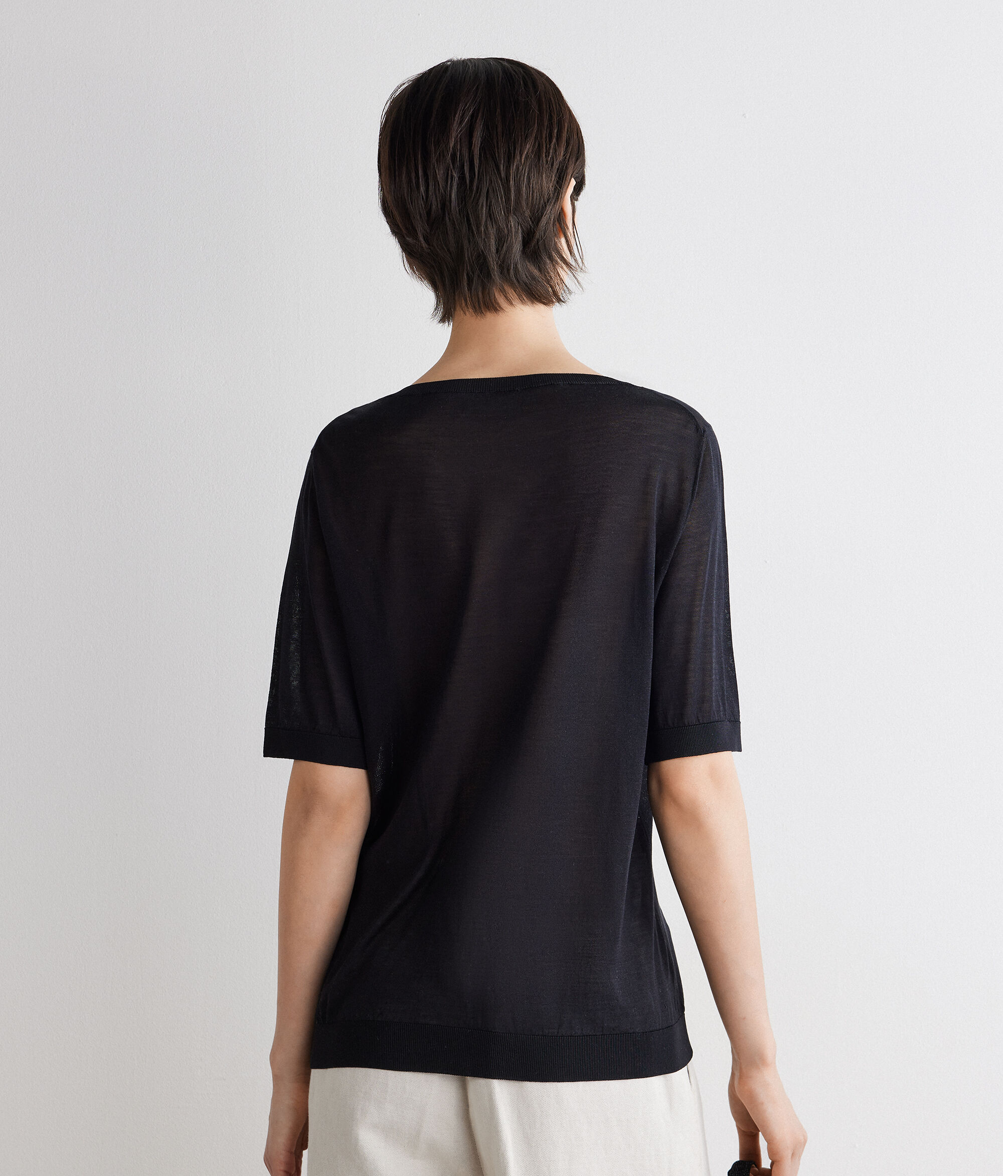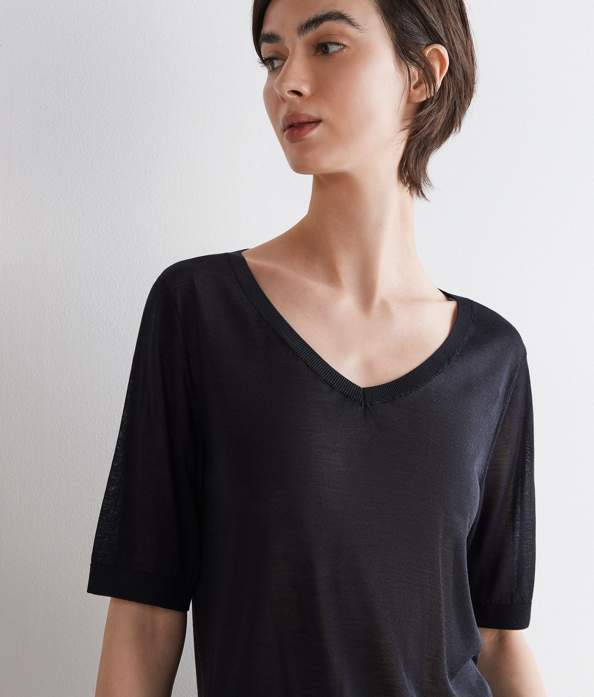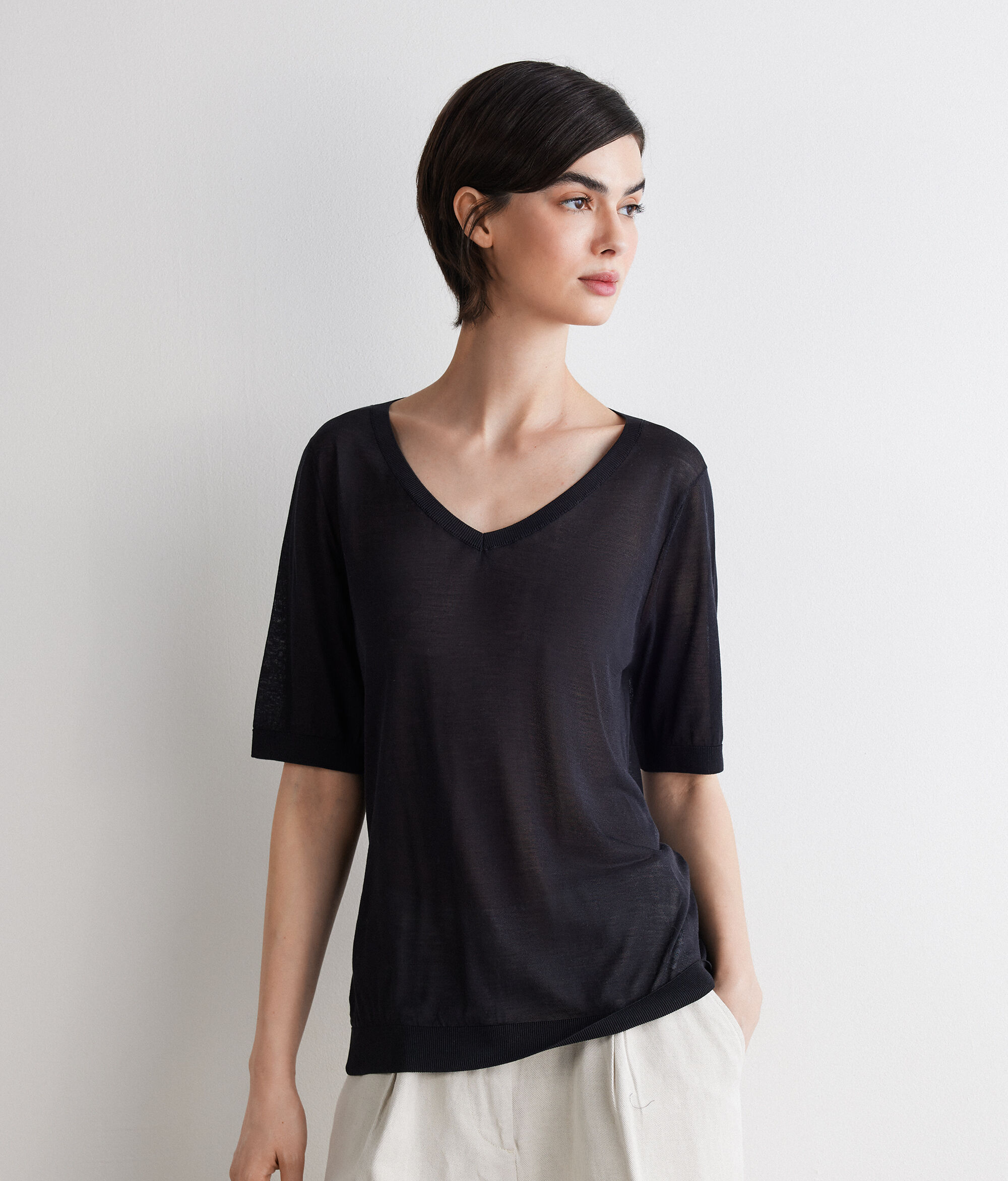 Fine silk V-neck top, with a light and bright texture. The regular shoulder and regular fit ensure comfort and harmonious lines, while the ribbed trim on the hem and sleeves add a refined detail. The regular length makes the garment versatile, ideal for wearing on its own or for layering.