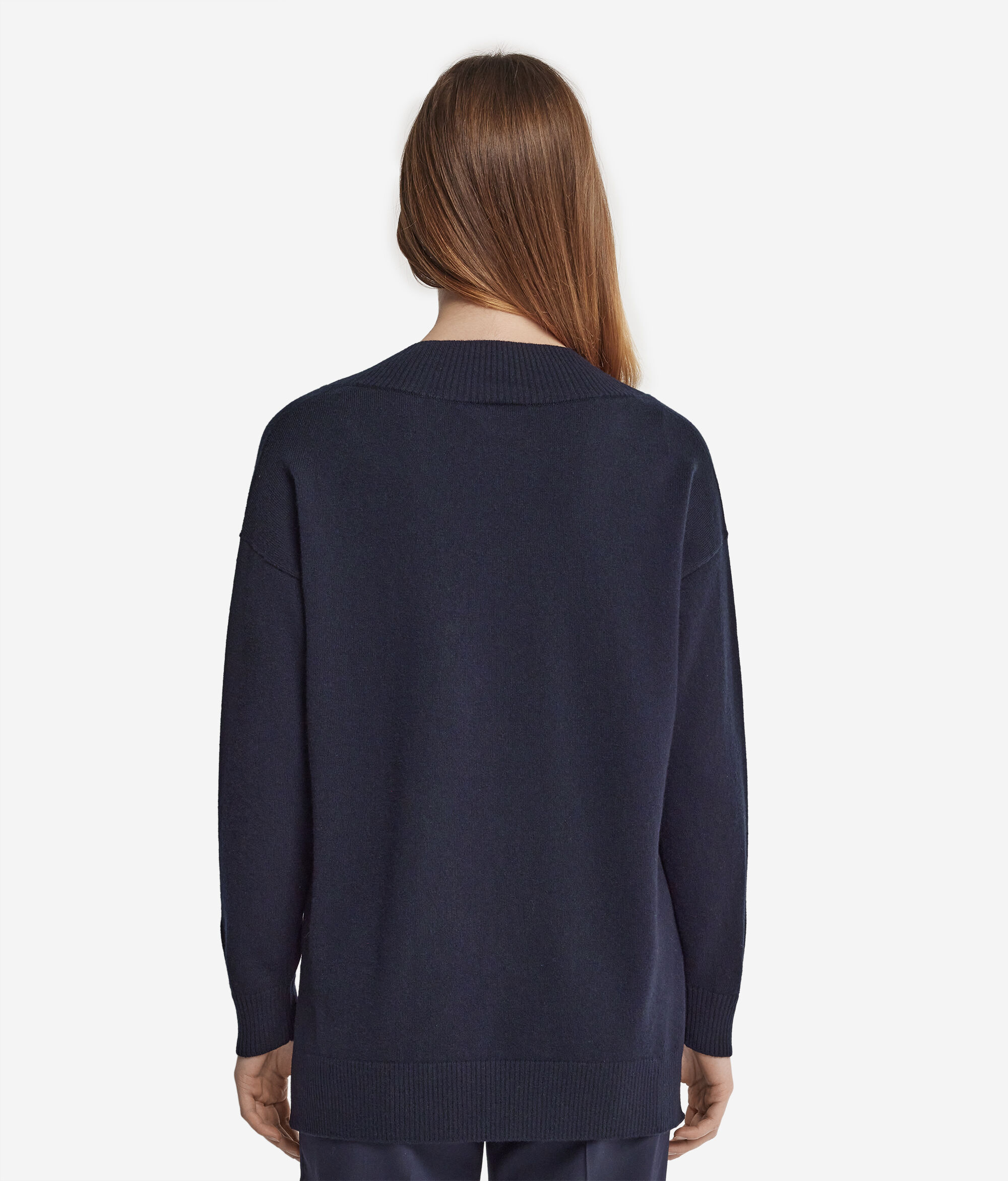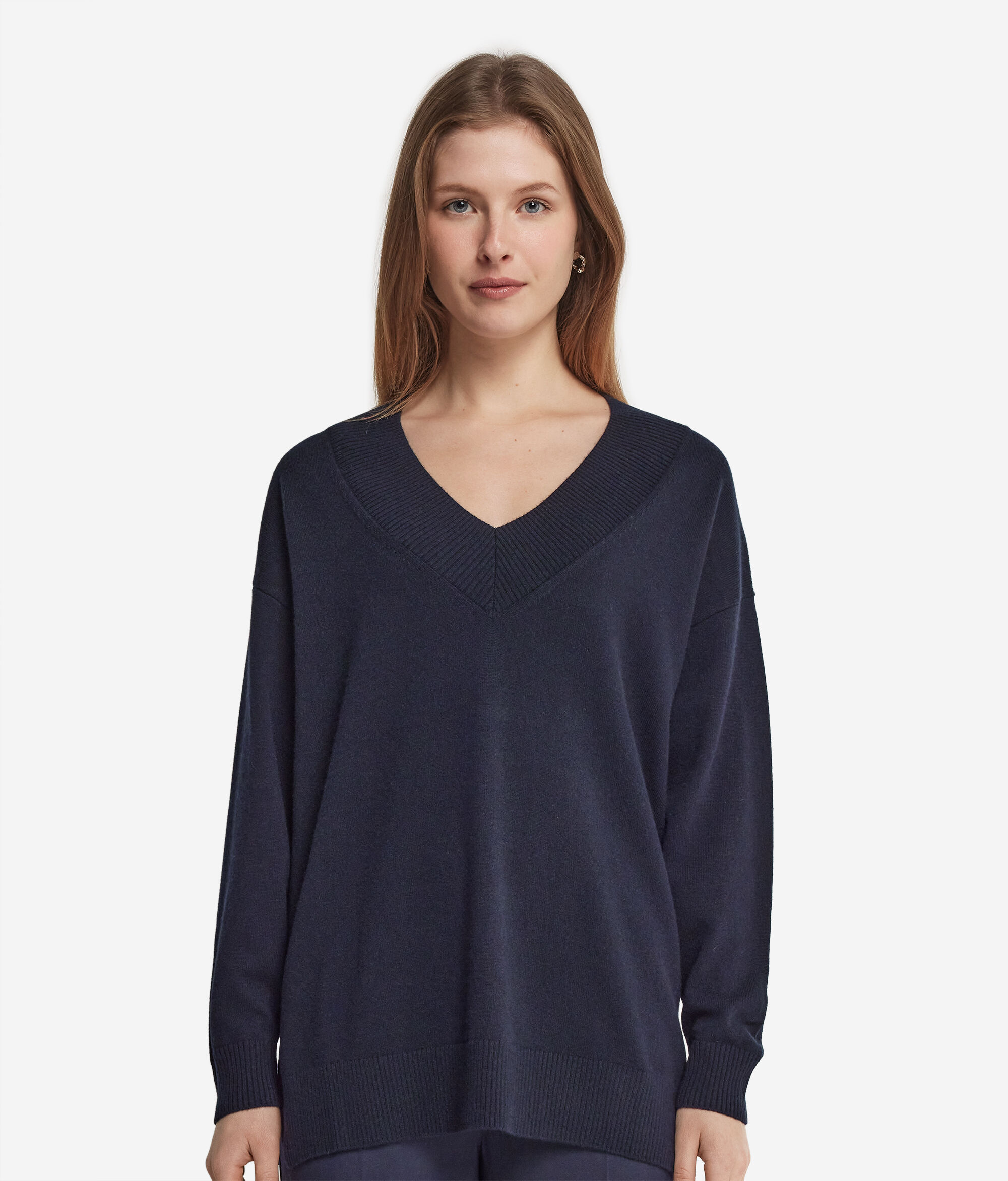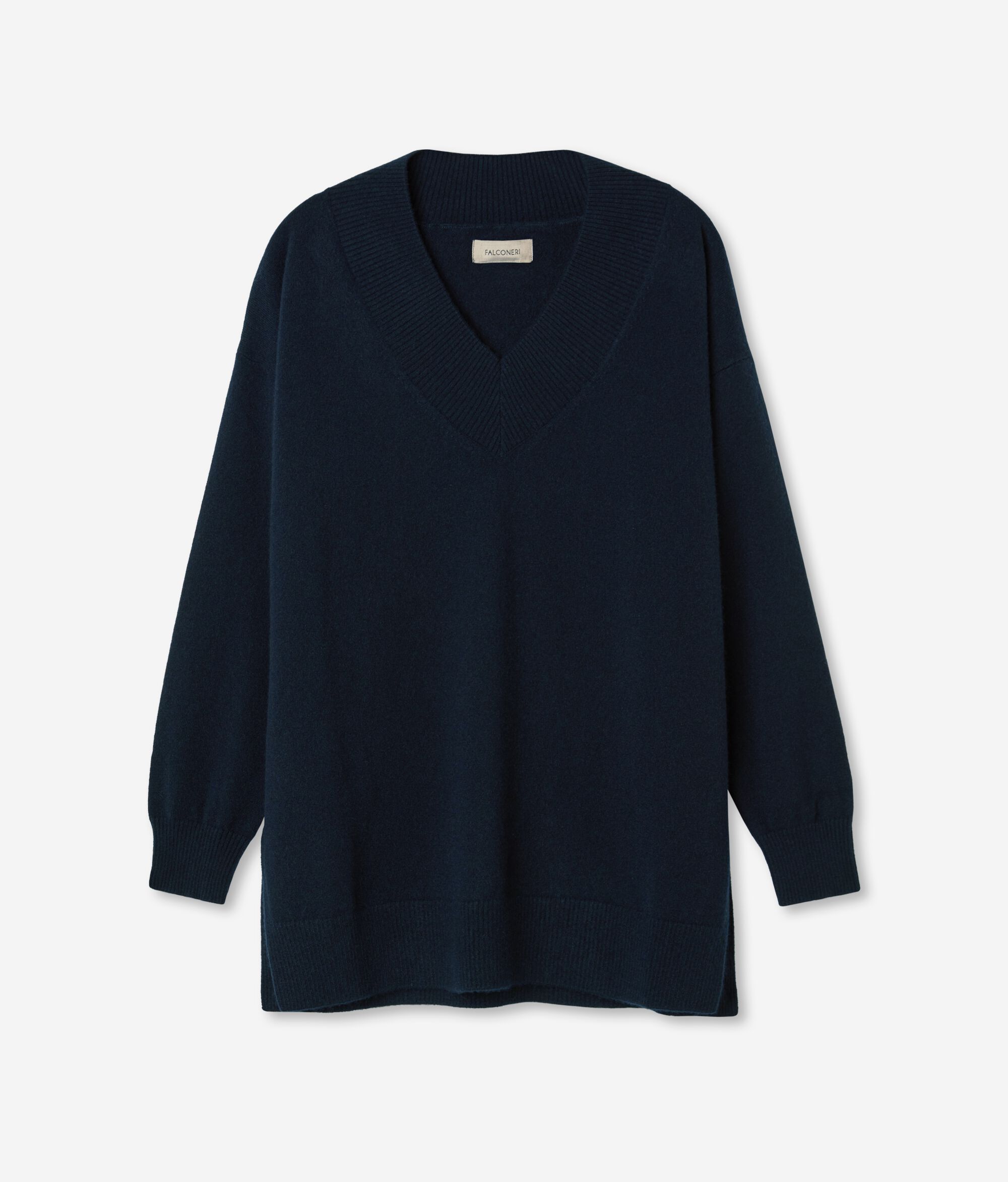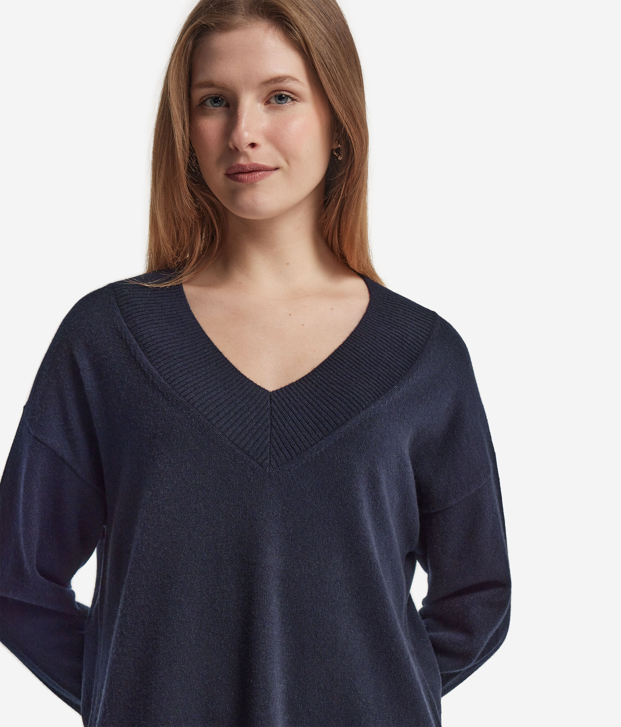 Ultrasoft Cashmere maxi jumper with V-neck. The garment stands out thanks to the ribbing on the neckline, the slightly dropped shoulders and the slits on the hem. Relaxed fit.