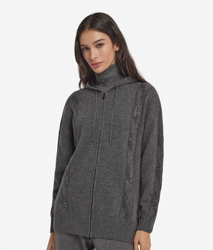 Pullover mit Cut-out aus Kaschmir Ultrasoft mit Zopfmuster und Strass