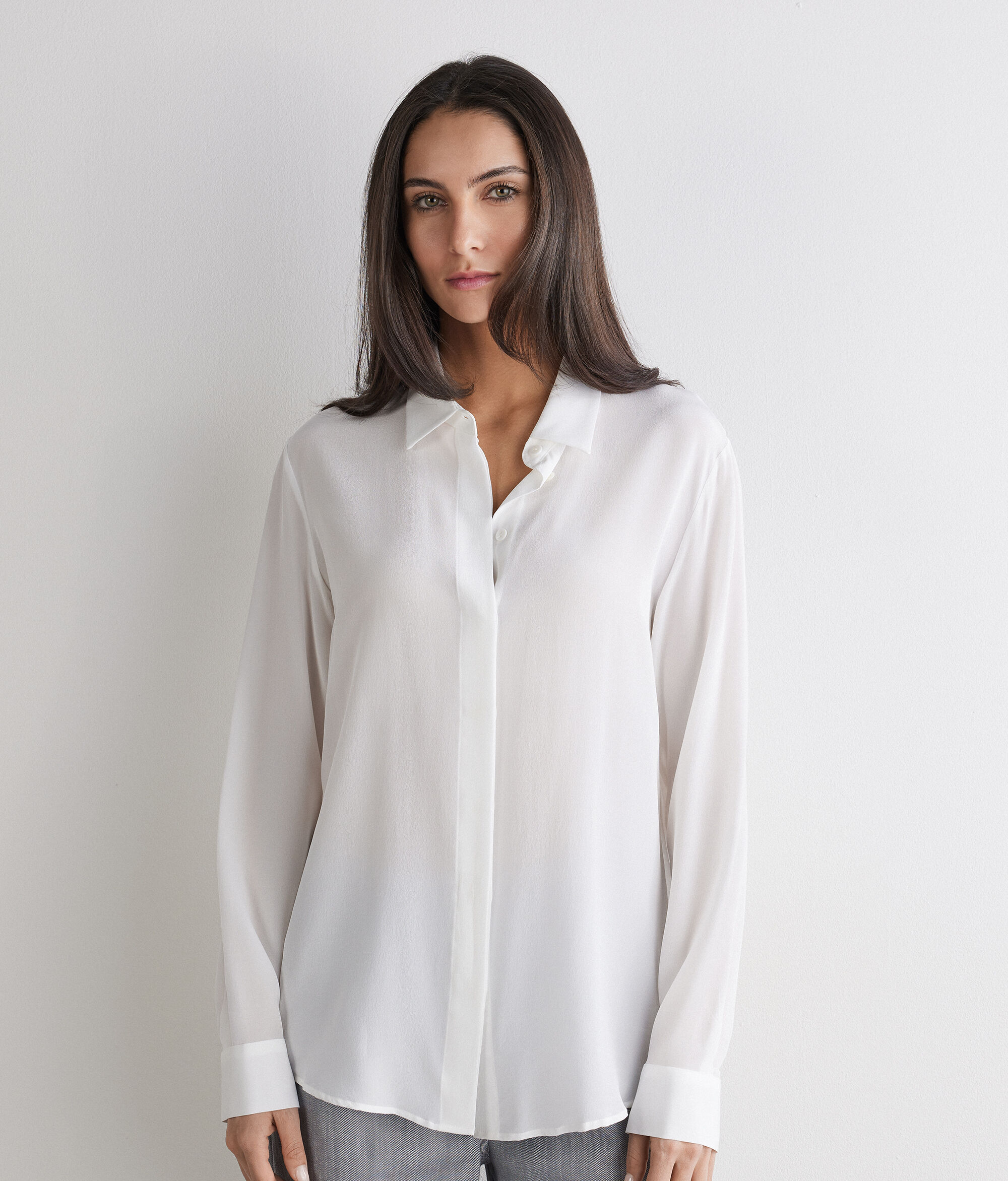 Adoptez l'élégance intemporelle de cette chemise en crêpe de Chine. Ses lignes épurées sont sublimées d'un col classique et d'une fermeture à boutons. Sobre mais raffinée, cette pièce distinguée allie style et qualité, sans aucun compromis.