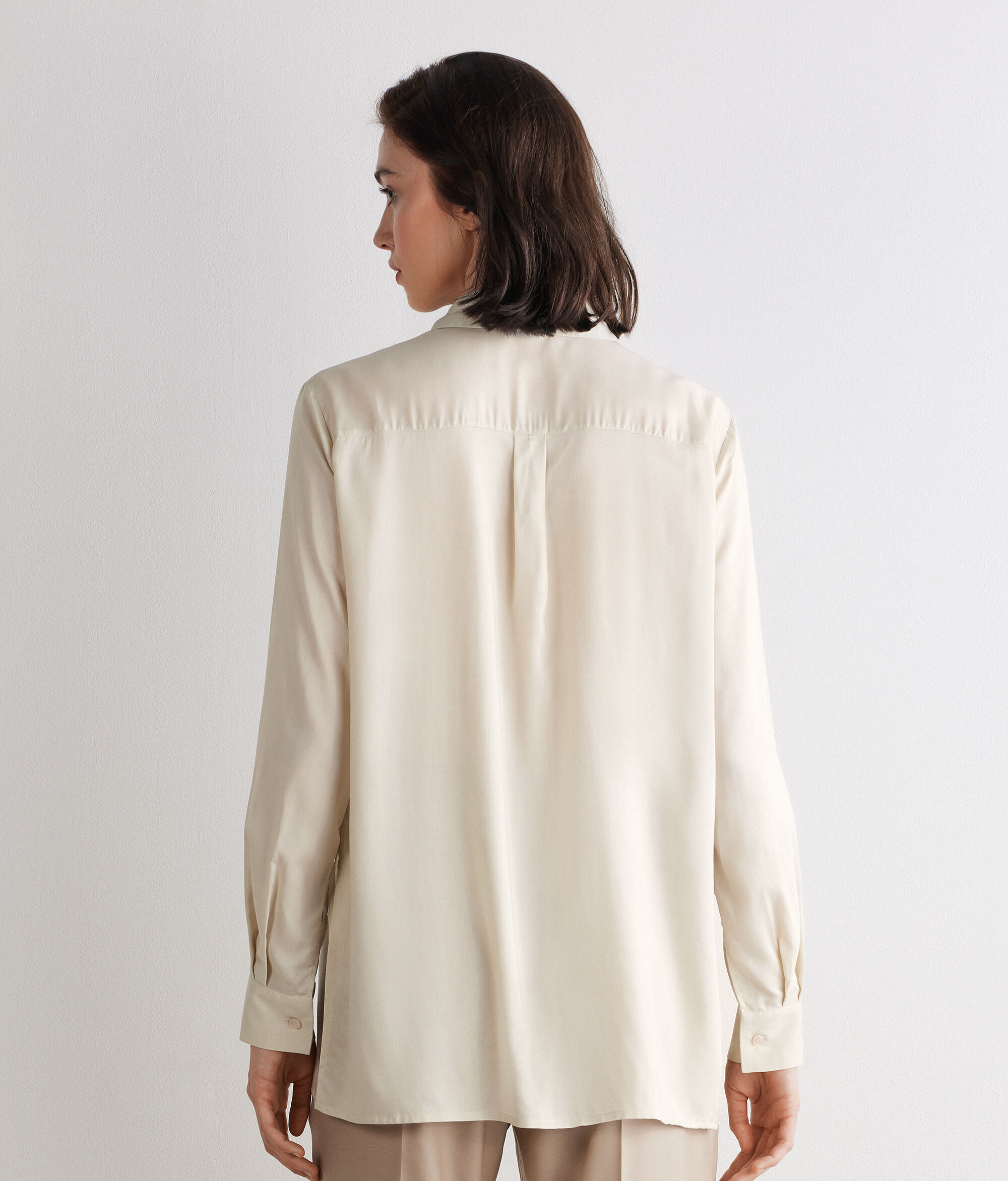Chemise oversize à l'élégance naturelle et contemporaine. Son col évoque un style classique revisité, tandis que des emmanchures légèrement abaissées et une coupe fluide lui insufflent une allure décontractée. Équilibrées par les longues fentes latérales, ses manches bouffantes lui ajoutent une touche de volume féminine.