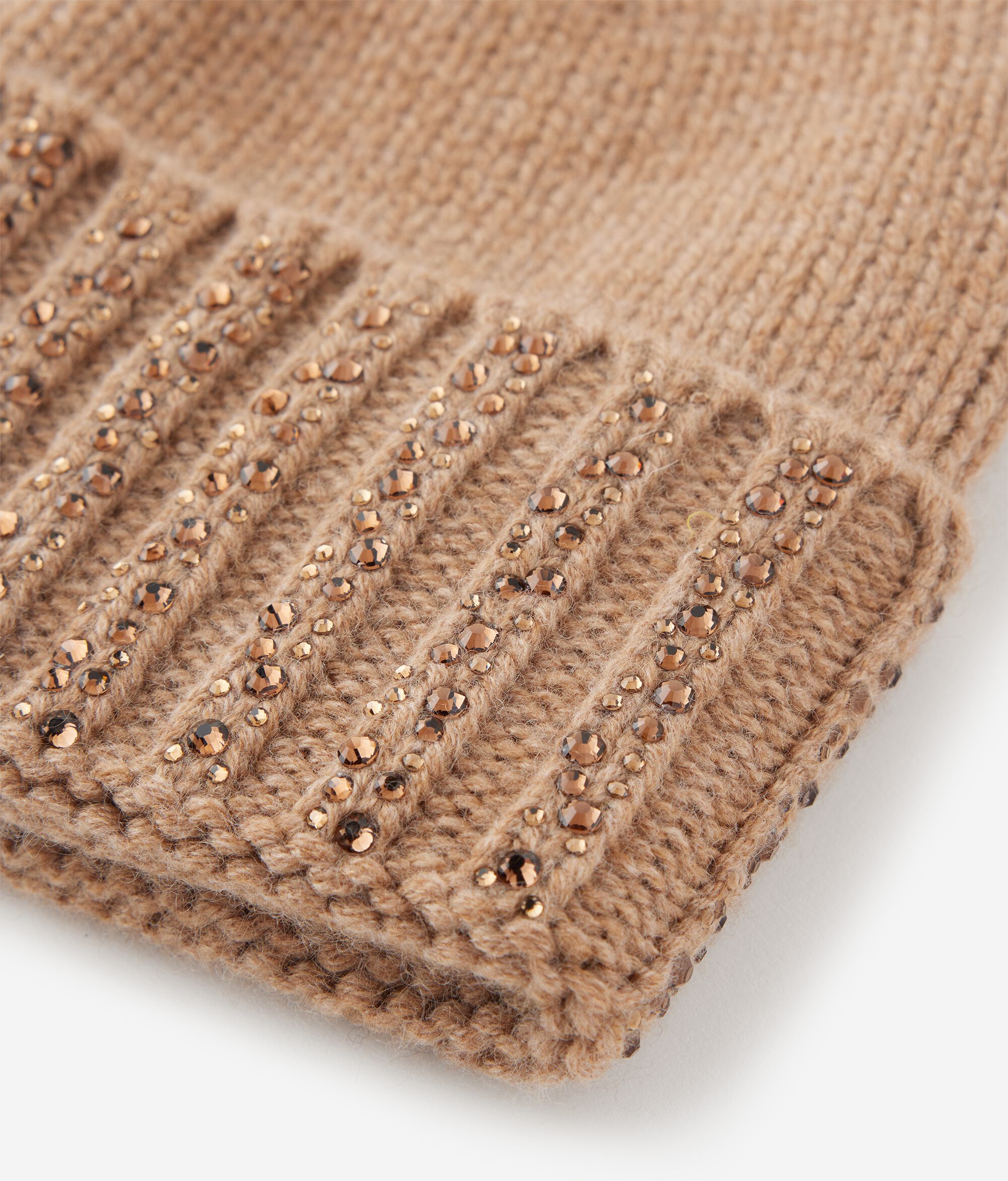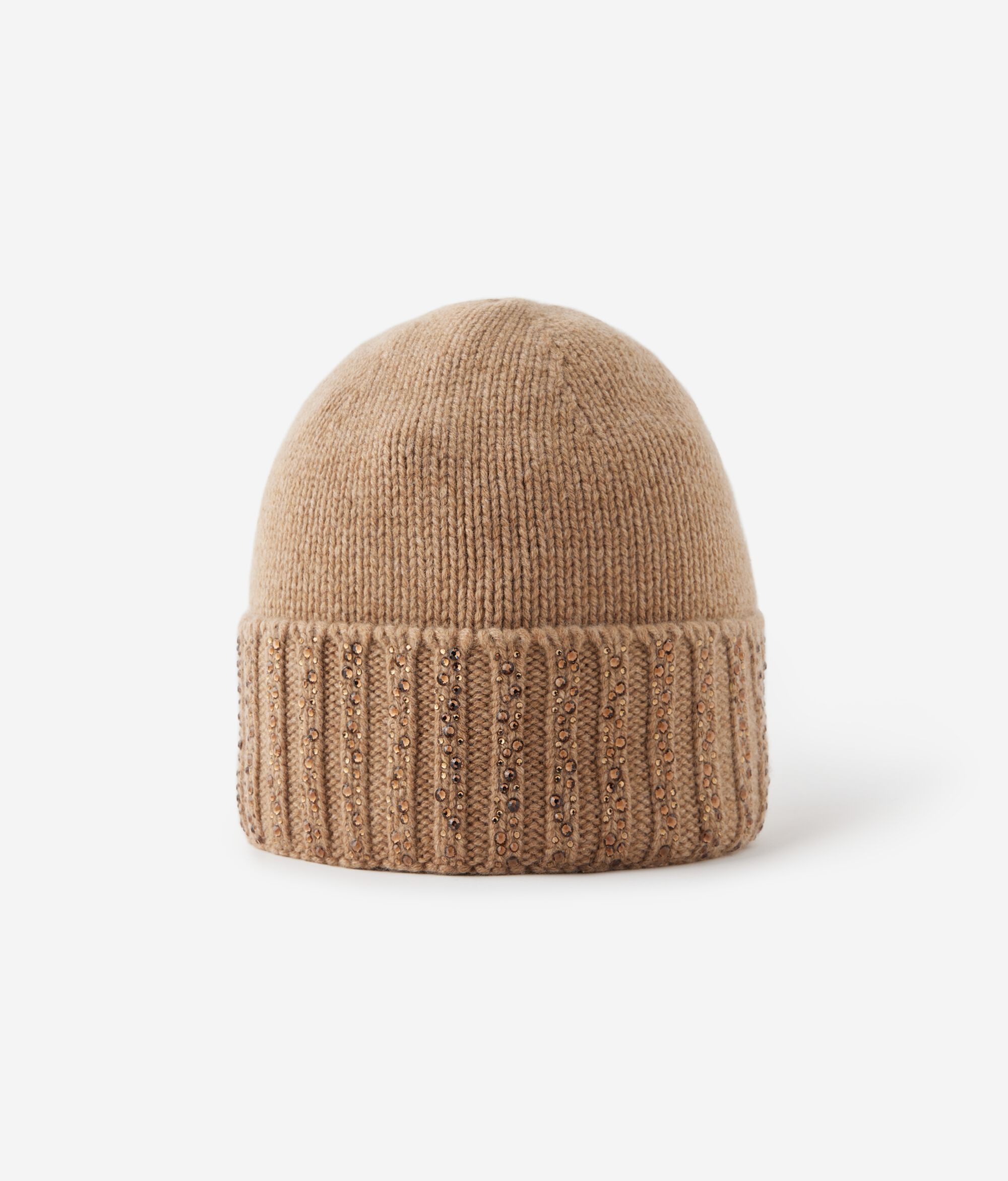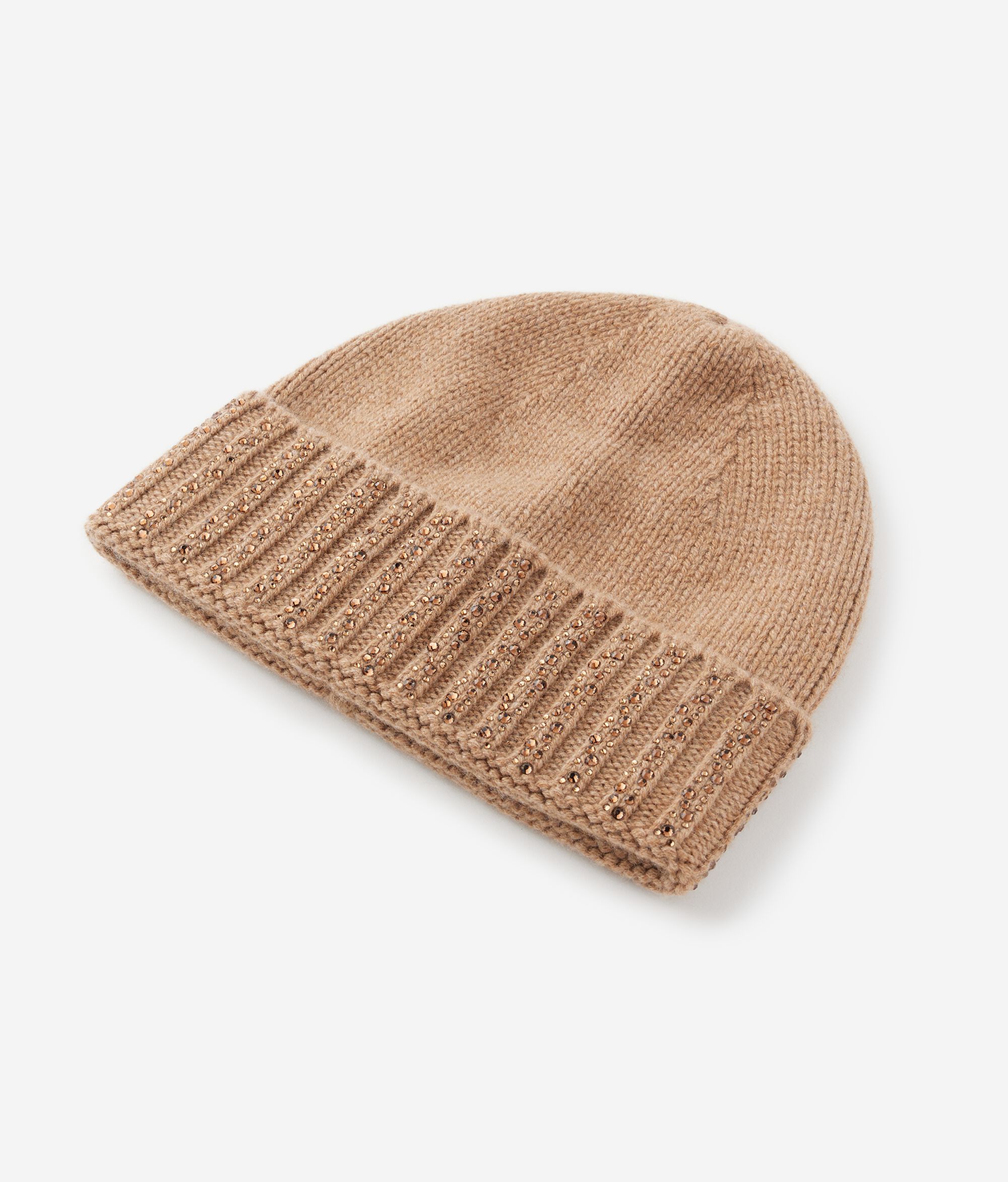 Il pregio del Cashmere Ultrasoft caratterizza questo cappello che avvolge la testa in un abbraccio caldo e leggero. Il bordo in costina aggiunge un tocco di raffinatezza, mentre gli strass incastonati creano un delicato gioco di luci, catturando l'attenzione senza risultare eccessivi. Un vero elemento di stile, ideale per completare i tuoi look in modo chic e sofisticato.