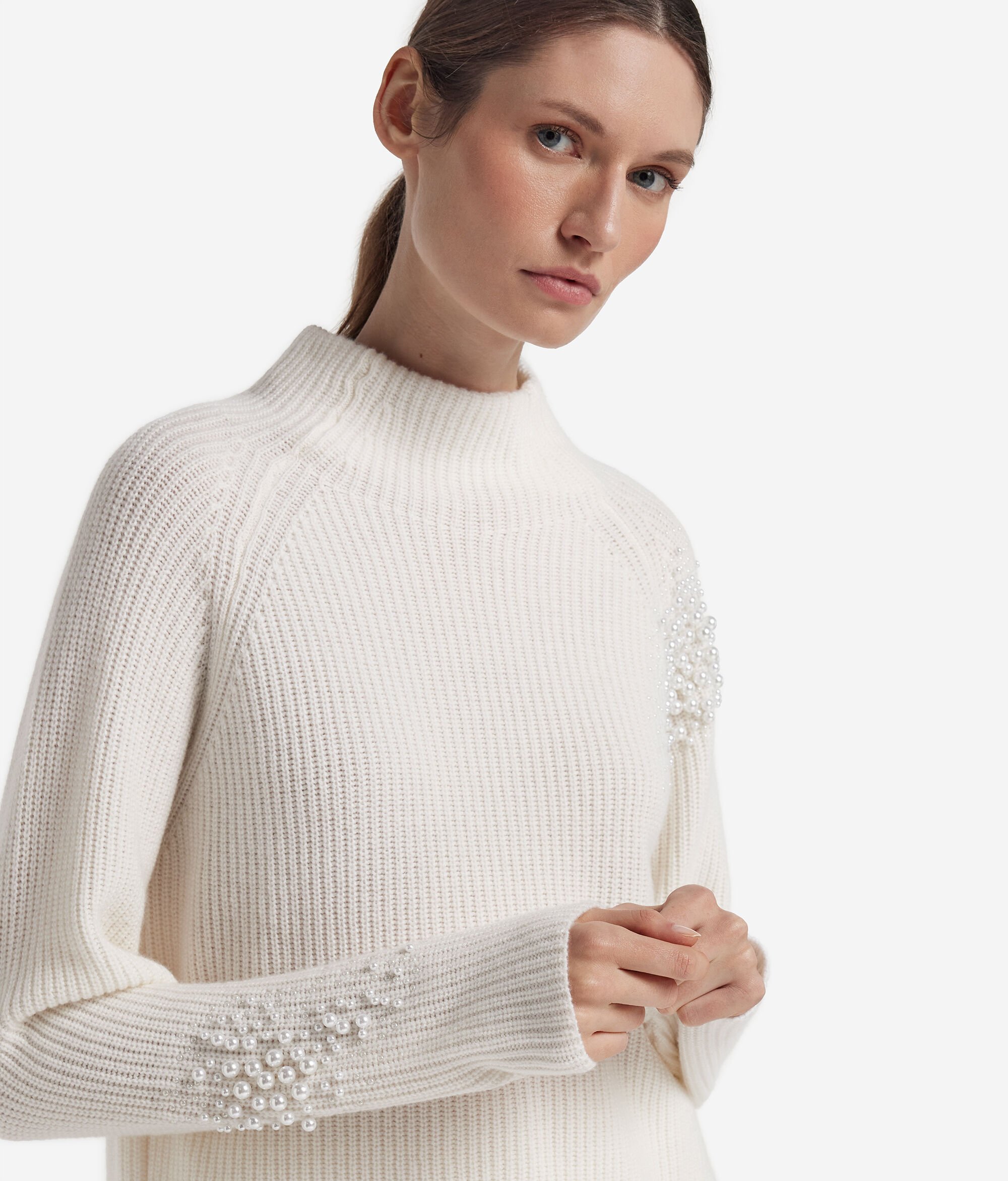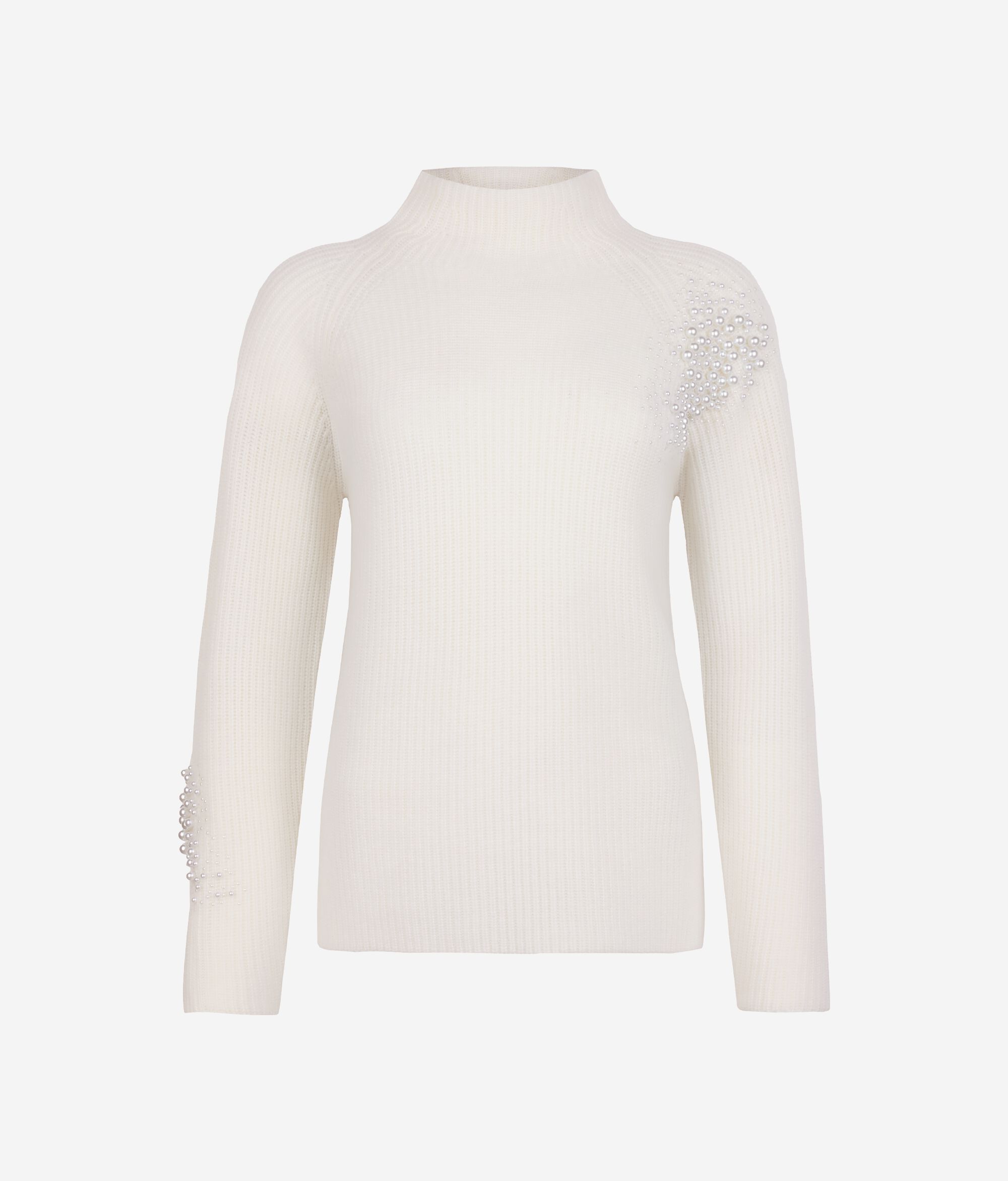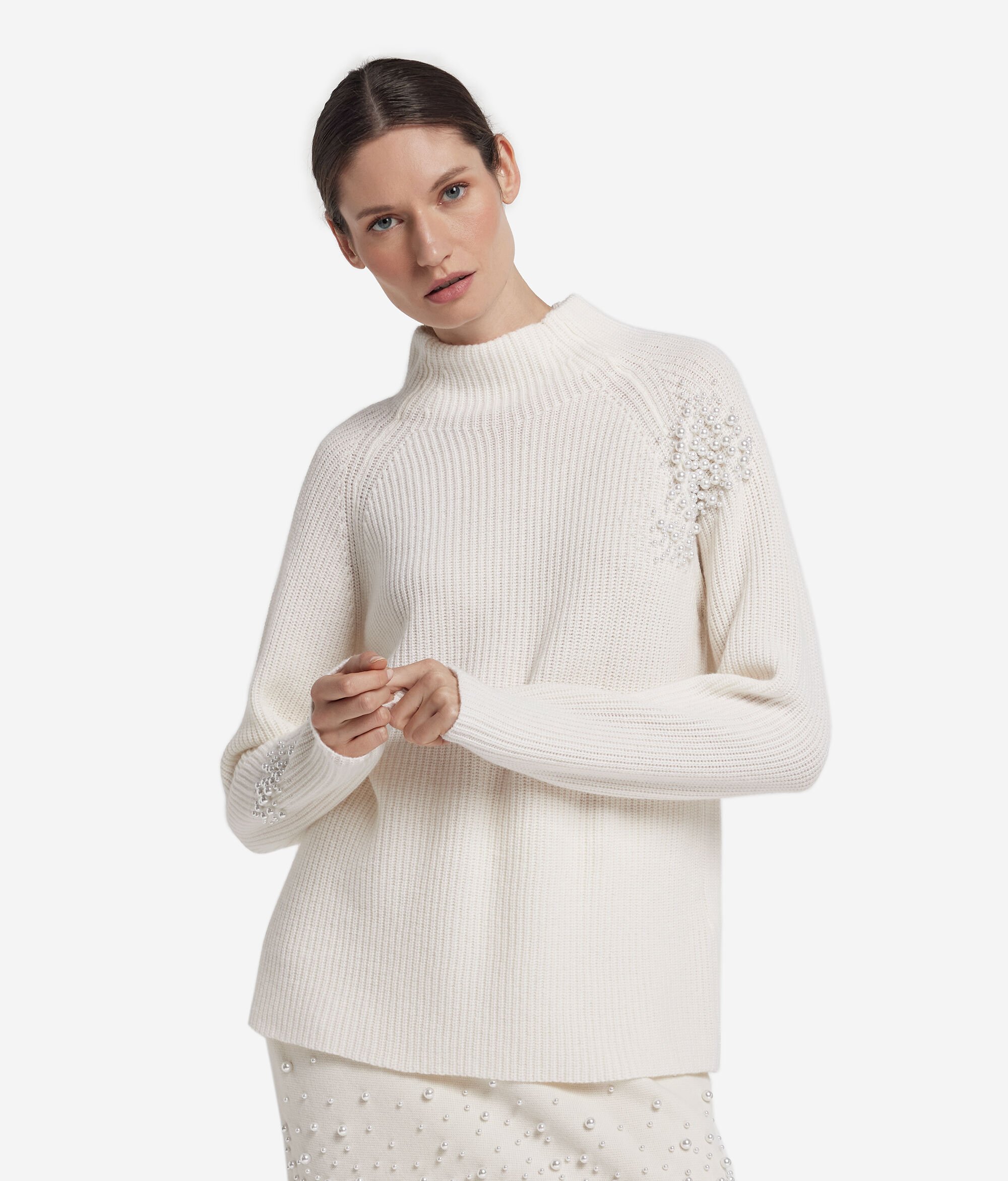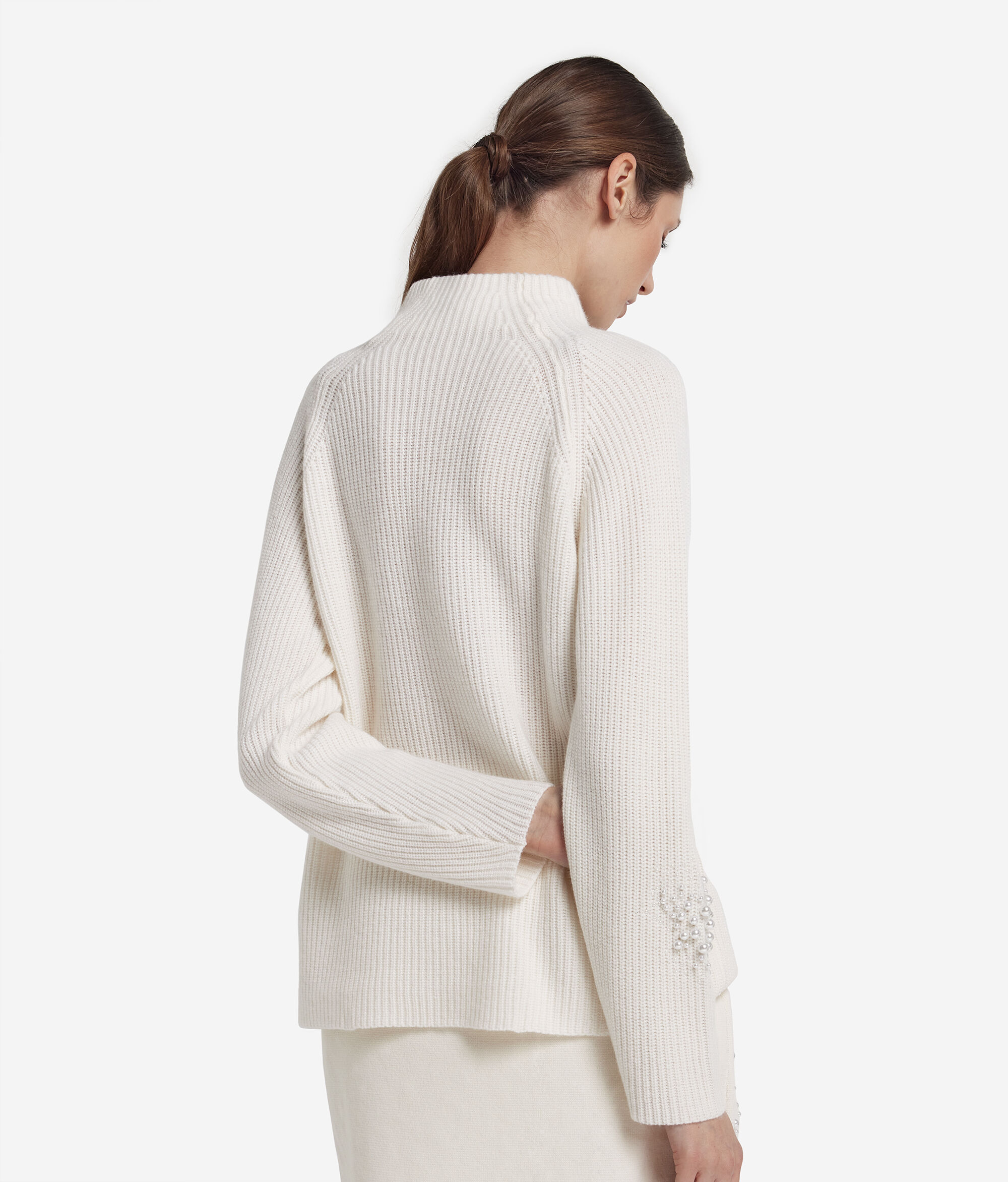 Morbido e sofisticato, questo dolcevita in Cashmere Ultrasoft unisce eleganza quotidiana e dettagli preziosi. Il collo alto avvolge con delicatezza, mentre le perle sul davanti donano un tocco luminoso e femminile. Le linee pulite e le finiture a coste definiscono la silhouette con naturale eleganza, mentre la vestibilità regolare lo rende perfetto da solo o come base per un layering in cashmere.