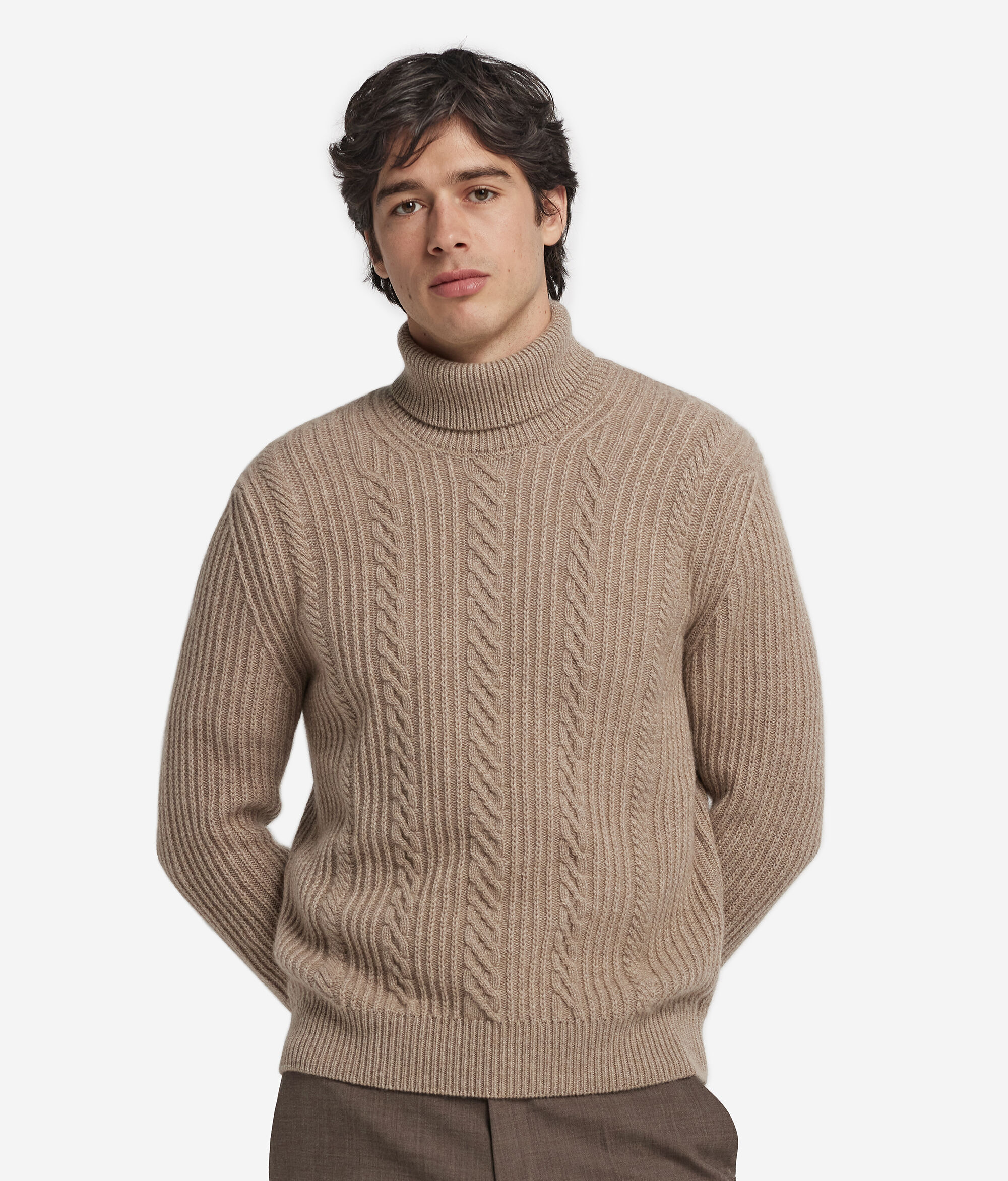 Un classico rivisitato in chiave contemporanea: questa maglia dolcevita in Cashmere Ultrasoft non tinto unisce morbidezza e raffinatezza. La maglia rasata, arricchita da un delicato motivo a trecce, incontra il collo a coste per un effetto elegante e avvolgente. Dal carattere sobrio e sofisticato, è un capo versatile, perfetto per accompagnare ogni look con stile senza tempo.