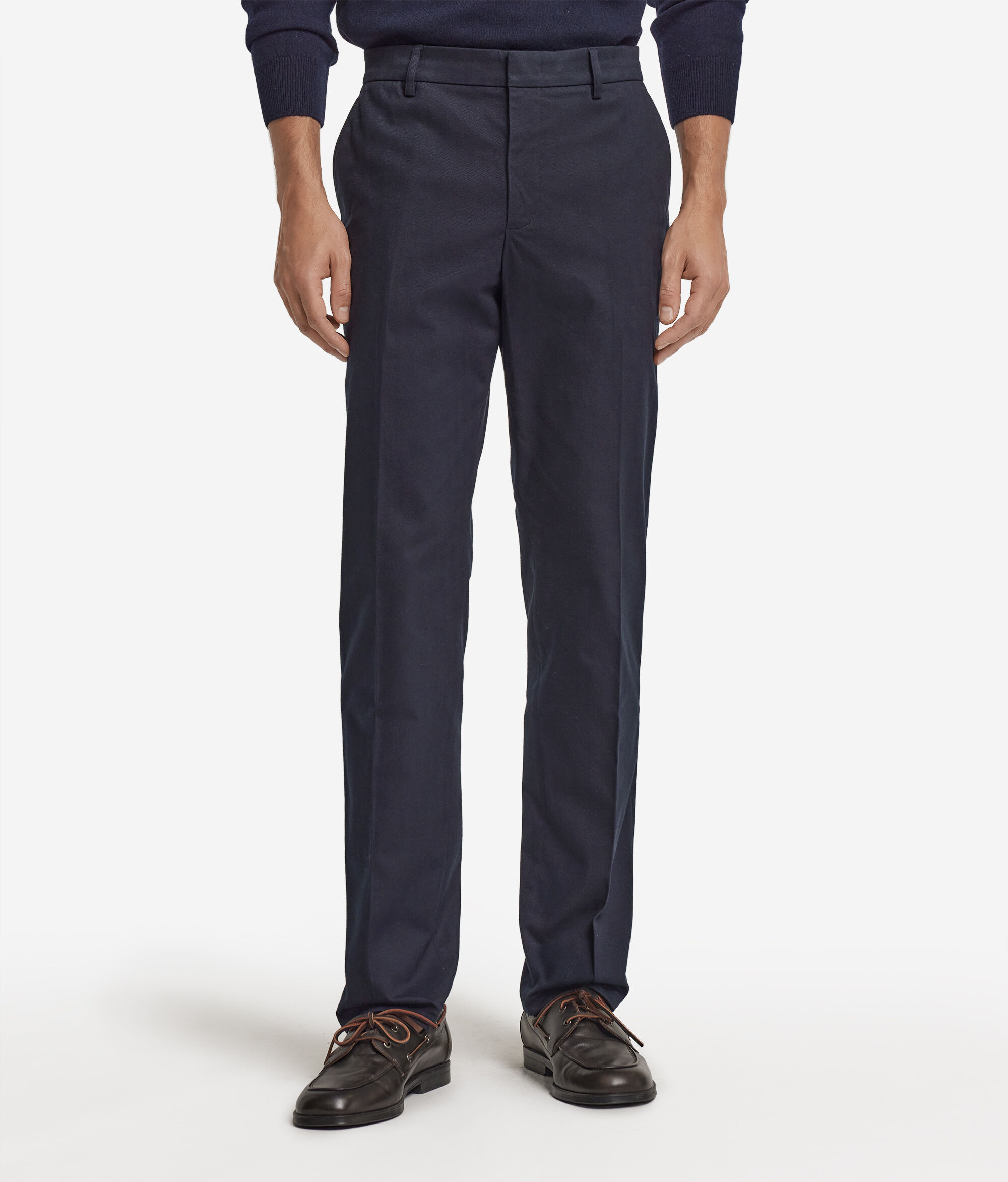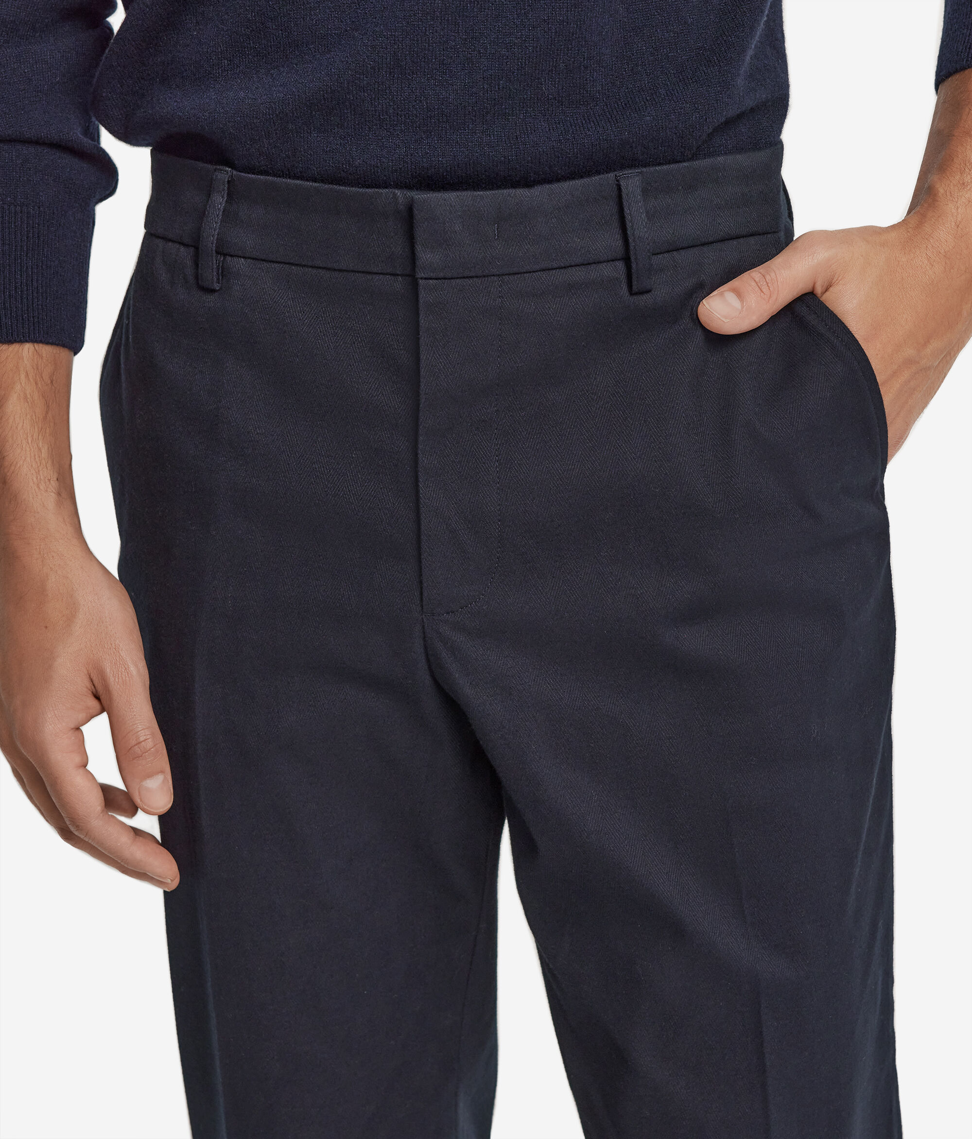 Realizzato in tessuto spinato di cotone e cashmere, questo pantalone chino, unisce morbidezza e profondità materica. Il design è arricchito da dettagli di ispirazione sartoriale come le tasche all’americana, quelle posteriori a doppio filetto con bottone e il cinturino con passanti. La vestibilità regolare traccia linee equilibrate, garantendo agio ed eleganza in ogni occasione, trasformando un capo quotidiano in un essenziale ricercato.