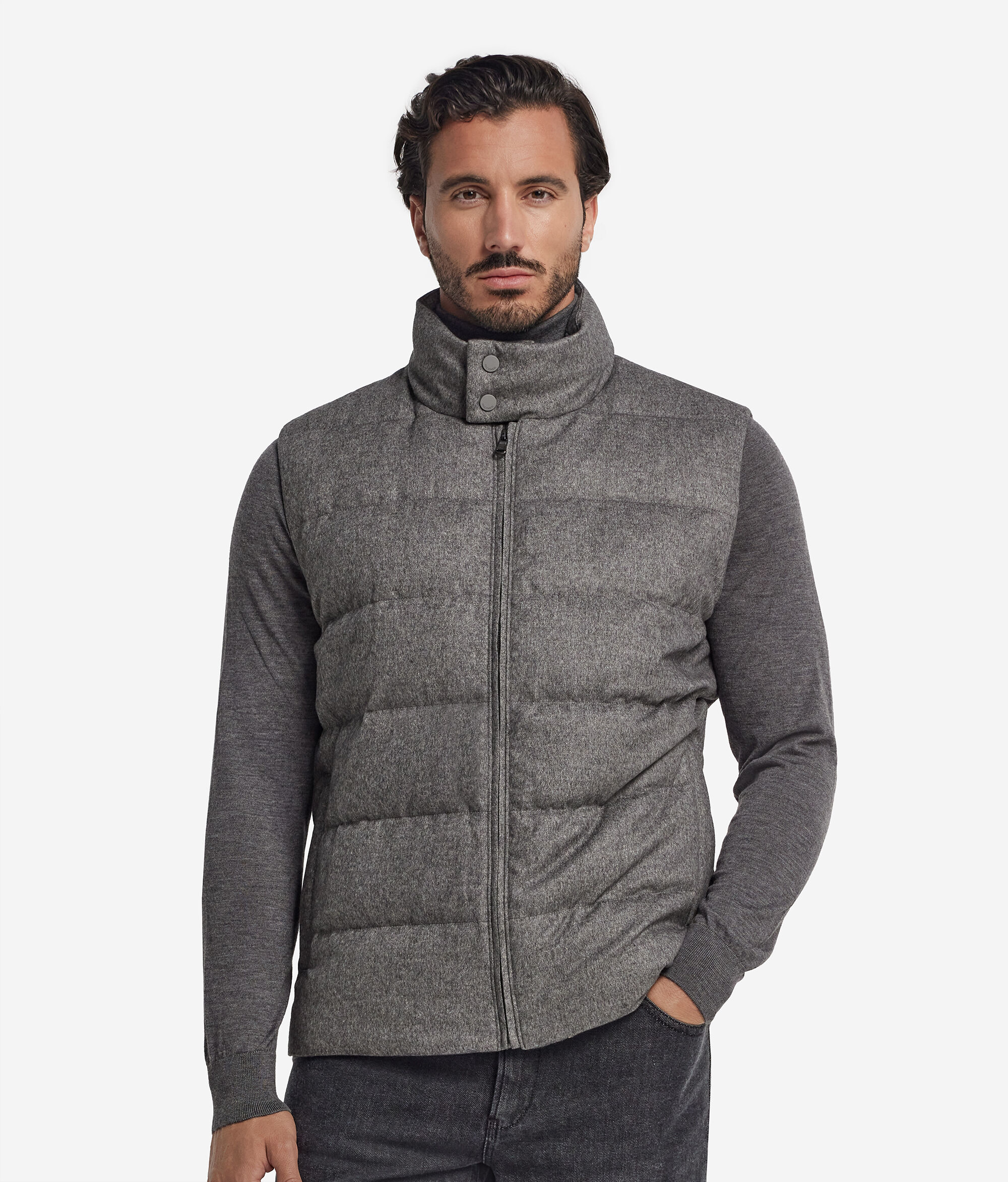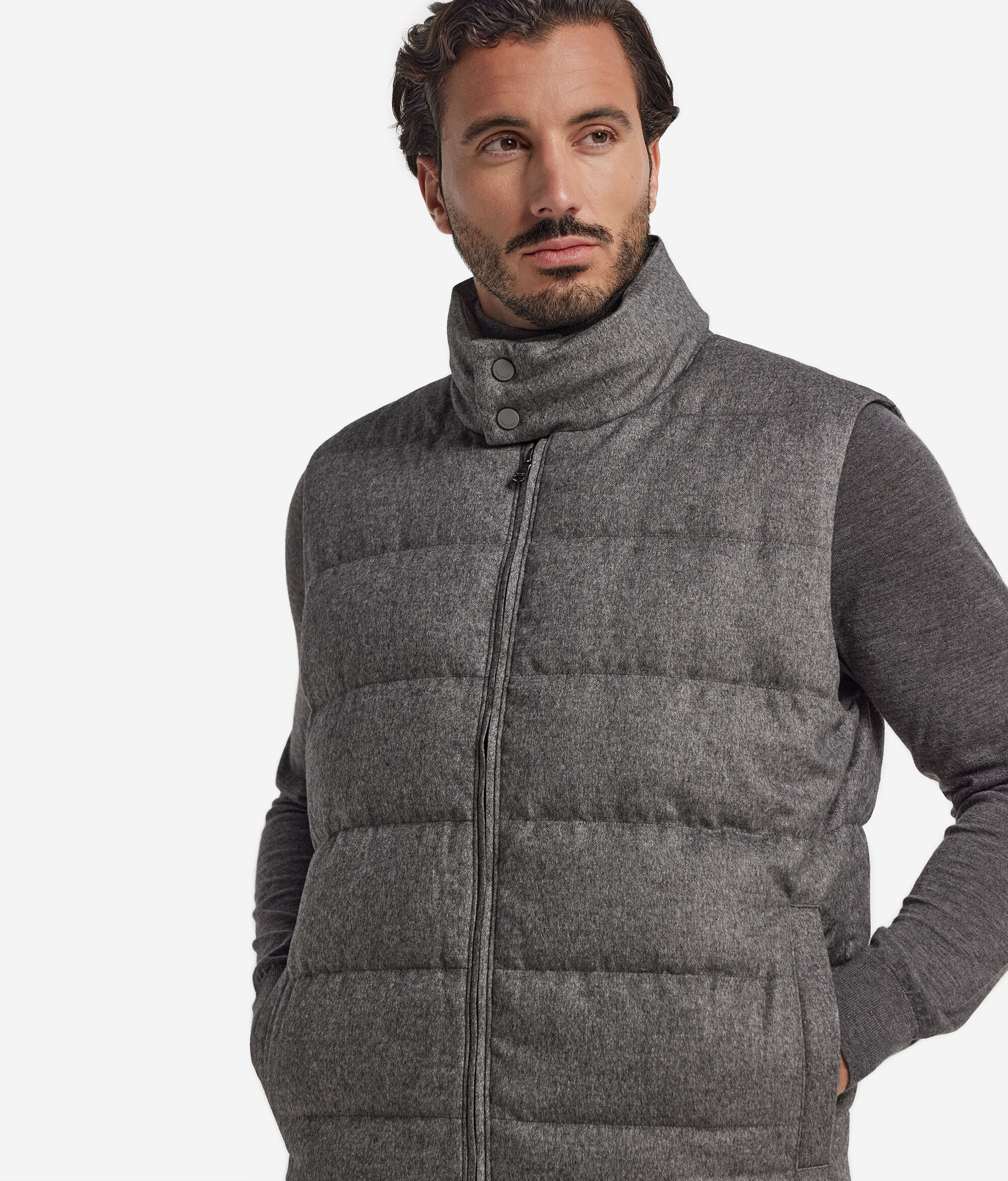 Ricercatezza e funzionalità si incontrano in questo piumino smanicato realizzato in un pregiato mix di seta e cashmere. Il collo alto è impreziosito da una chiusura a bottoni e da un interno in maglia di Cashmere Ultrasoft a coste. Dotato di zip frontale, tasche a filetto e vestibilità regolare, rappresenta un capo ideale per le mezze stagioni.
