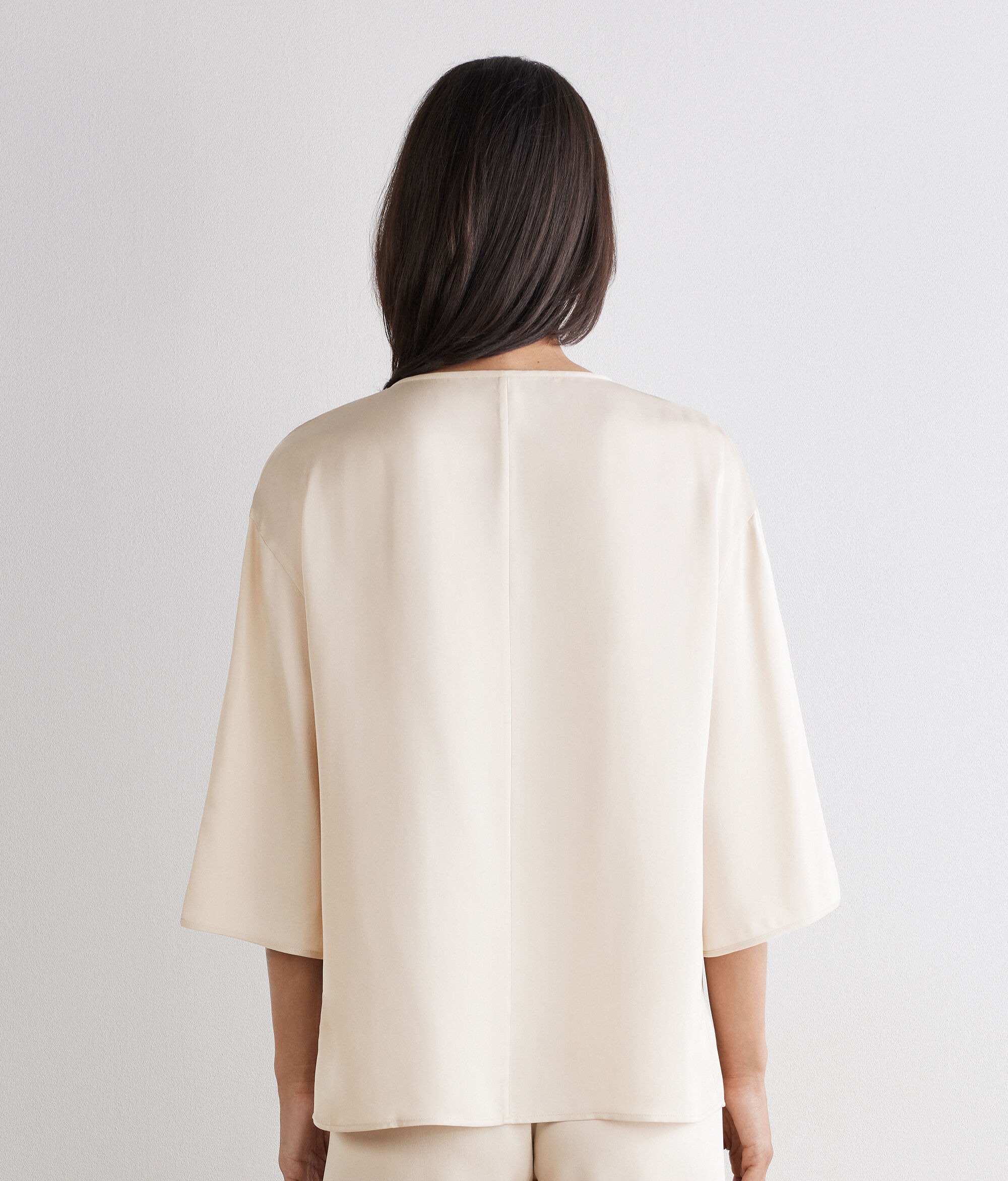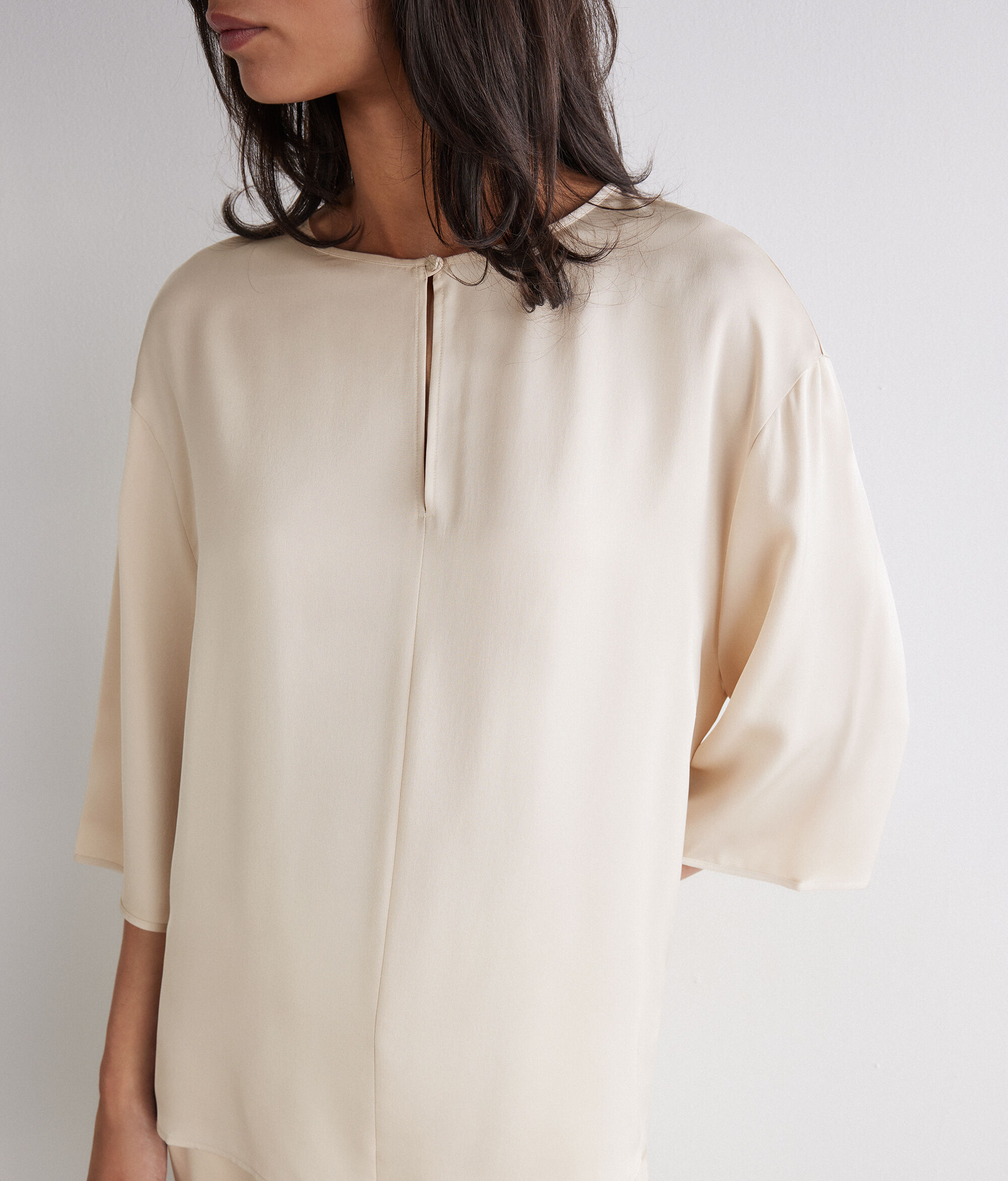 Diese Bluse aus mattem Seidensatin vereint Weiblichkeit und Leichtigkeit in einem zeitlosen Design. Der Rundhalsausschnitt mit tropfenförmigem Cut-out mit Metallknopf an der Vorderseite stellt ein besonderes Detail dar, während die lockere Passform eine fließende, natürliche Linie garantiert.