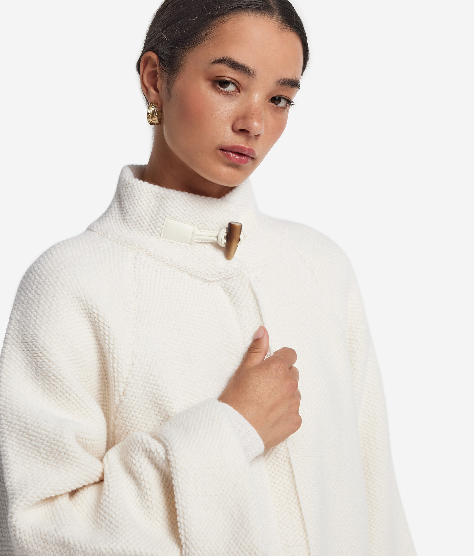 • Reißverschluss und Knebelknopf am Hals