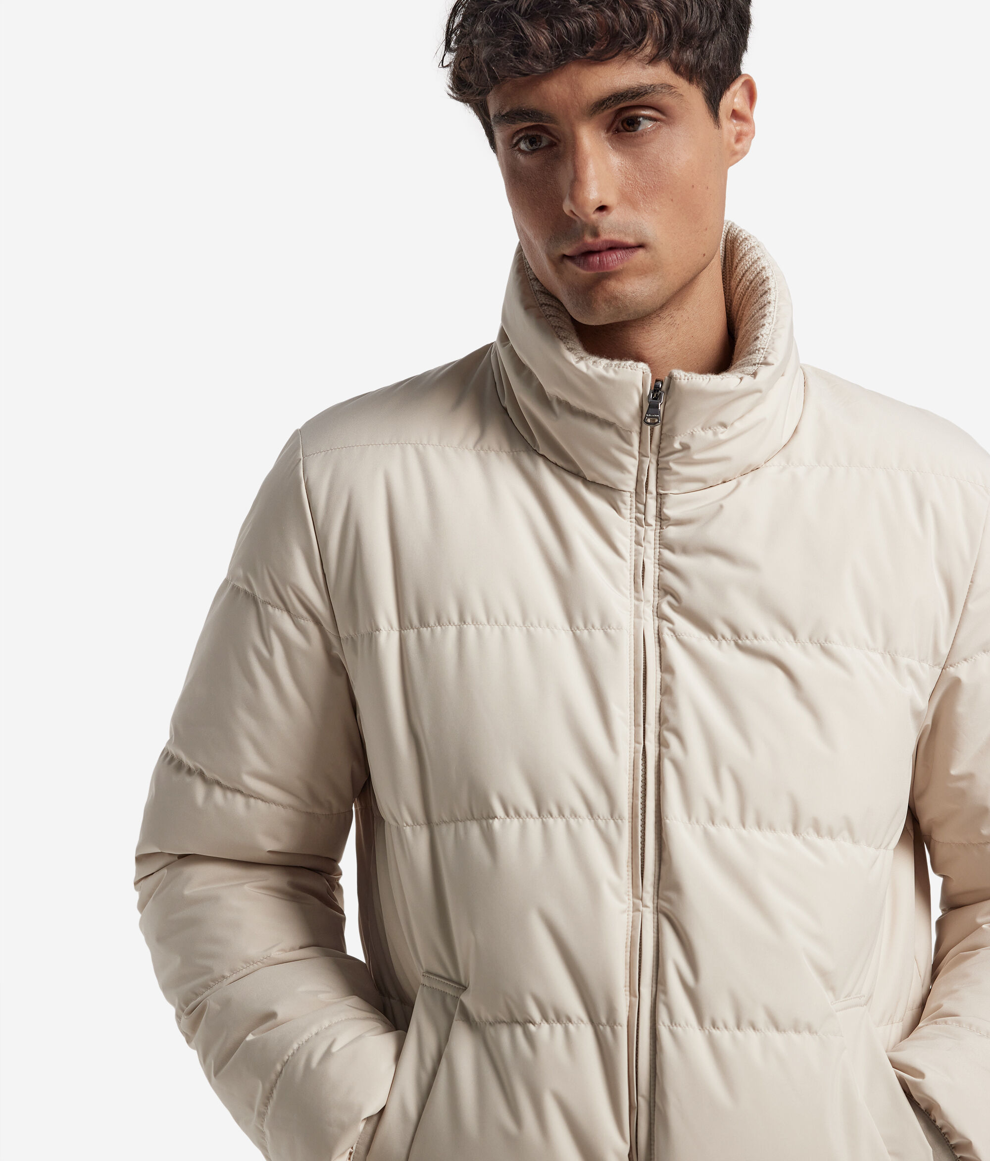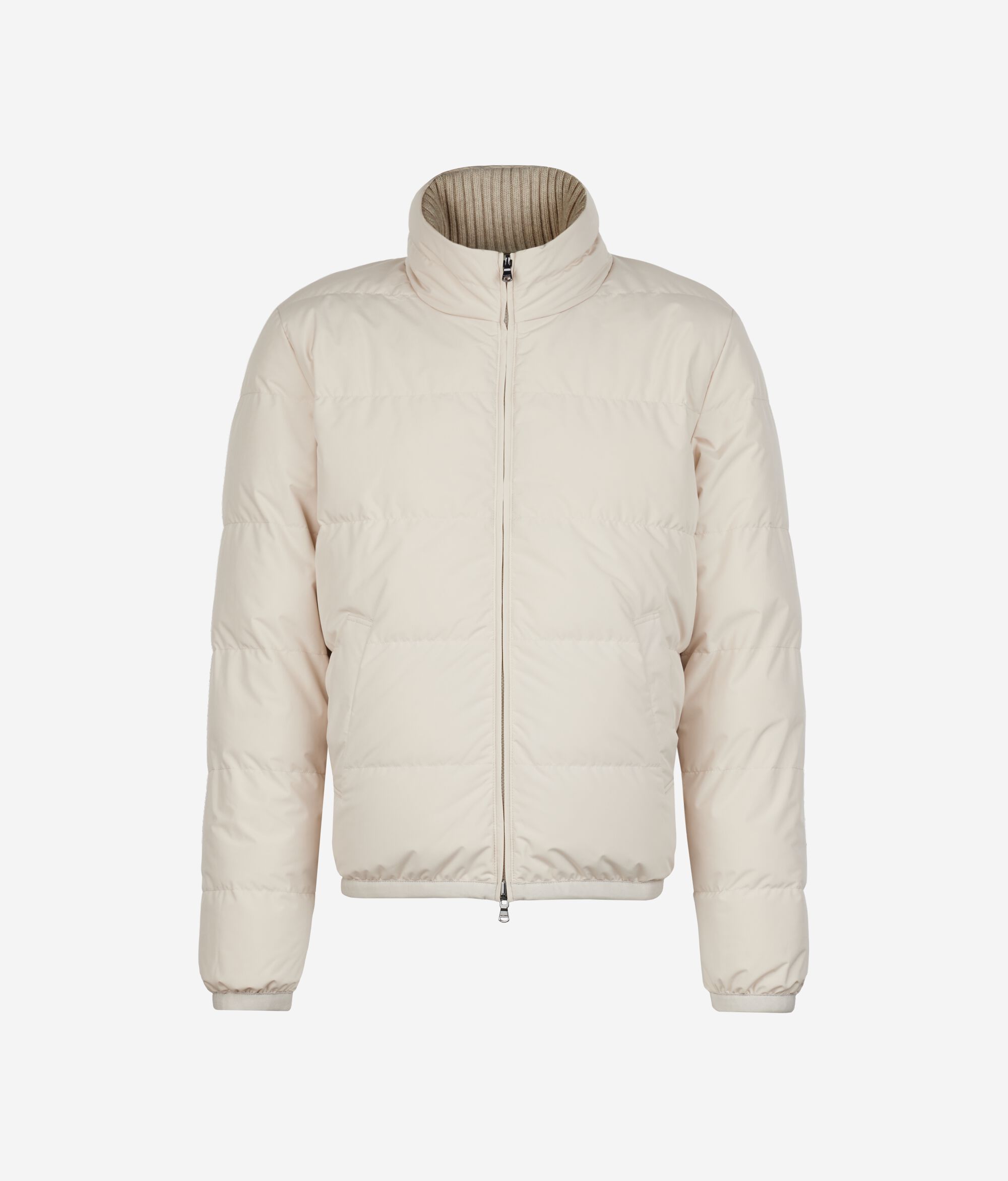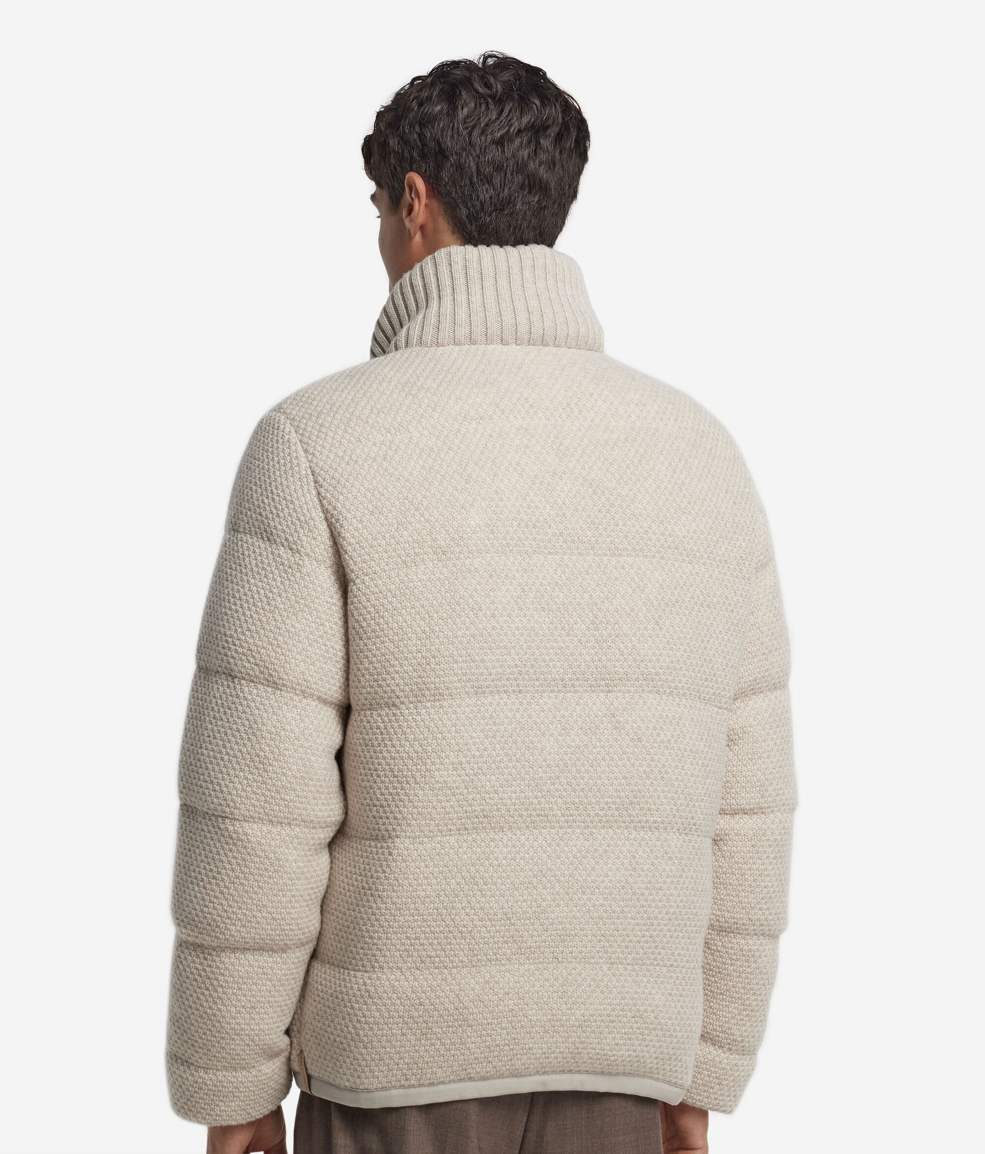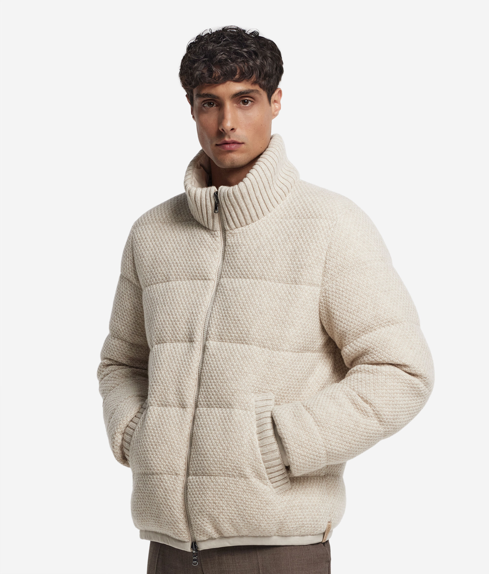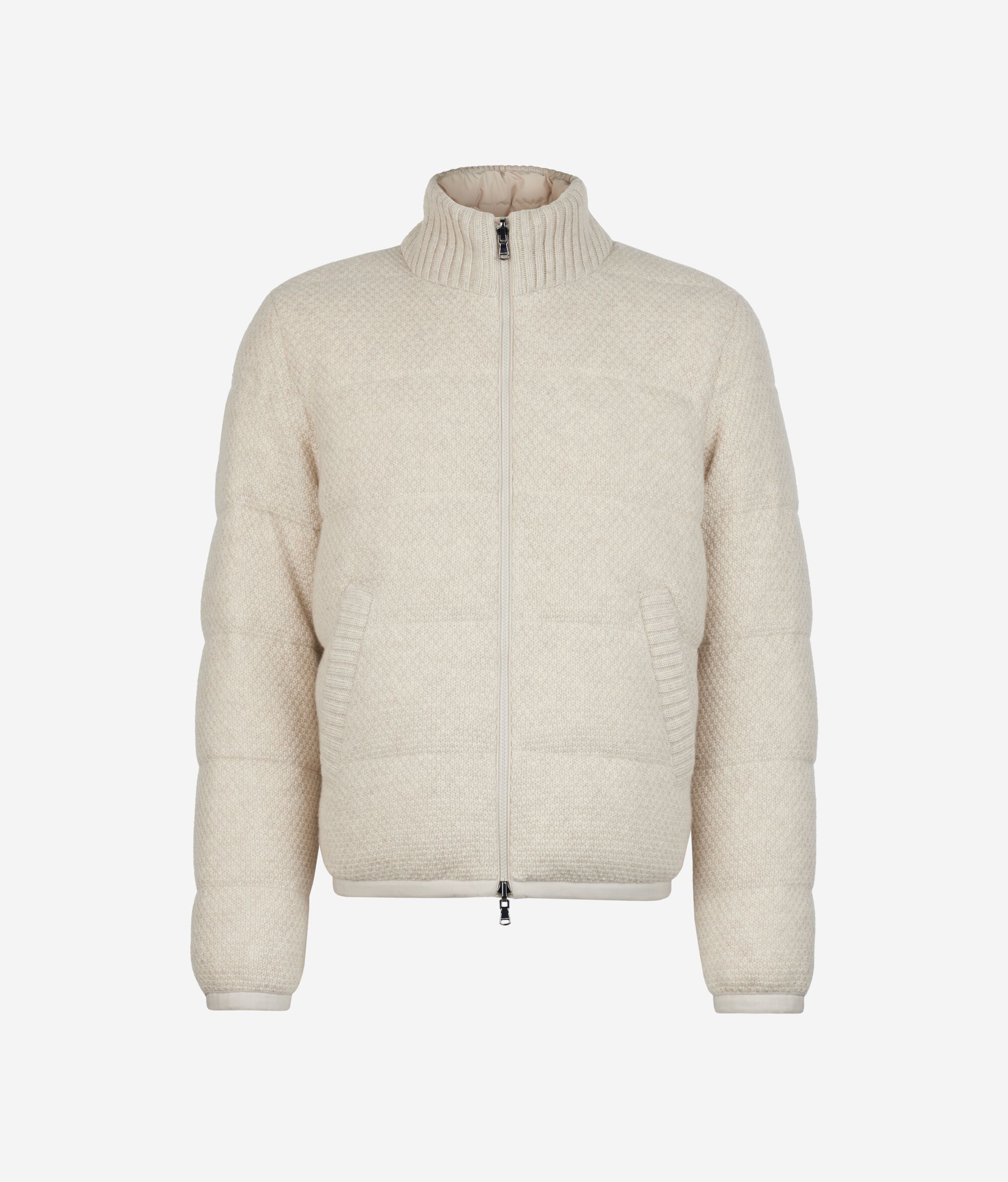 Dieses Kleidungsstück vereint luxuriöse Materialien und moderne Vielseitigkeit. Diese wendbare Daunenjacke aus Kaschmir Ultrasoft und Wolle mit Innenfutter aus Funktionsgewebe garantiert Wärme und Schutz. Mit ihrer Außenseite mit Korbstrickmuster bietet sie zwei unterschiedliche Looks, während der gerippte hohe Kragen, die Paspeltaschen und der Reißverschluss geschneiderte Eleganz und Alltagstauglichkeit kombinieren. Die weich fallende Passform macht das Modell komplett und verwandelt es in ein vielseitiges und unverwechselbares Kleidungsstück; perfekt, um besonders kalten Tagen mit Stil und Komfort zu begegnen.