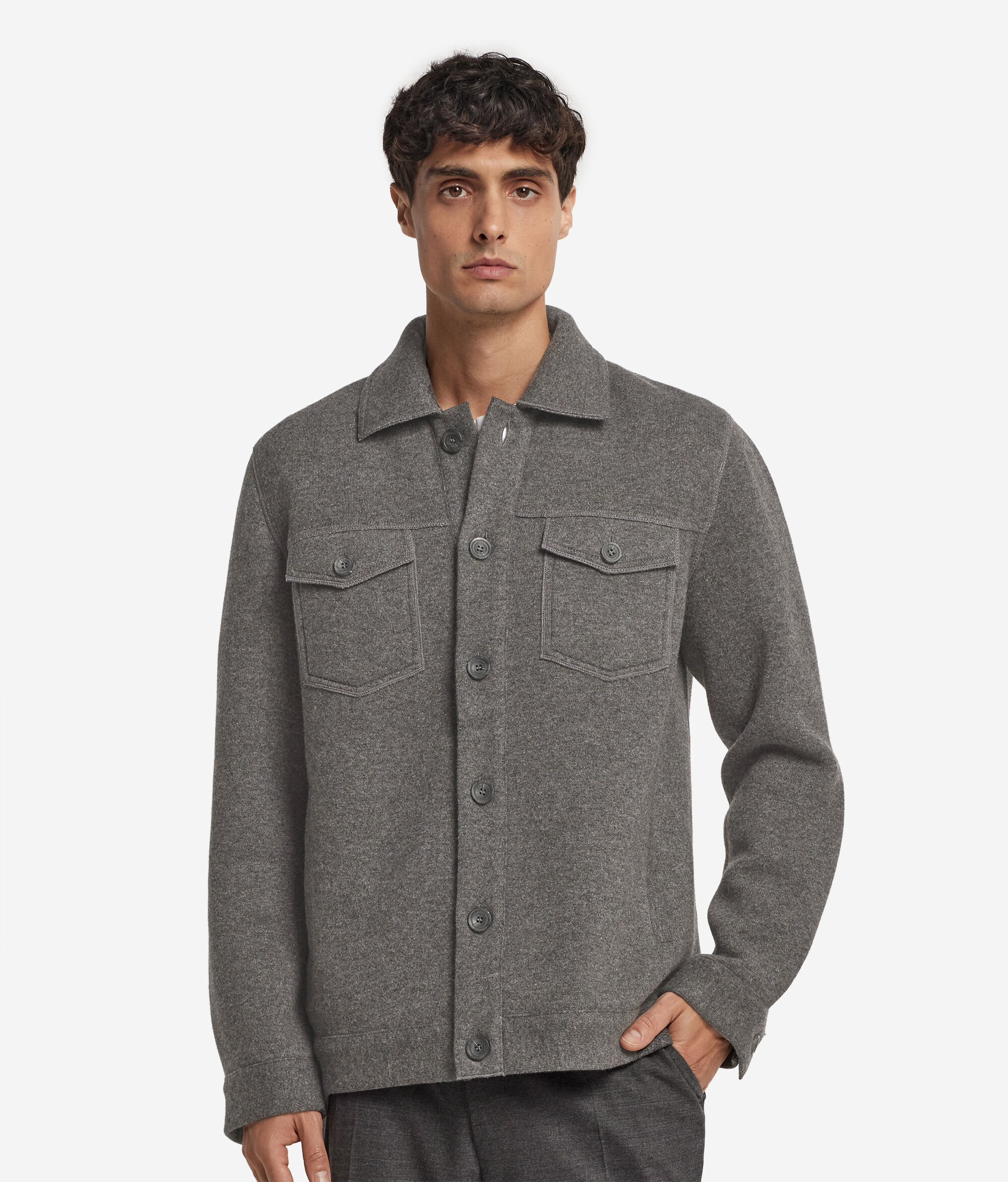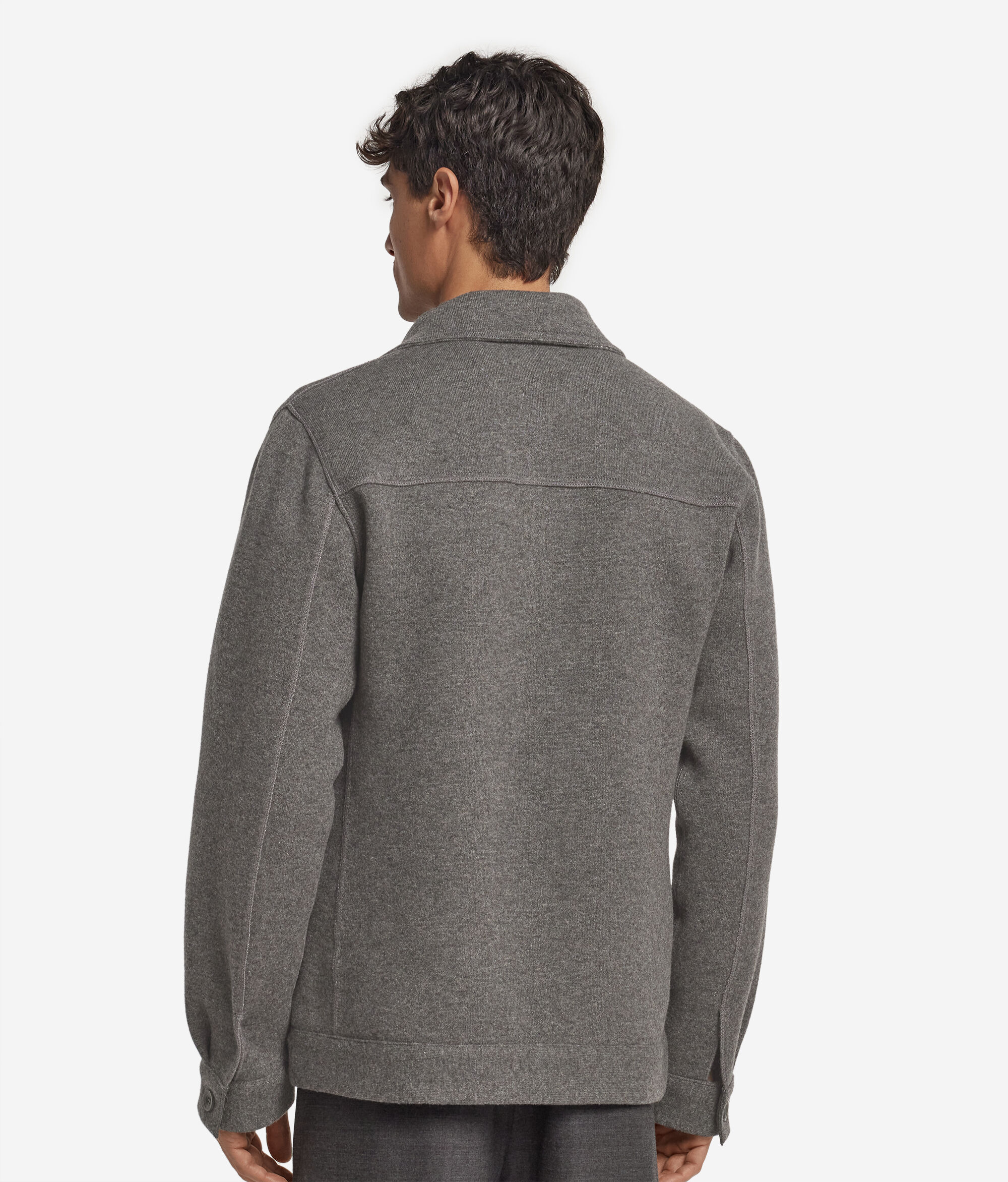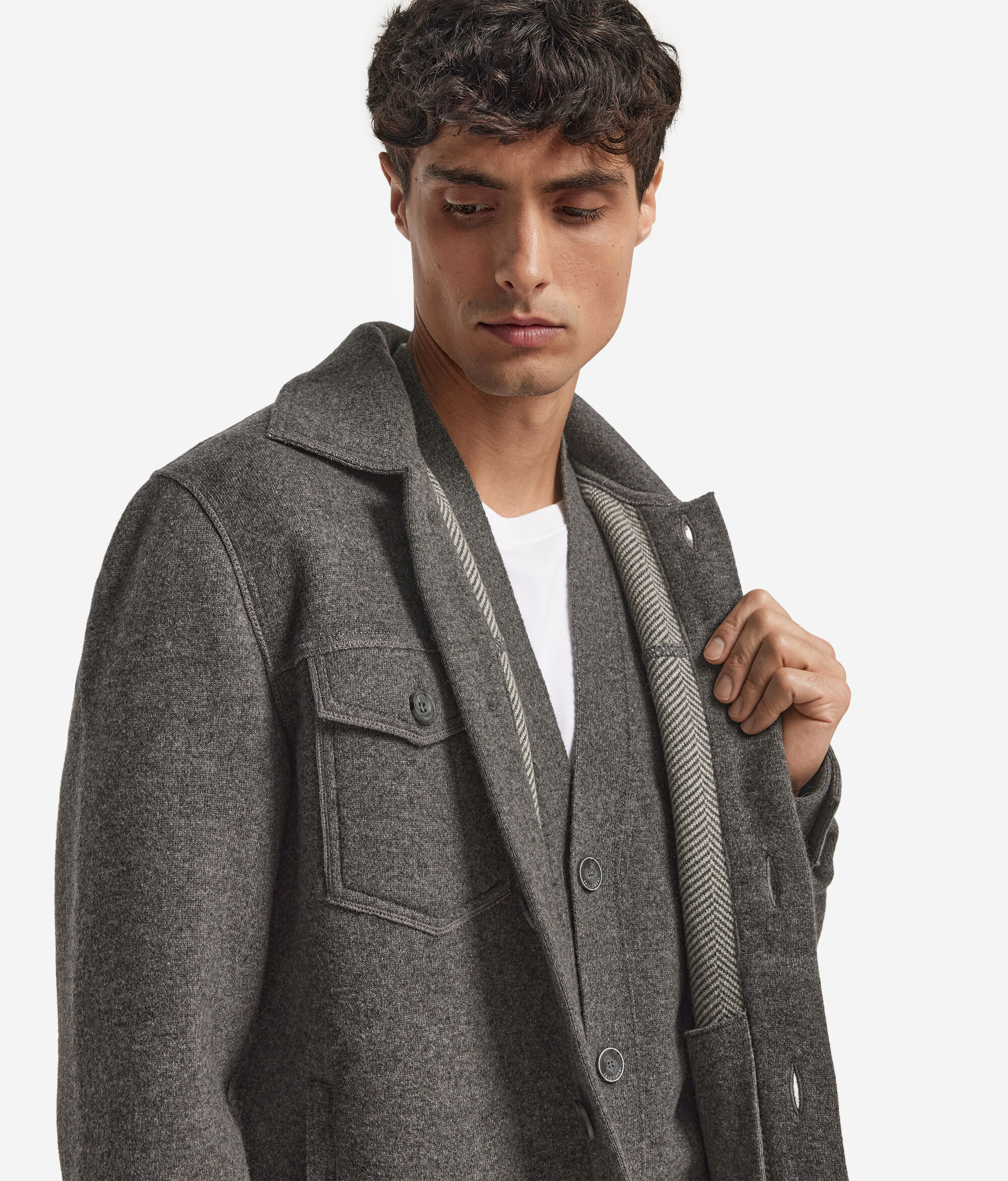 Tato rafinovaná bunda z kašmíru Ultrasoft se vyznačuje propracovaným tubulárním střihem a dvoubarevnou vnitřní částí s motivem rybí kosti, která mu propůjčuje osobitý styl. Je opatřena klasickým košilovým výstřihem a jednořadým zapínáním na knoflíky pro nadčasovou eleganci. Model má vpředu i vzadu sedlo, našité kapsy v oblasti hrudníku, výpustkové kapsy na bocích a jemný detail prošívání po celé délce.