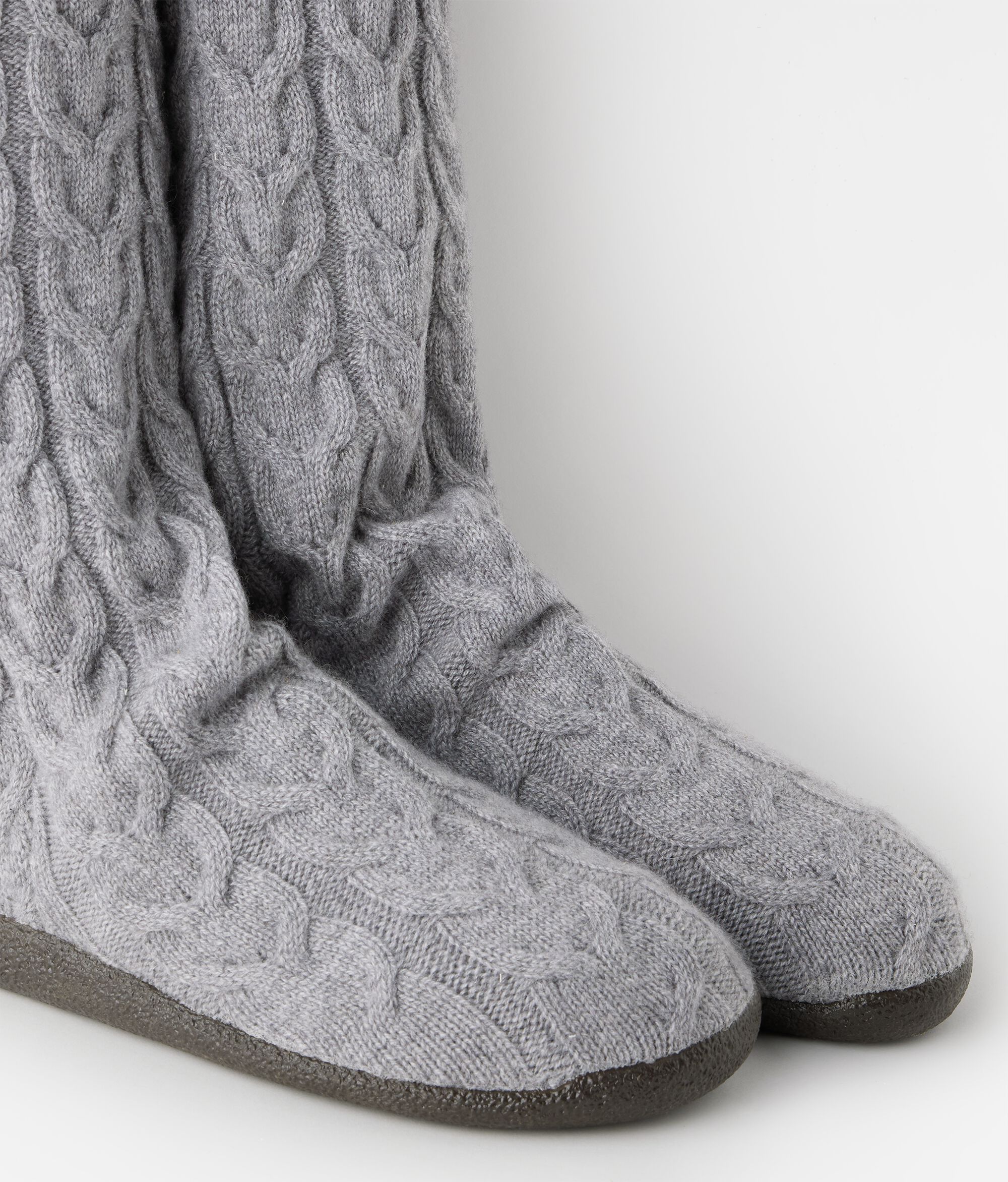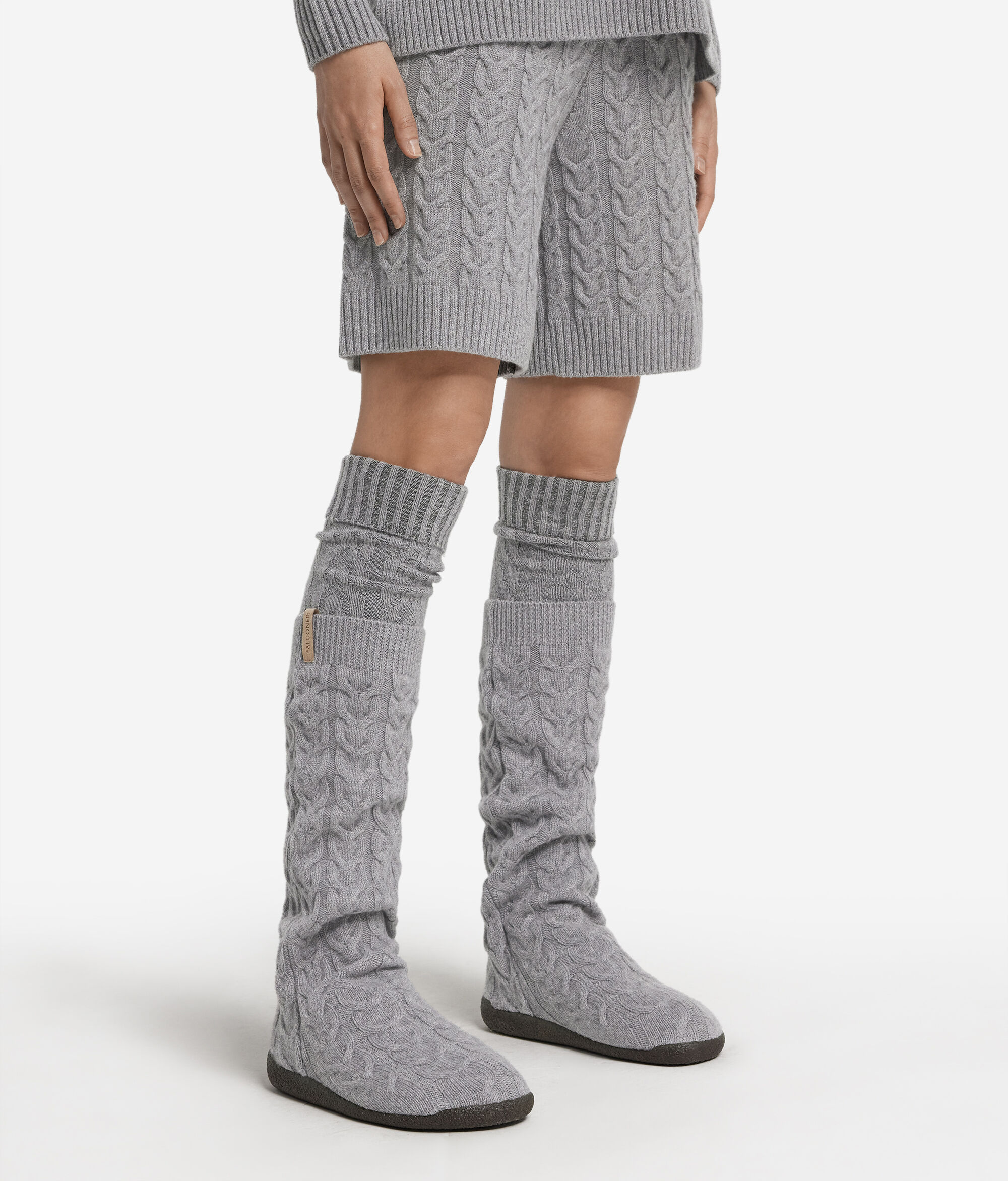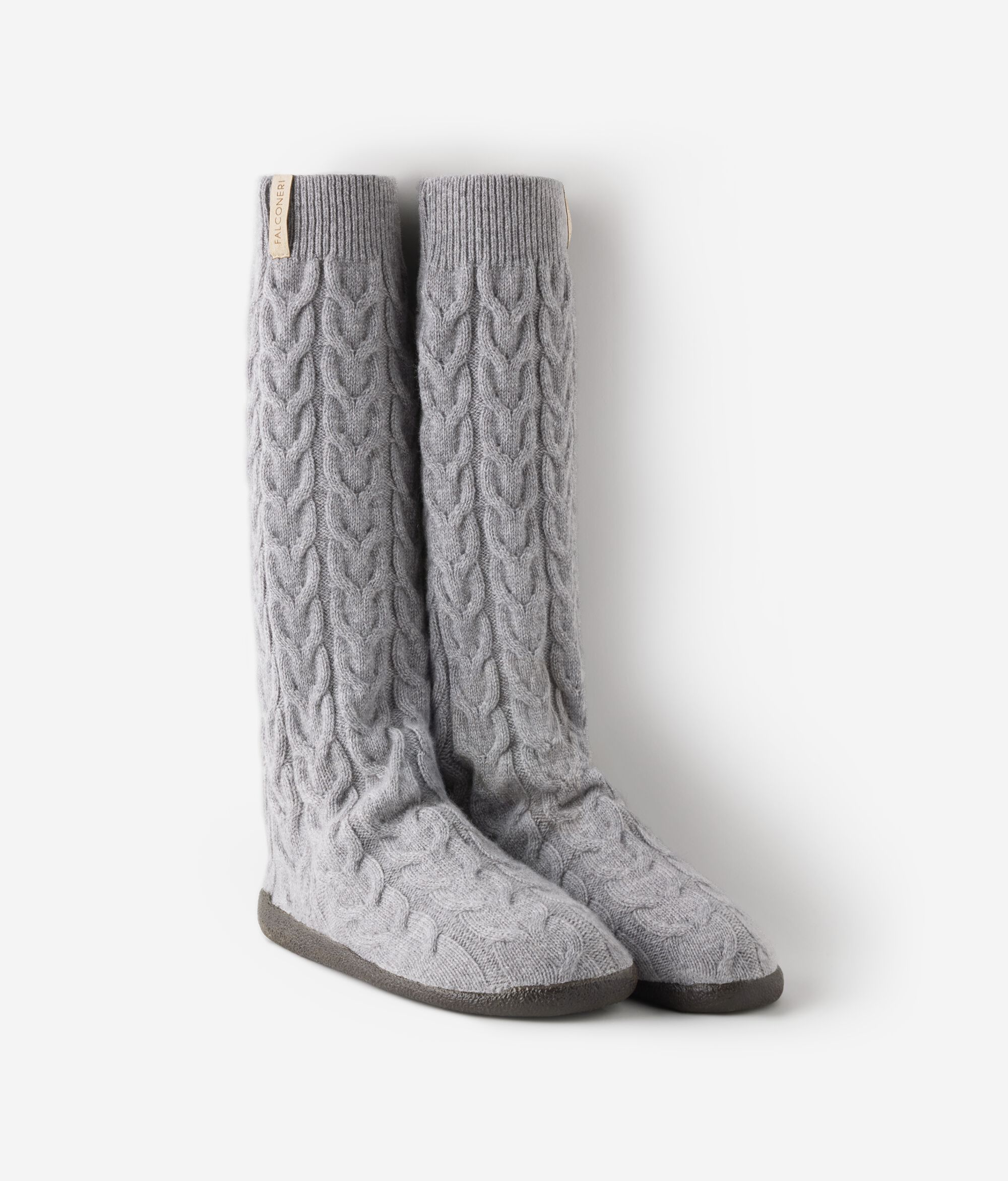 Tyto kozačky vyrobené z kašmíru ultrasoft nově interpretují jeho hebkost, tentokrát ve formě doplňku. Vertikální copánky a žebrované povrchové zpracování dodávají texturu a definici a vytvářejí tak sofistikovanou a moderní hru objemů. Výška pod kolena a barevně sladěná gumová podrážka doprovázejí elegantně každý krok a dovedou proměnit i ten nejjednodušší vzhled v akt vytříbeného stylu.