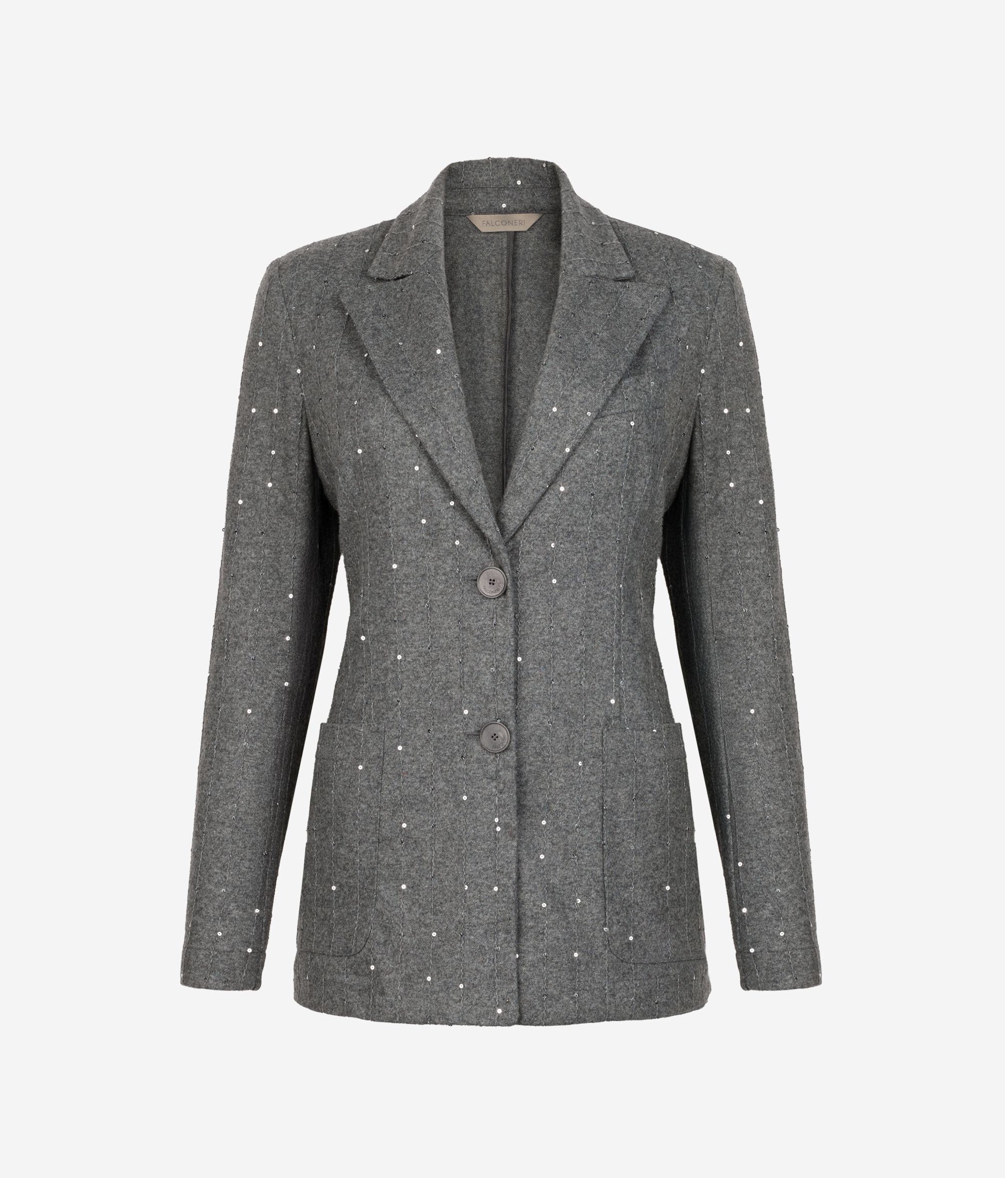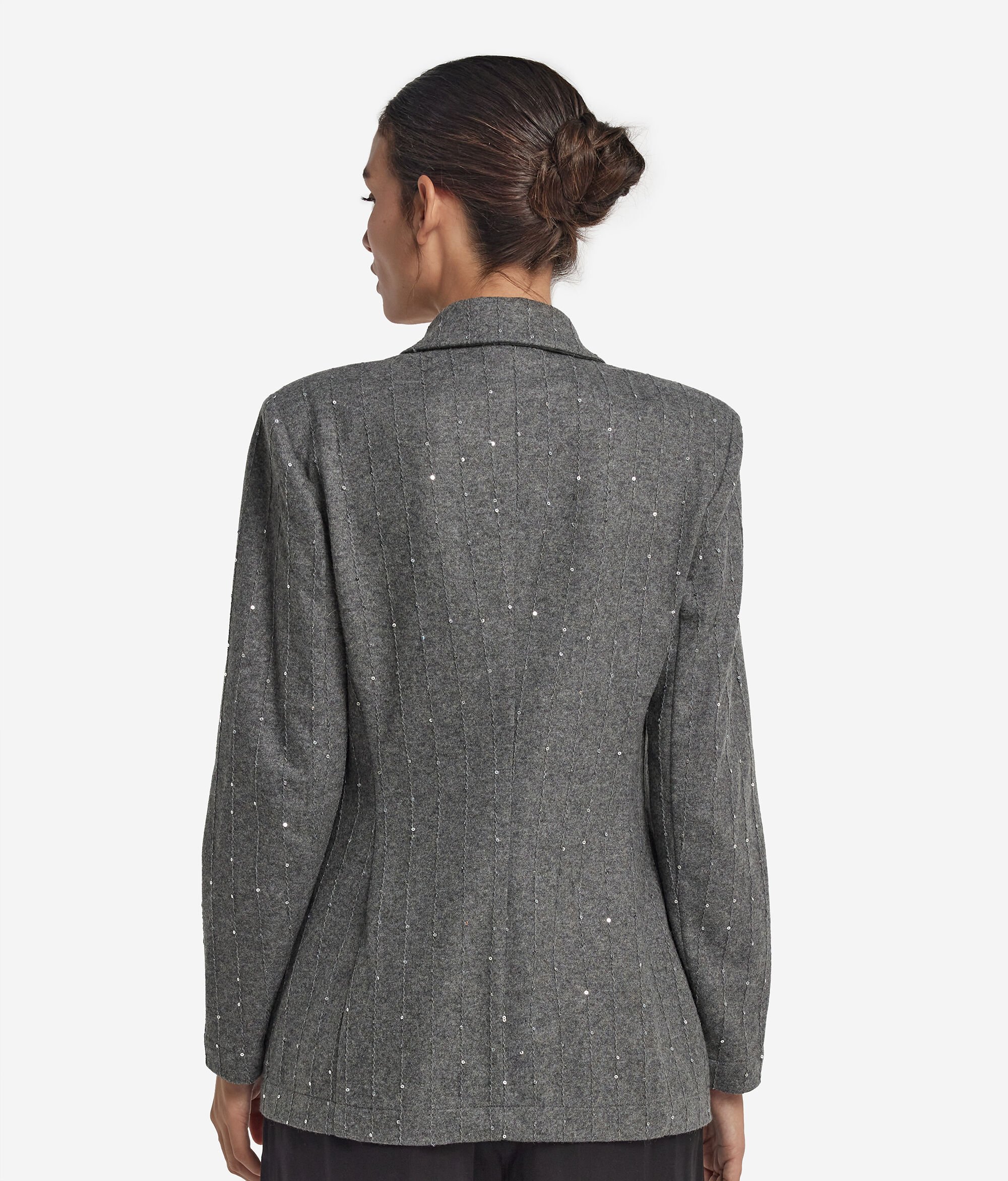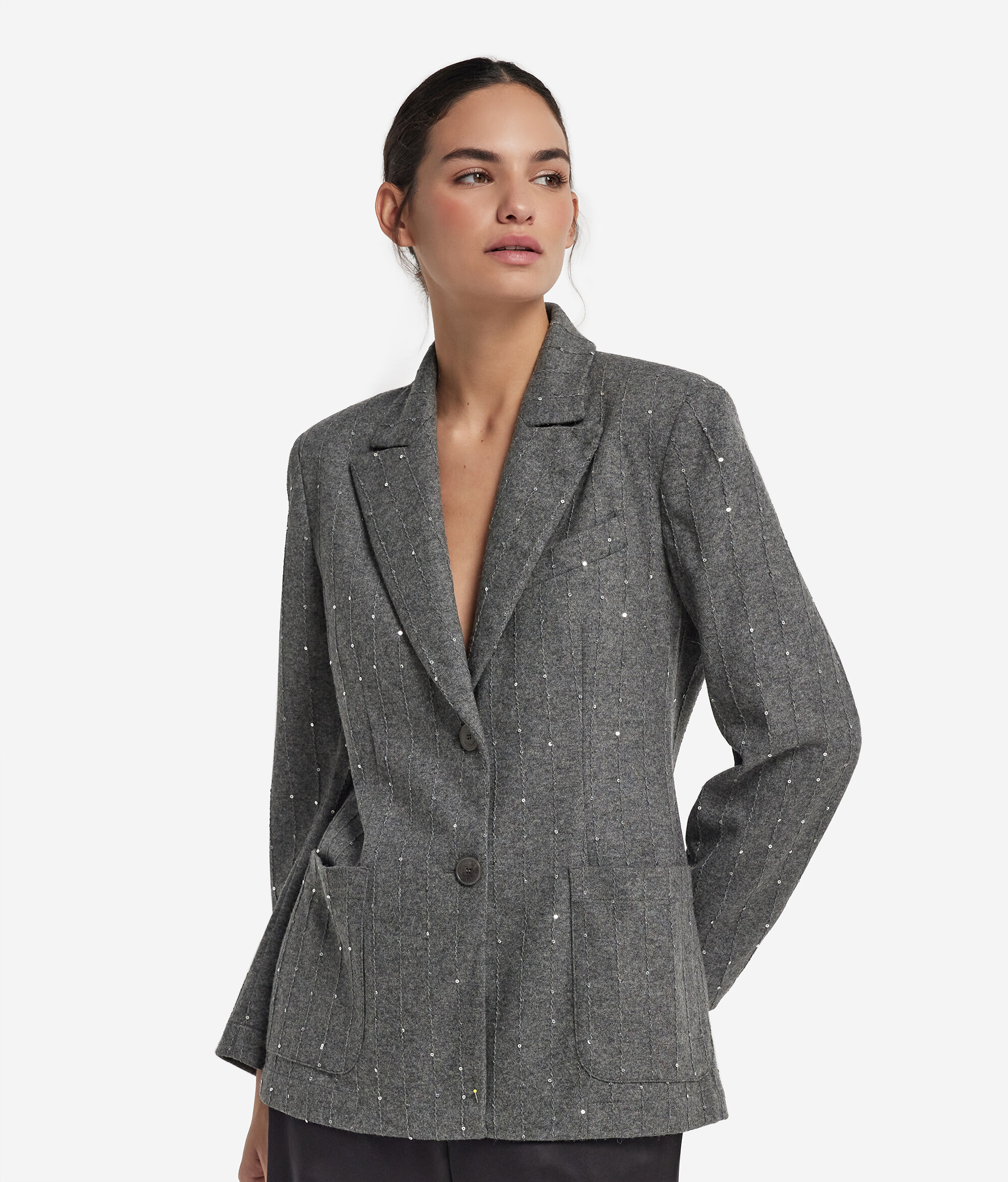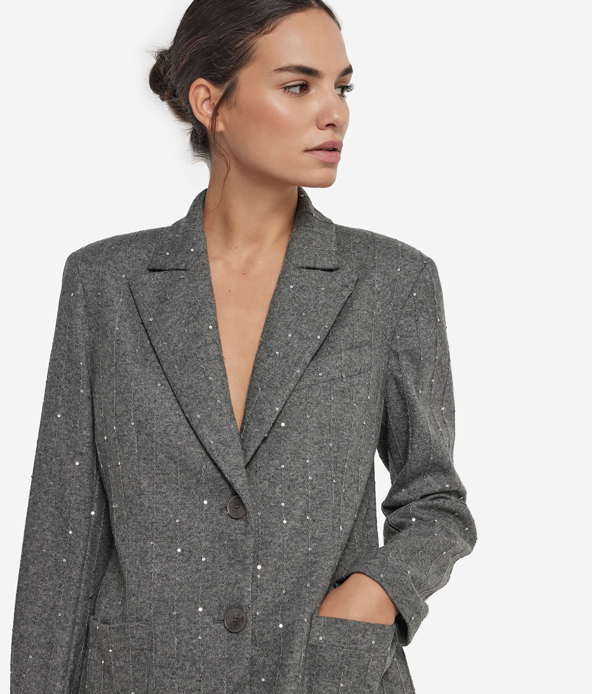 Toto jednořadé sako, vyrobené z vlny a zdobené spoustou jemných flitrů, vyniká svým sofistikovaným a zářivým půvabem. Tvarované klopy, zapínání na knoflíky uprostřed a našité přední kapsy odhalují detaily vysokého krejčovského umu, zatímco běžný střih a délka pod boky vytvářejí elegantní a nadčasovou siluetu.