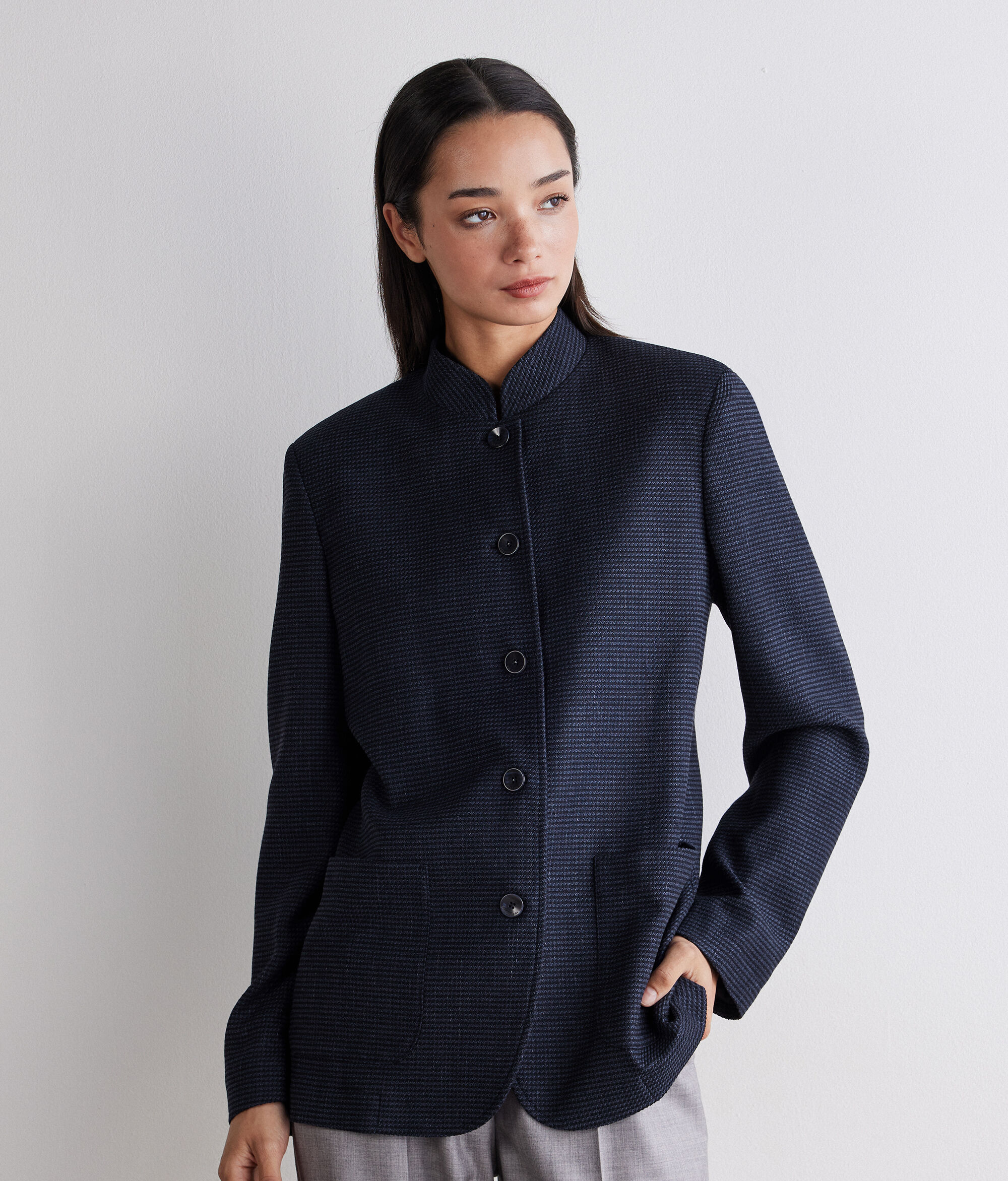 Das zeitlose Hahnentrittmuster betont das besondere Design dieses Kaschmir-Seidenblazers. Die Schulterpolster unterstreichen die klare Linienführung, die durch einen Stehkragen, einen einreihigen Verschluss und aufgesetzte Taschen abgerundet wird.