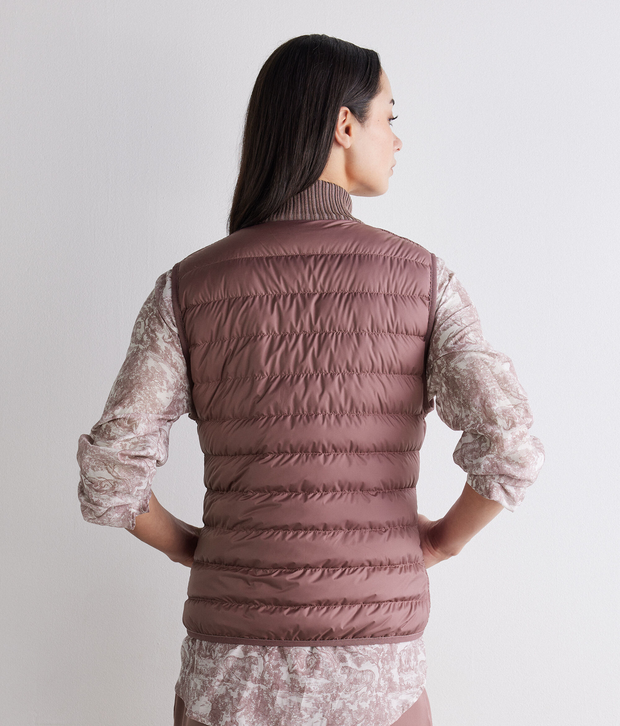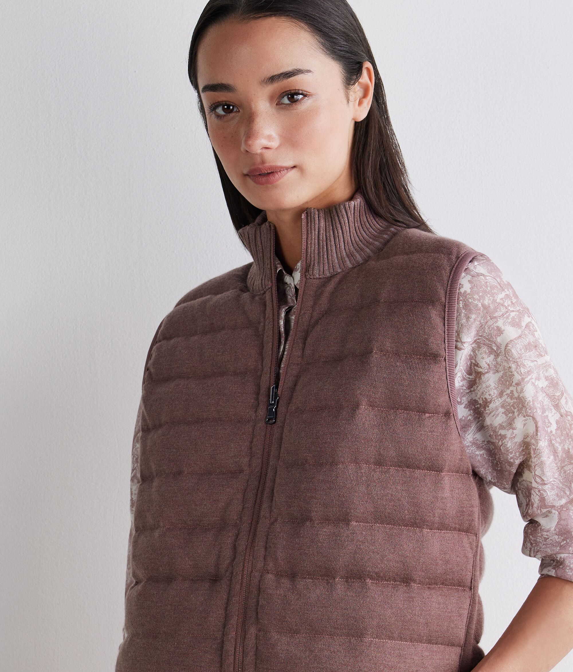 Diese Wendedaunenweste mit elegantem und modernem Charakter zeichnet sich aus durch eine matte Funktionsseite und eine zweite Seite aus edlem Kaschmir Ultrafine. Der hohe Kragen in Rippstrick und der Reißverschluss mit Doppelschieber vereinen Funktionalität und Raffinesse. Sorgfältige Details wie unsichtbare Taschen und gerippte elastische Abschlüsse zeichnen das Kleidungsstück aus, hervorgehoben durch eine schmale Passform, die der Silhouette ganz natürlich folgt.