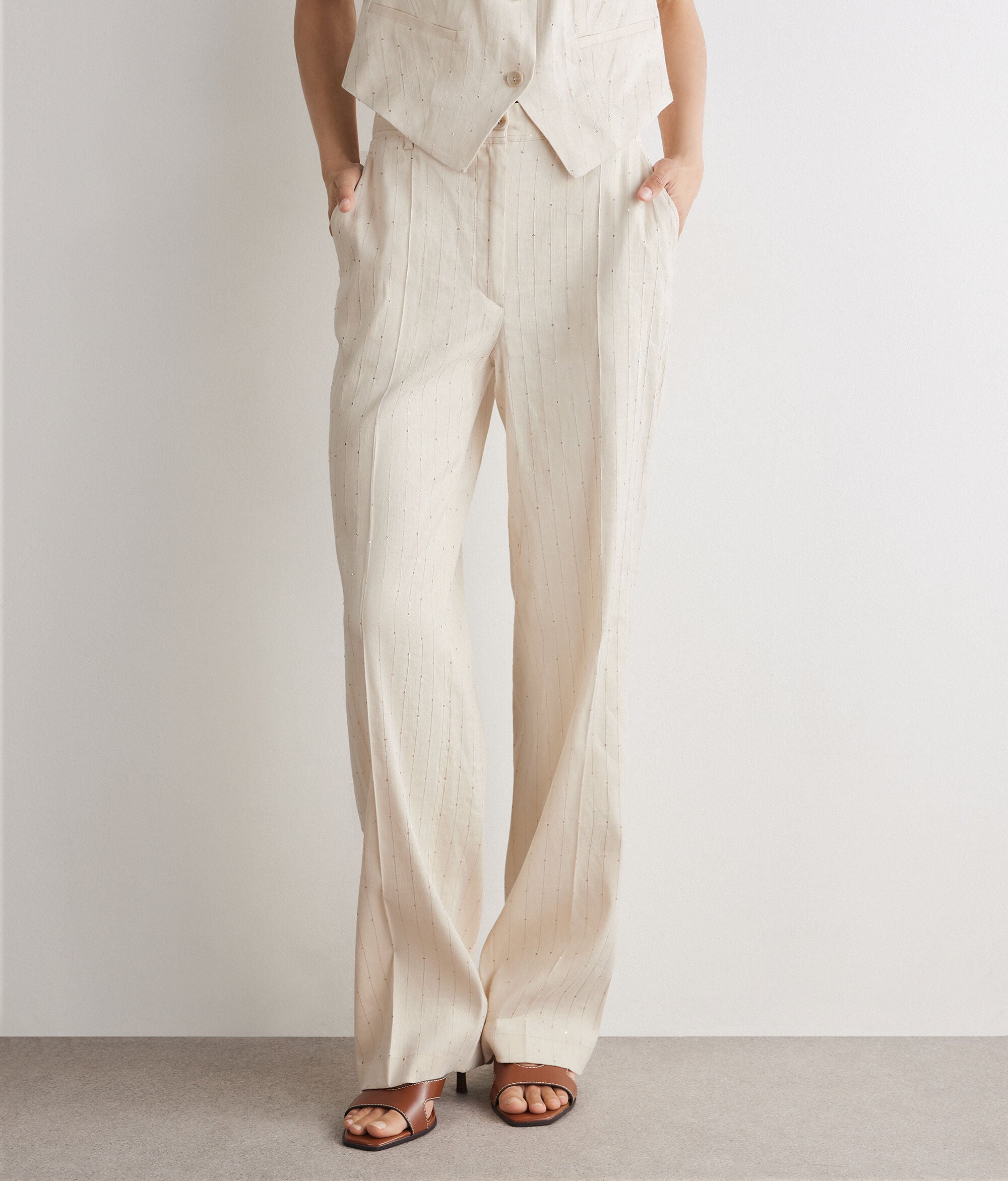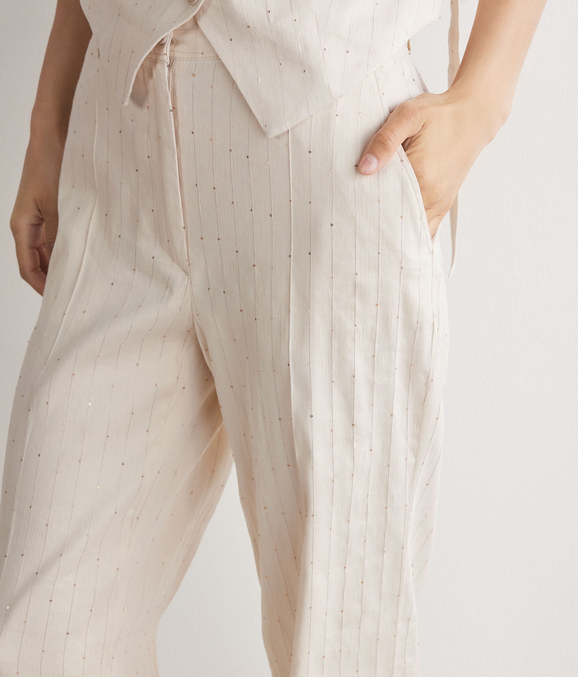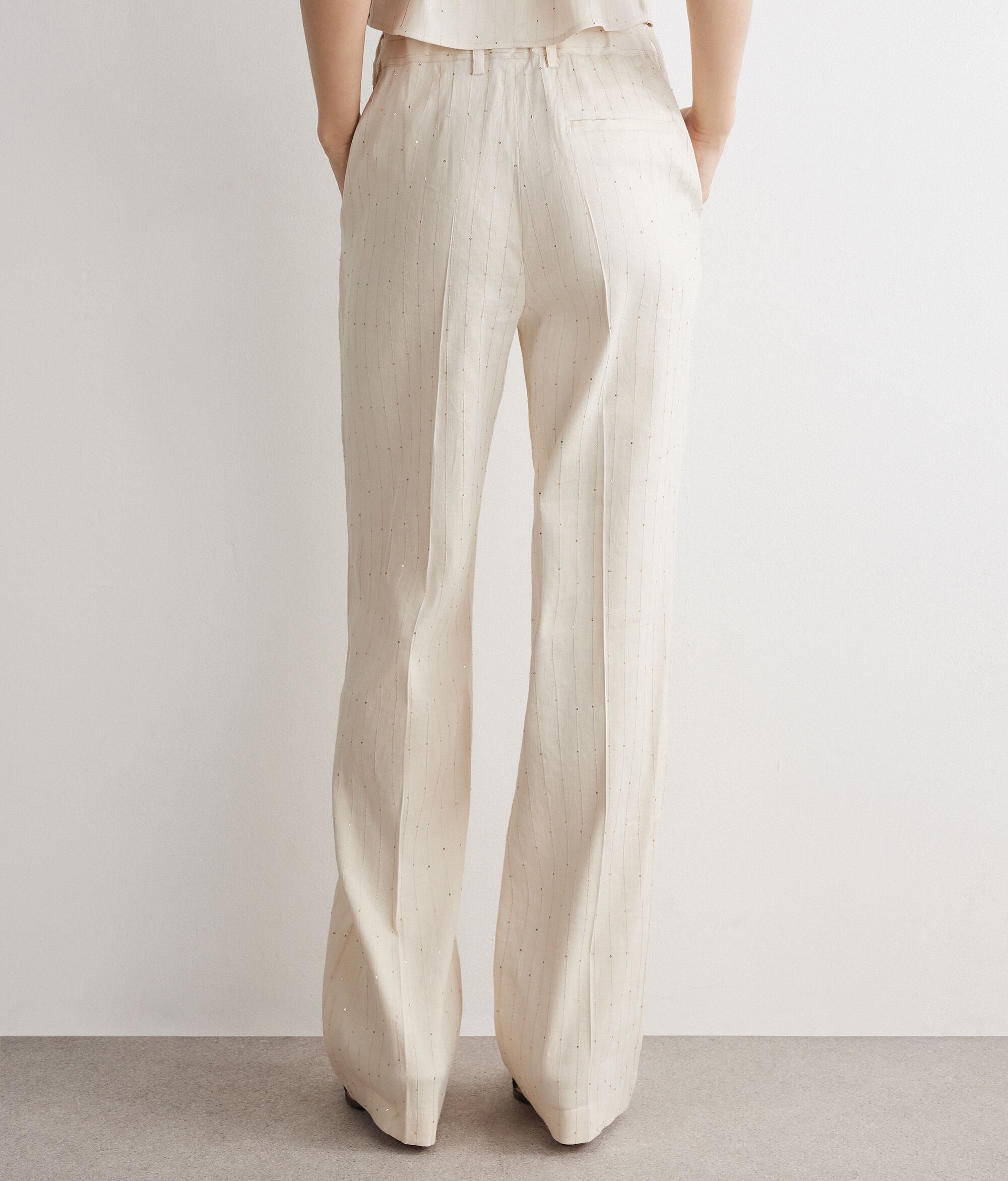 Anzughose aus Leinen und Viskose mit kontrastfarbenem Nadelstreifenmuster und Paillettenbesatz. Das Kleidungsstück zeichnet sich durch einen geraden Schnitt aus, verfügt über einen Bund mit Gürtelschlaufen sowie einen elastischen Einsatz an der Rückseite und vereint Funktionalität und Stil in perfekter Balance.