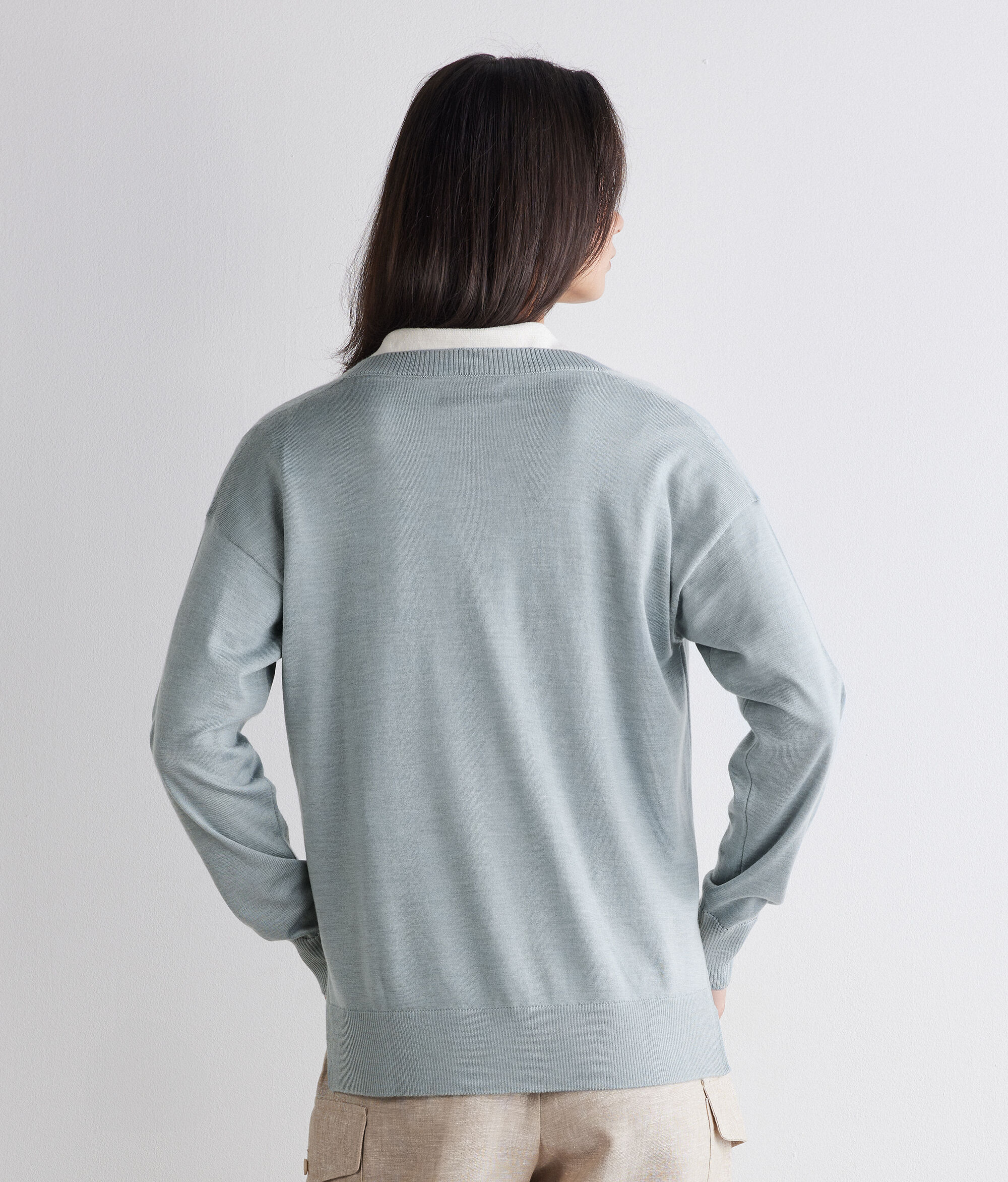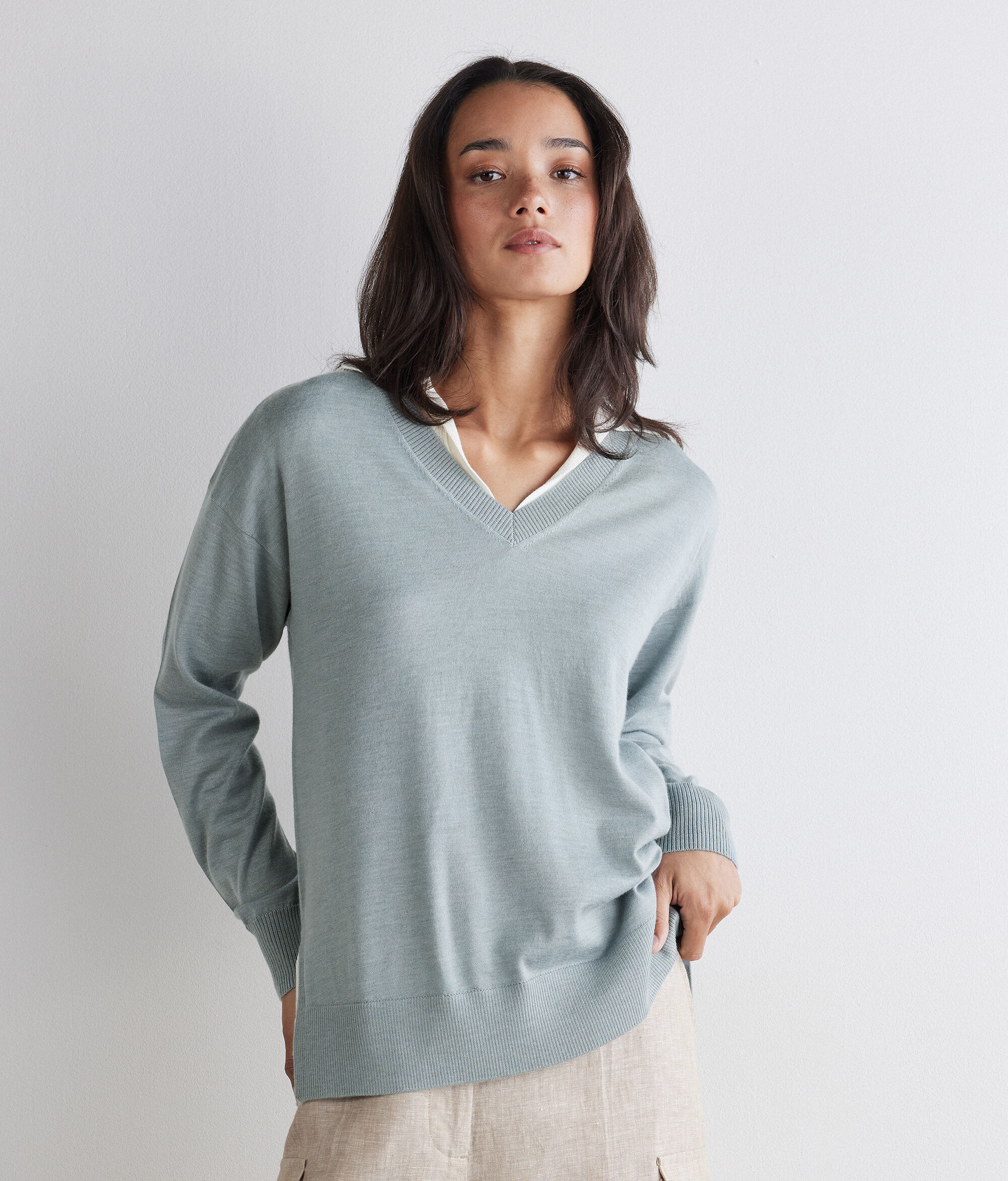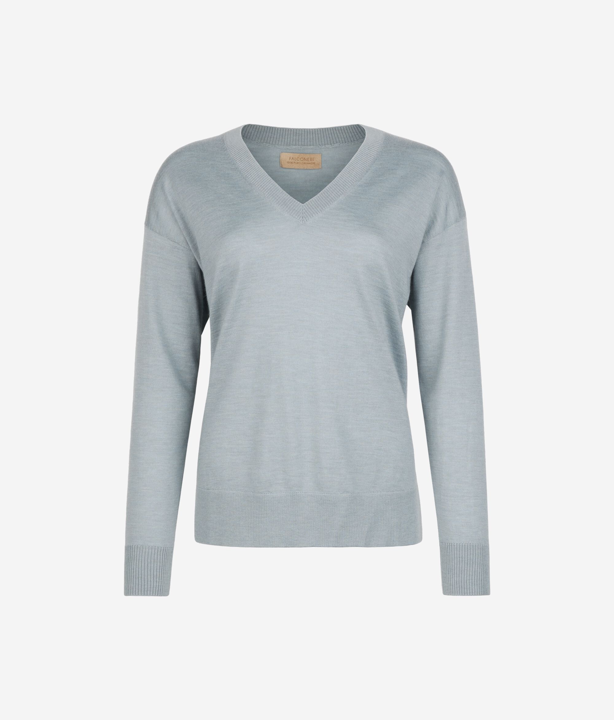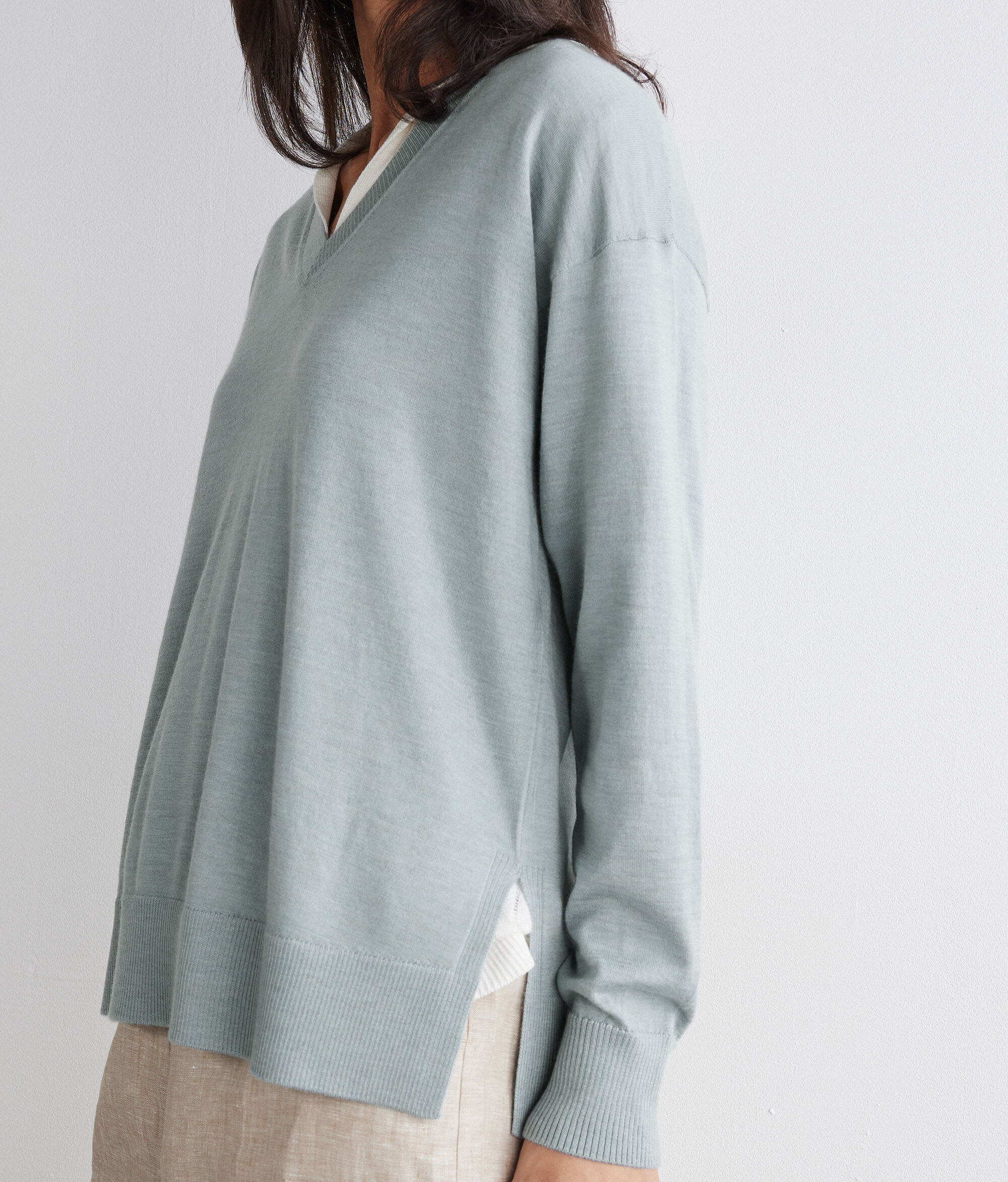 Der Pullover mit V-Ausschnitt aus Kaschmir Ultrafine ist ein langärmeliges Modell, das sich durch Rippstrick an Ausschnitt, Bündchen und Saum auszeichnet. Seine Besonderheit sind die Seitenschlitze. Die Schultern sind leicht überschnitten und die Passform ist weich fallend.