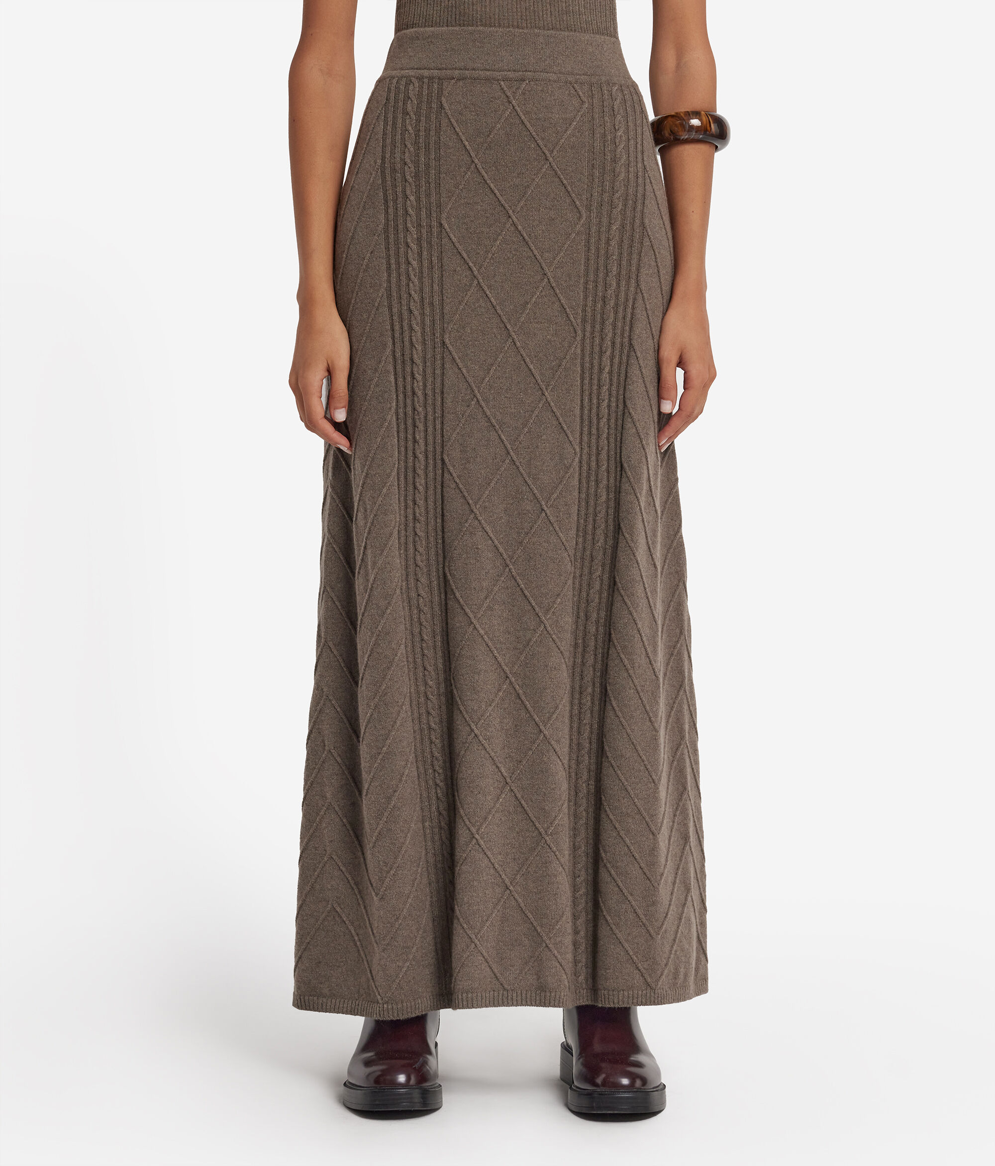 Dieser Rock aus edlem Kaschmir Ultrasoft besticht durch seinen weichen und leichten Griff. Die Verarbeitung mit gemischten Punkten kreiert eine verspielte elegante Textur, während der elastische Bund sich sanft an die Taille schmiegt und für eine normale und komfortable Passform sorgt. Der knöchellange Rock ist unten ausgestellt und enthüllt bei jedem Schritt zeitlose Eleganz und dezente Weiblichkeit.