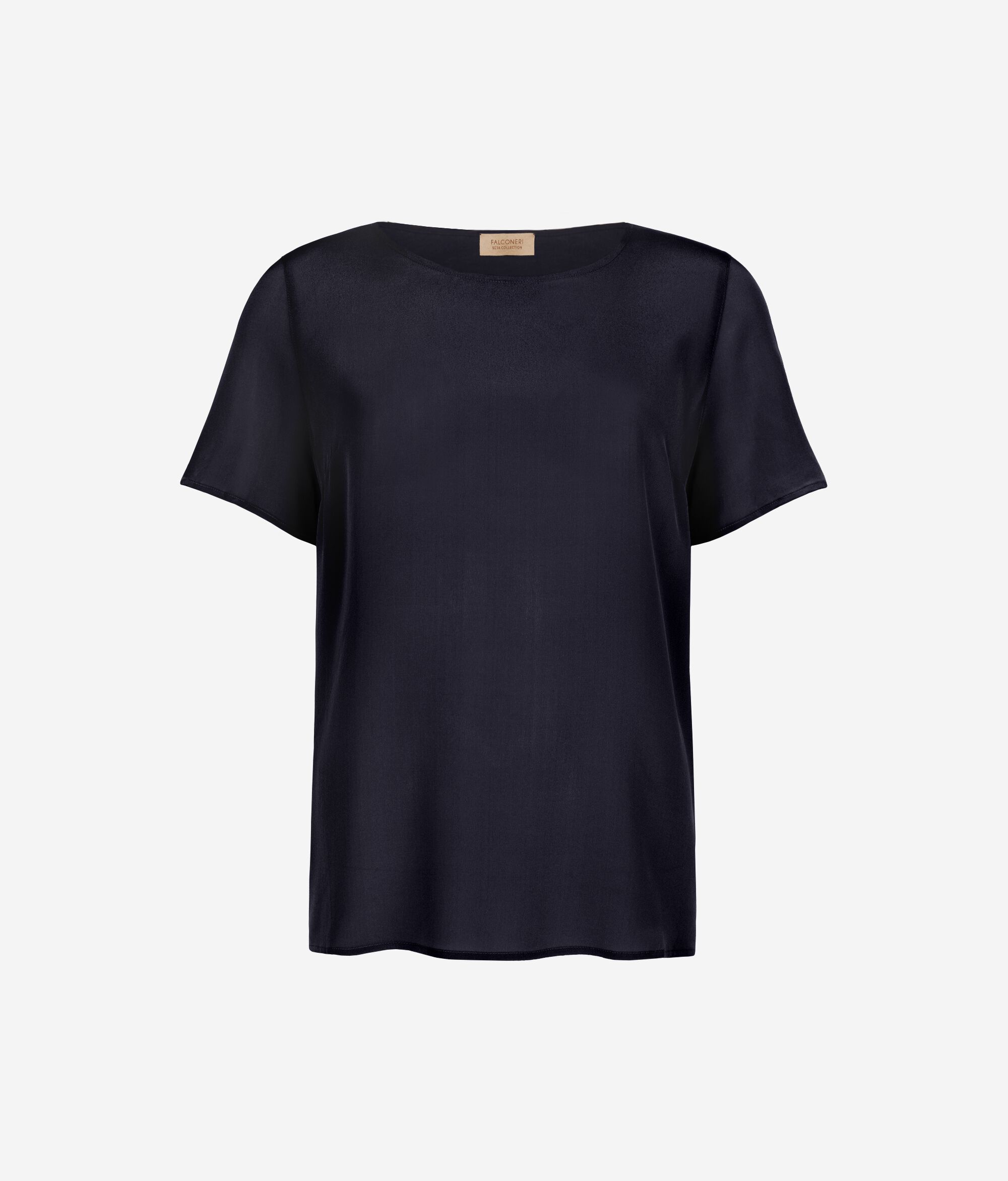 Die feine Textur von reinem Seiden-Crêpe-de-Chine betont die Silhouette dieses T-Shirts mit Rundhalsausschnitt. Die aus Modal gefertigte Rückseite lässt einen besonderen Stoffkontrast entstehen, gewährleistet Zweckmäßigkeit und sorgt für ein angenehmes Gefühl auf der Haut. Durch die fließende Passform legt sich das leicht transparente Gewebe schön um den Körper. Das schlichte Design macht das Modell zur idealen Wahl unter einer Jacke und verleiht jedem Look einen feinen zeitlosen Hauch Klasse.