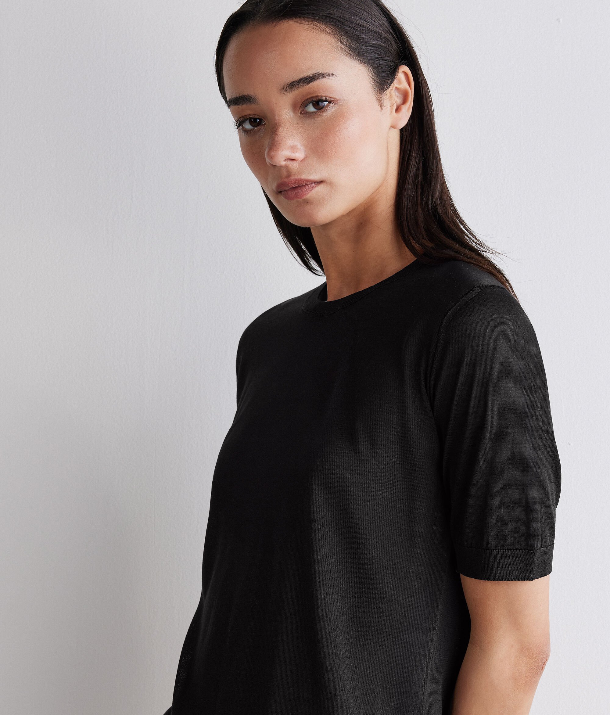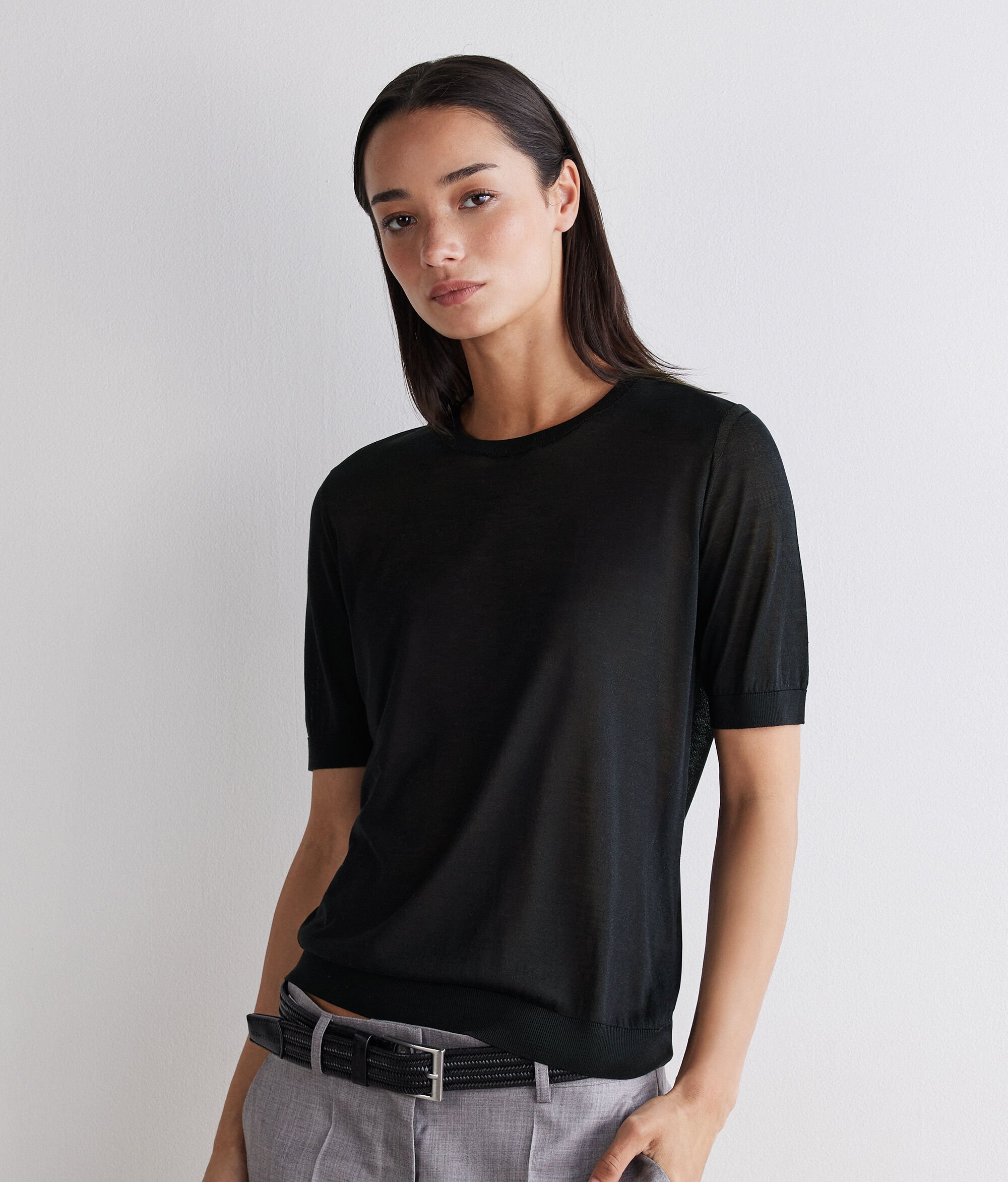 Der Rundhalsausschnitt aus Seidenstrick mit einer leichten und glänzenden Textur wurde sorgfältig von erfahrener Hand gefertigt, um seine natürliche Eleganz zu unterstreichen. Die normale Schulterpartie und die schmale Passform betonen die Figur optimal, während die gerippten Abschlüsse an Saum und Ärmeln dem Design eine besondere Note verleihen. Mit der normalen Passform lässt es sich perfekt alleine oder im Lagenlook tragen.