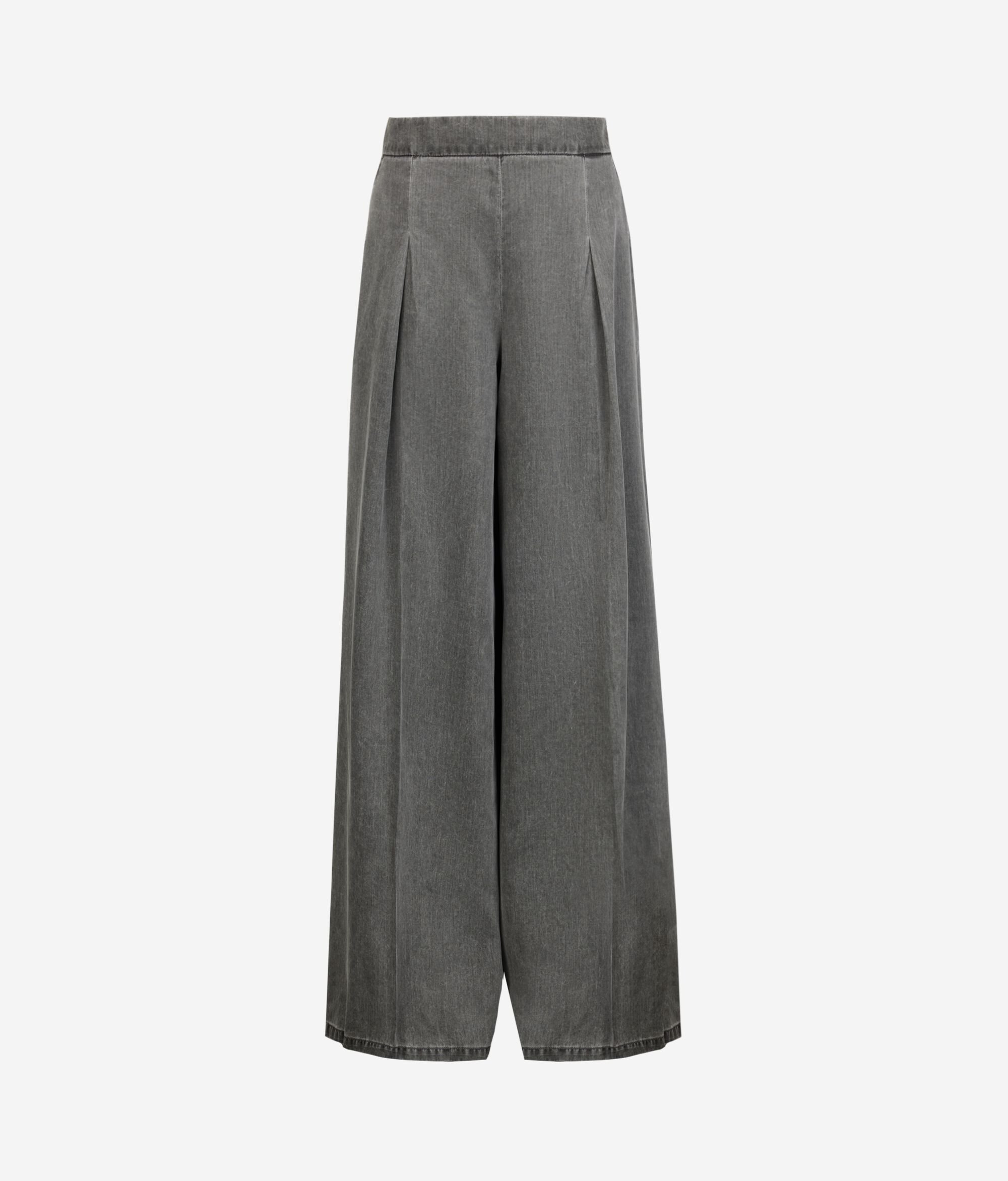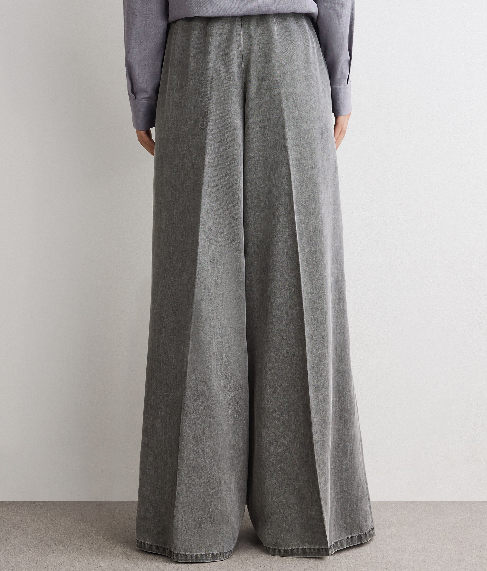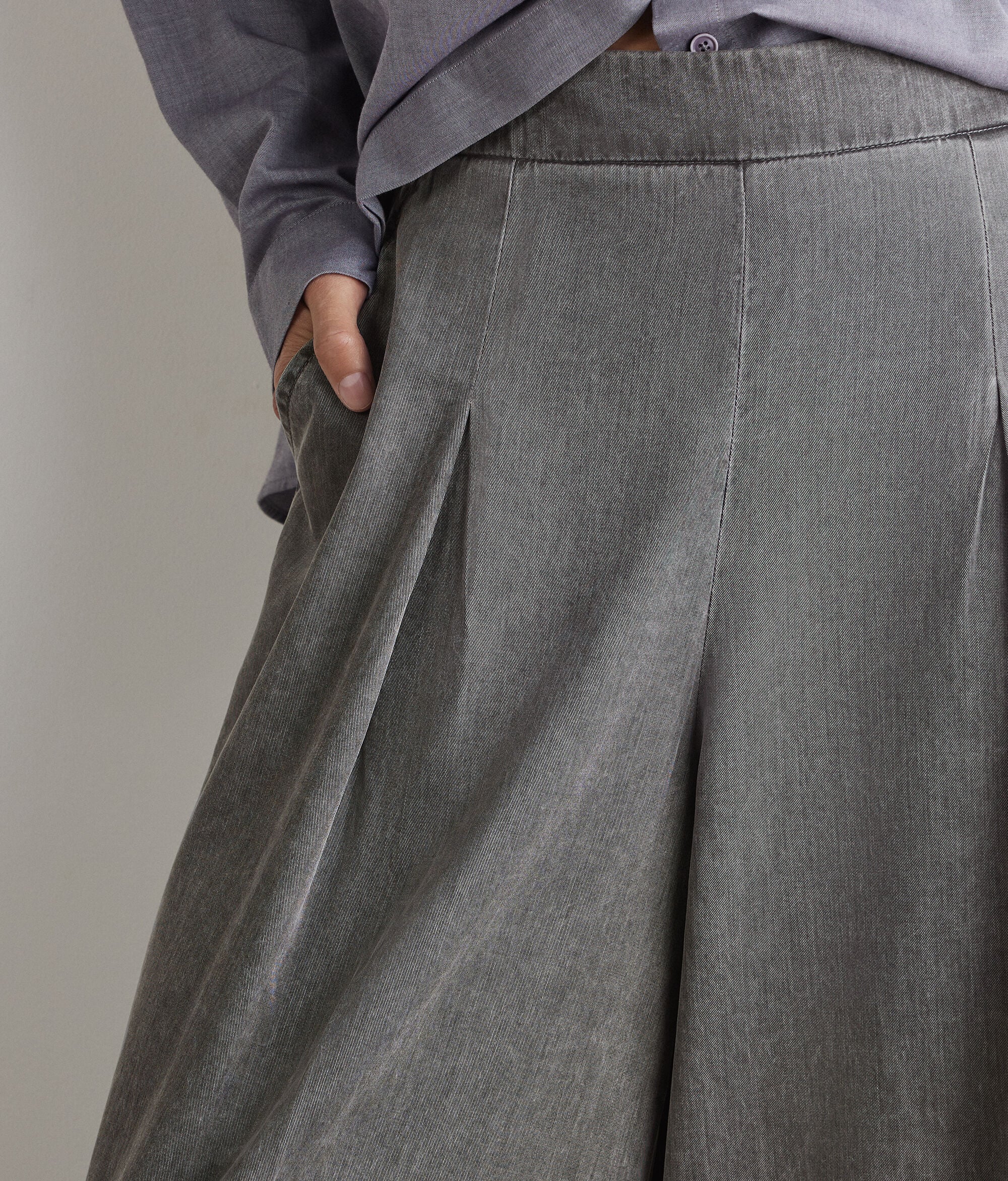 Hose aus Lyocell mit weiter, fließender Silhouette, die durch Abnäher an der Vorderseite ergänzt wird, die wiederum das Volumen elegant betonen. Das Design wird durch einen Bund und schräge Eingrifftaschen auf der Vorderseite bereichert, während der verdeckte Reißverschluss an der Seite für eine klare und elegante Linie sorgt.