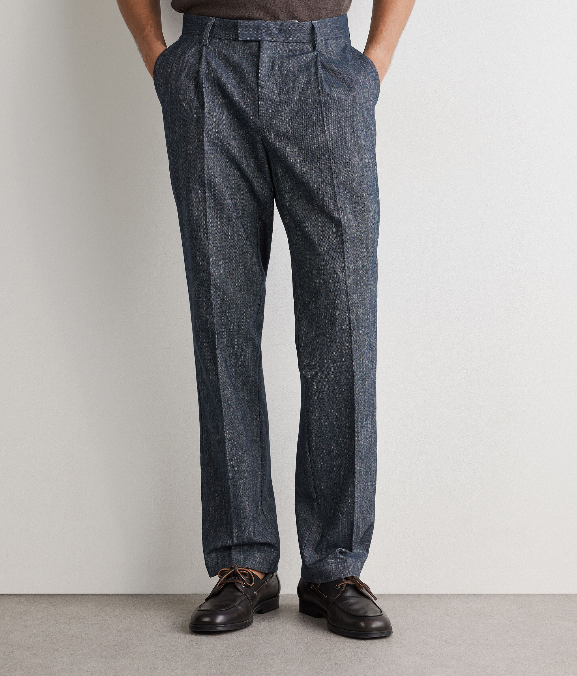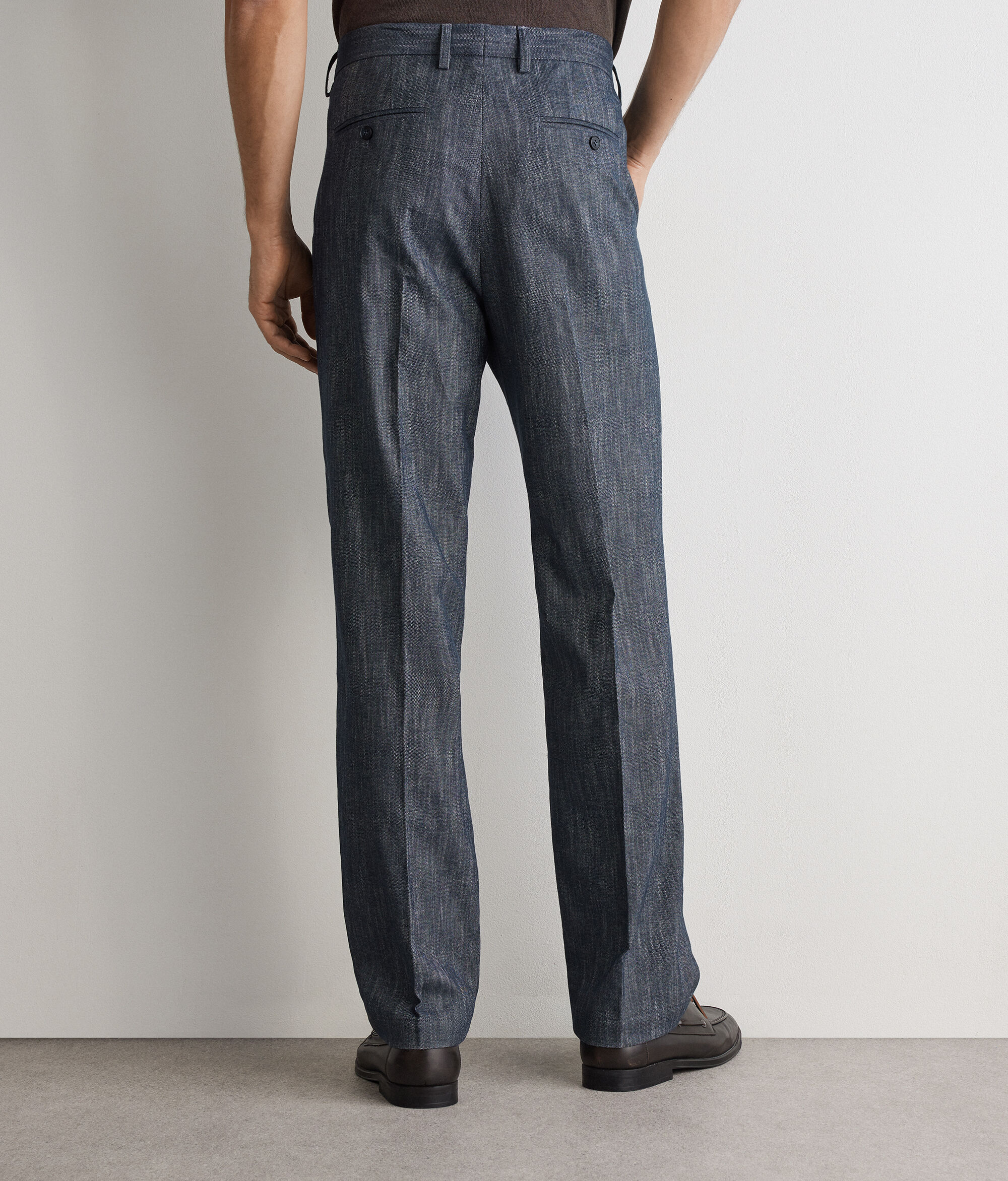 Trousers made of denim-effect shot cotton, characterised by a refined, material texture. The straight-leg design with a central pleat elegantly flatters your figure, while the belt loops and slant pockets on the front and double-welt pockets on the back complete the design with practicality.