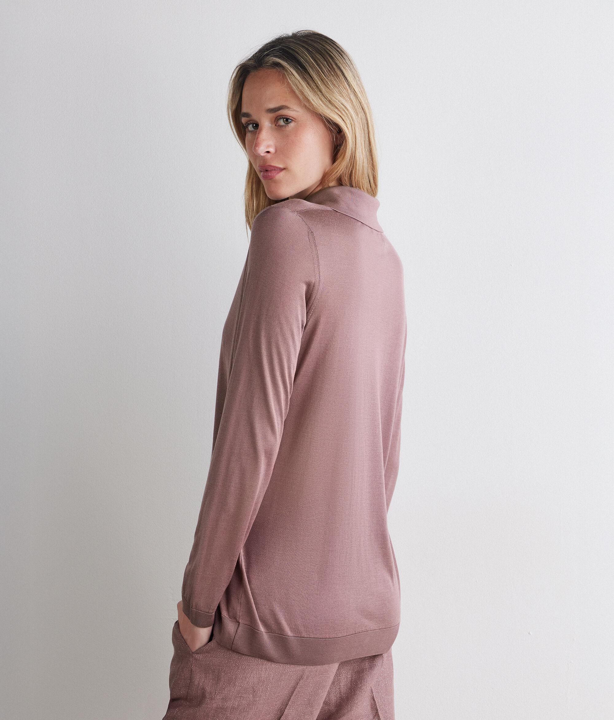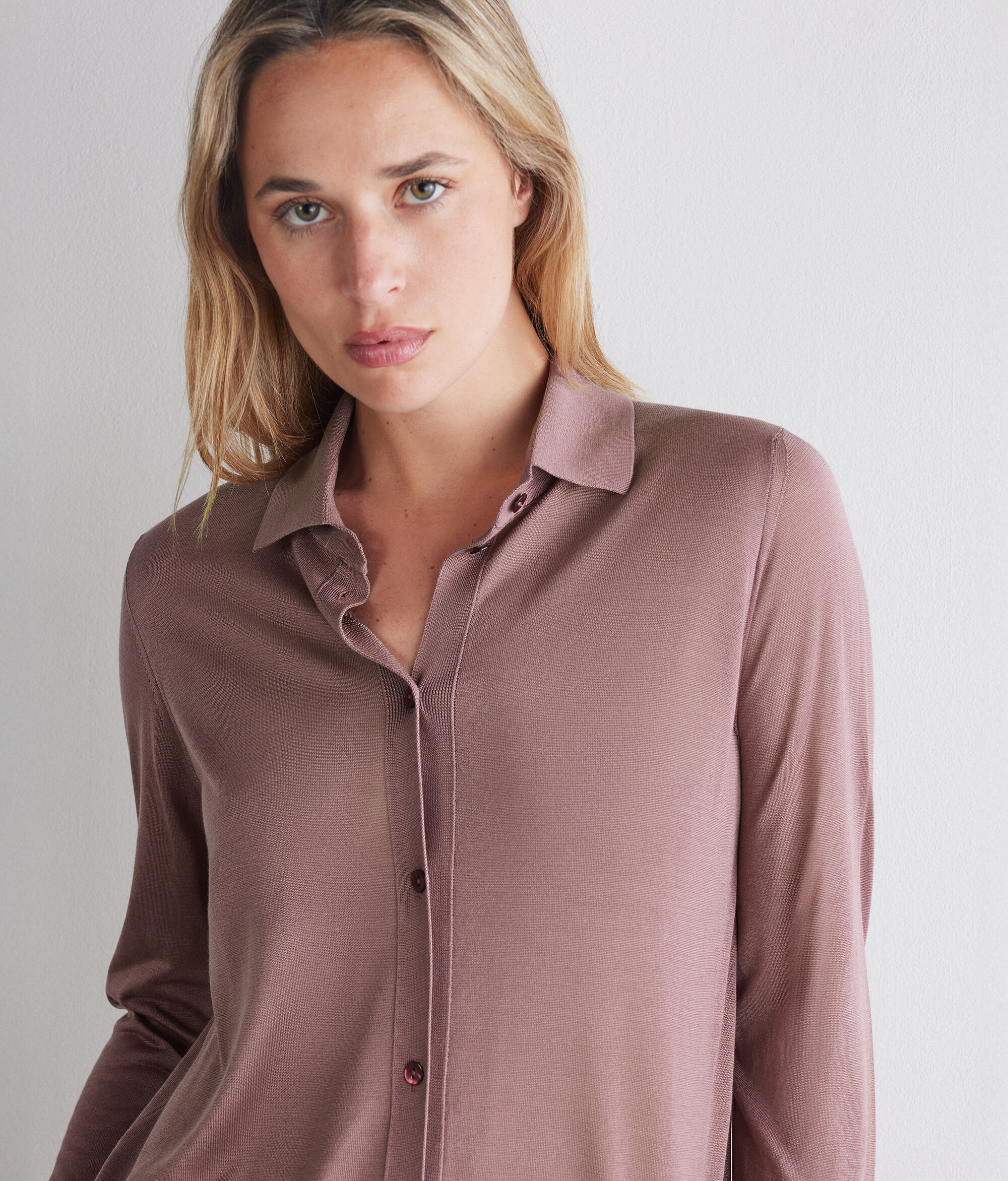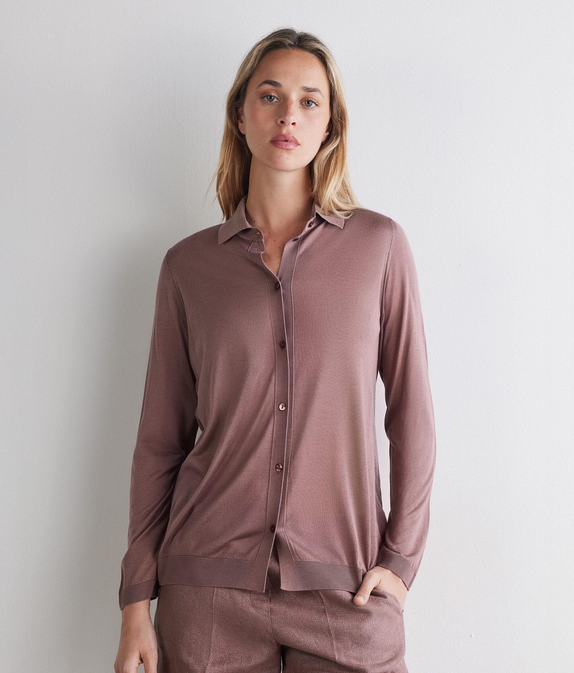 Light and bright silk knit shirt with classic collar and central fastening with five buttons. The long sleeves are finished with ribbed cuffs and hem, for a structural detail that enhances the fit. The regular fit creates a fluid and versatile line, ideal for both formal looks and casual-chic outfits.