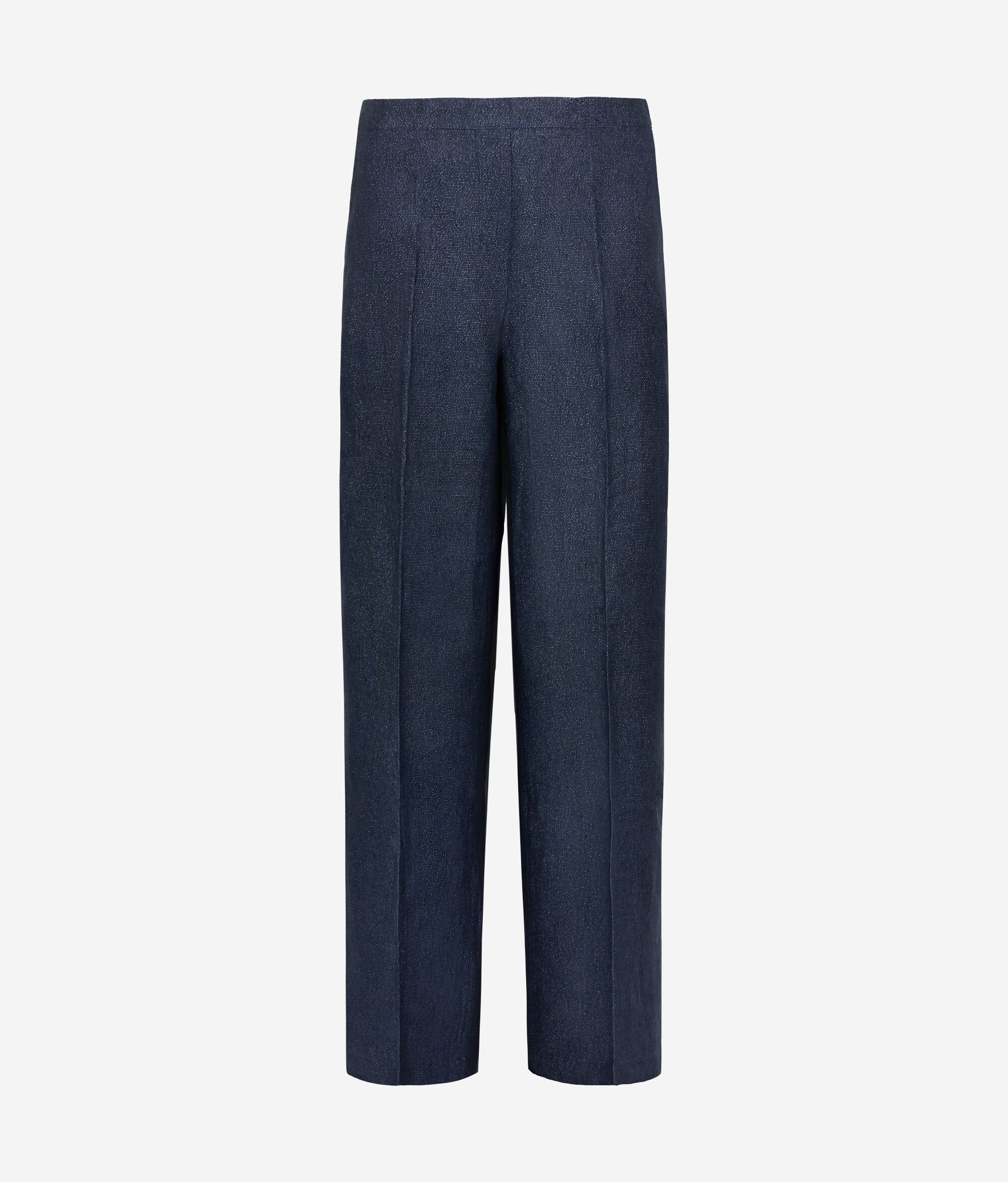 Pantalone realizzato in tela di lino impreziosito da filato lamé. Il taglio dritto e lo stiro piega centrale caratterizzano il modello d'ispirazione sartoriale.