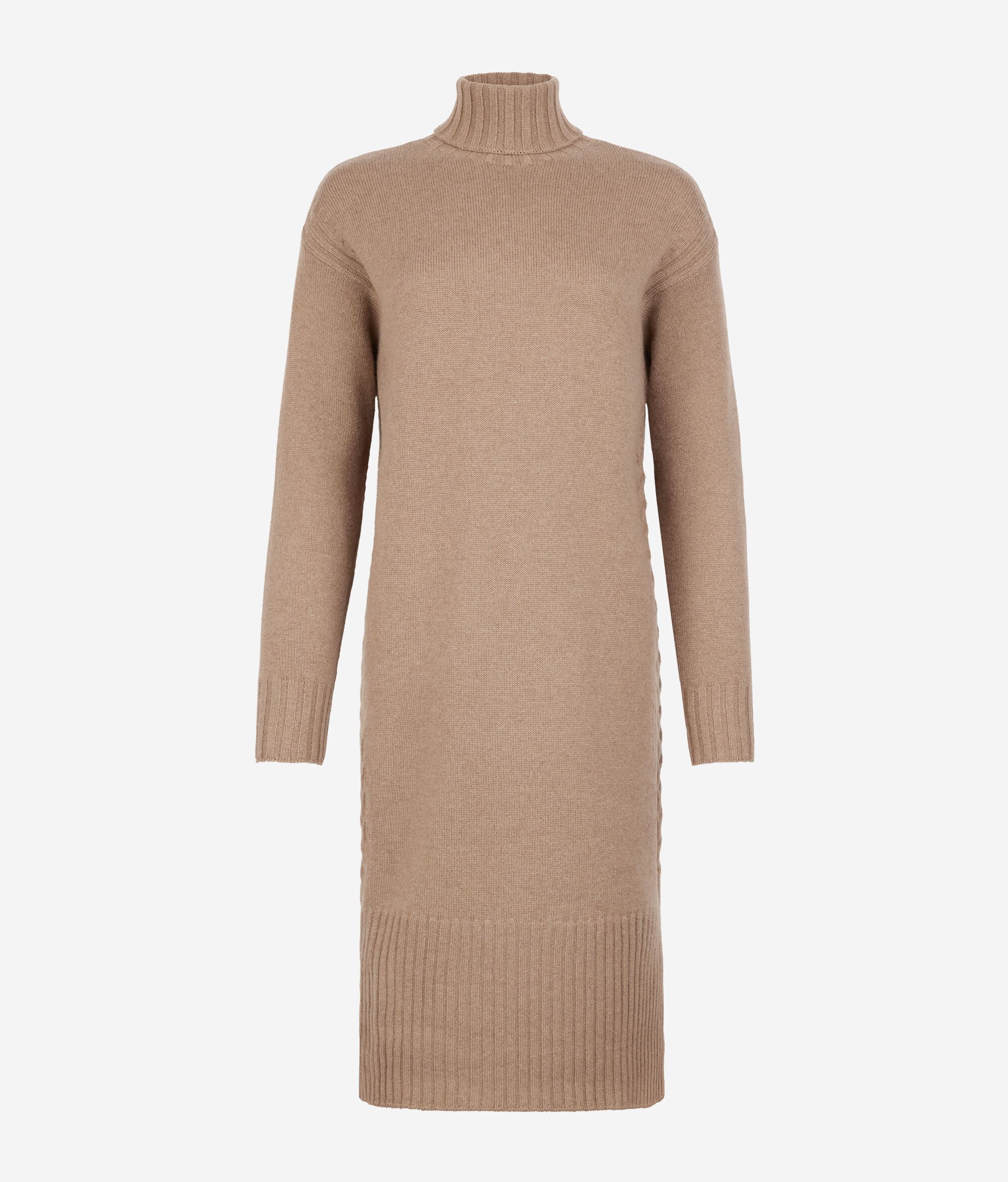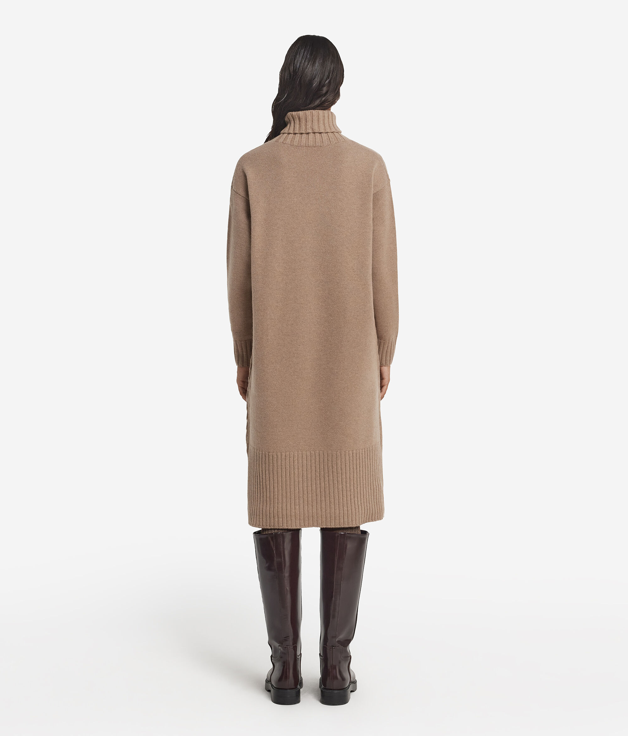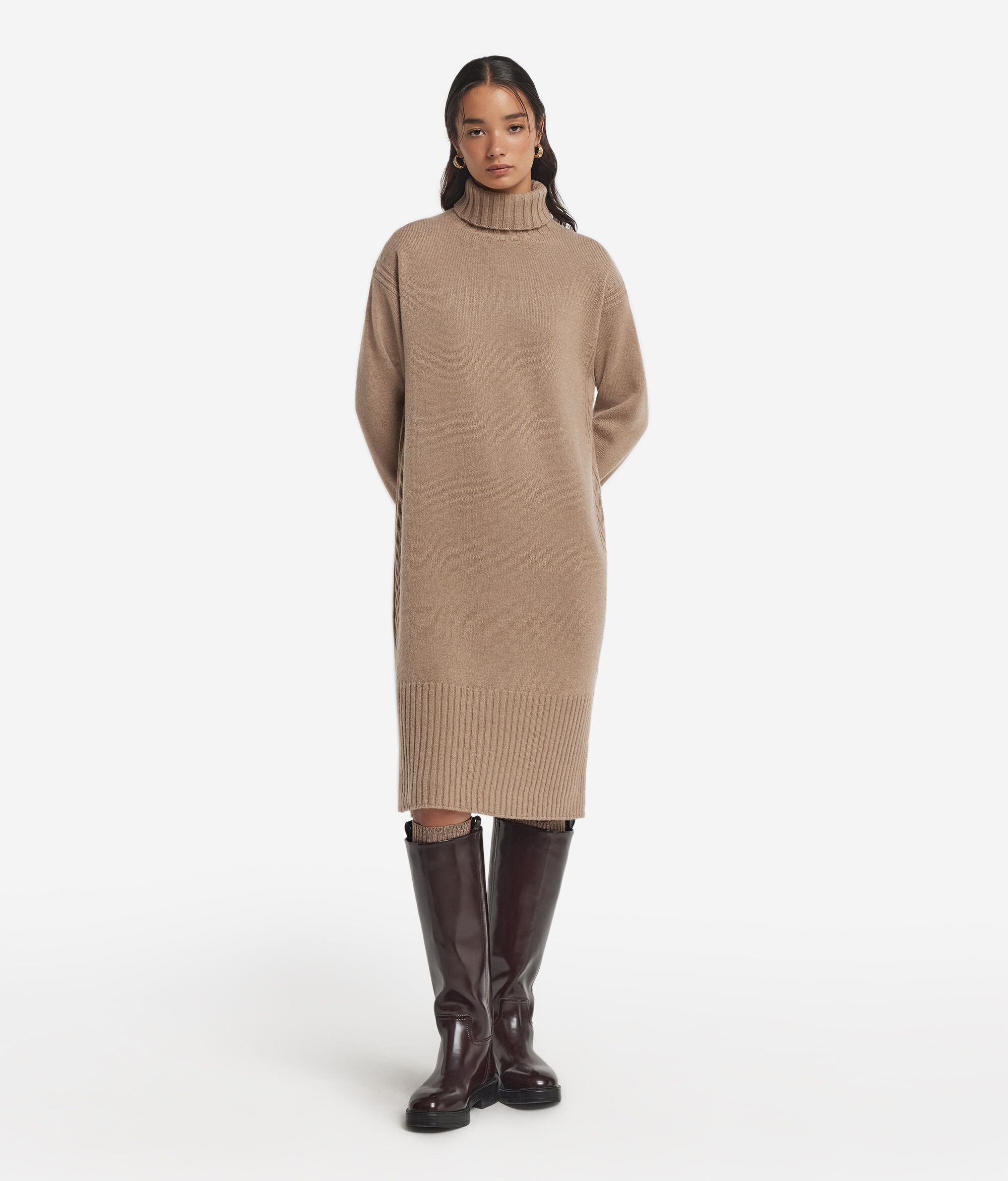 Soft Ultrasoft Cashmere and an elegant design for a dress that envelops with class. The high neck and subtly dropped shoulders create a relaxed yet refined allure, while vertical cable stitch at the sides elegantly define the silhouette. Ribbed details on the collar, hem, and cuffs add nuance, while small slits at the bottom allow ease of movement, complemented by a knee length which is suitable for any occasion.