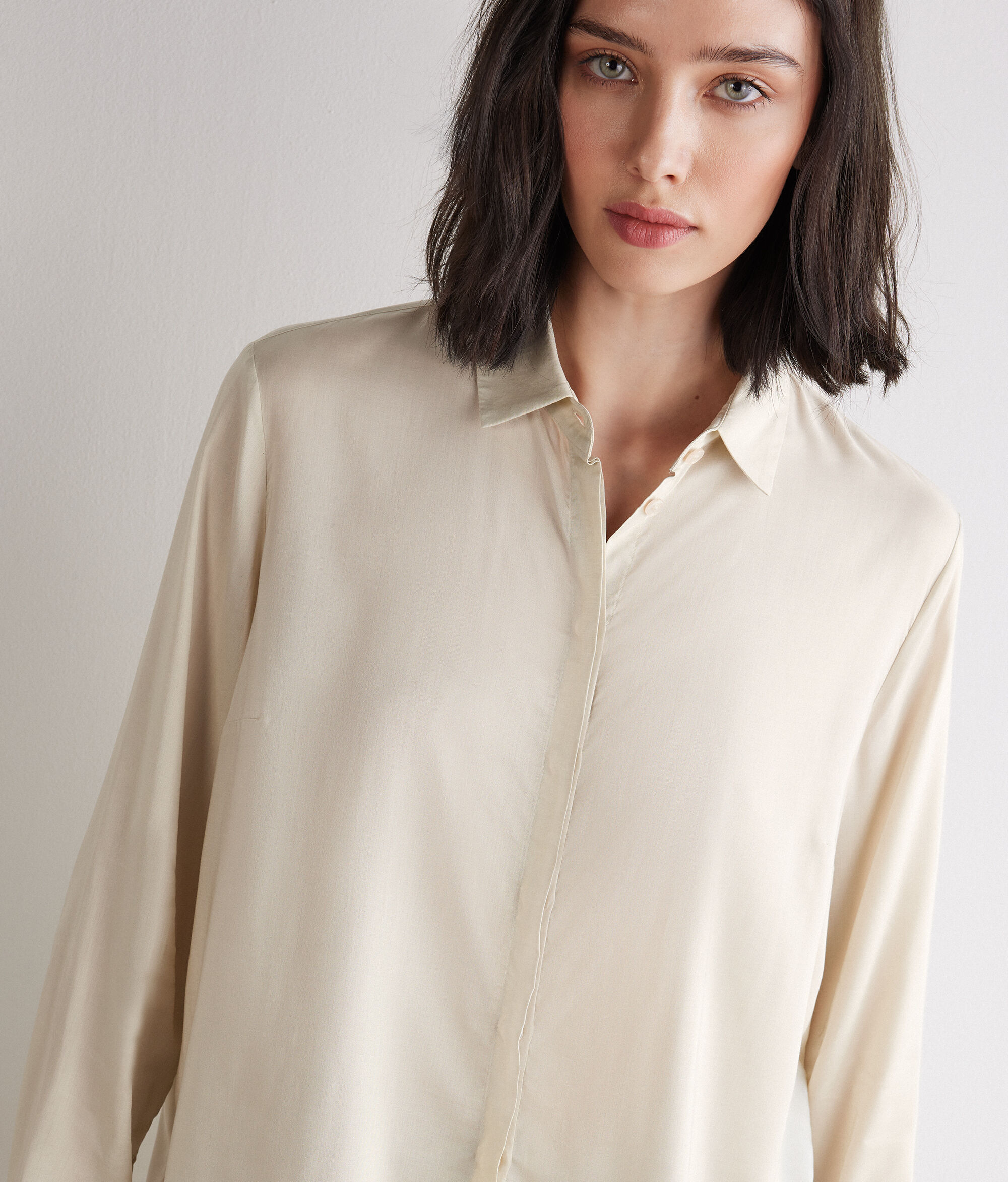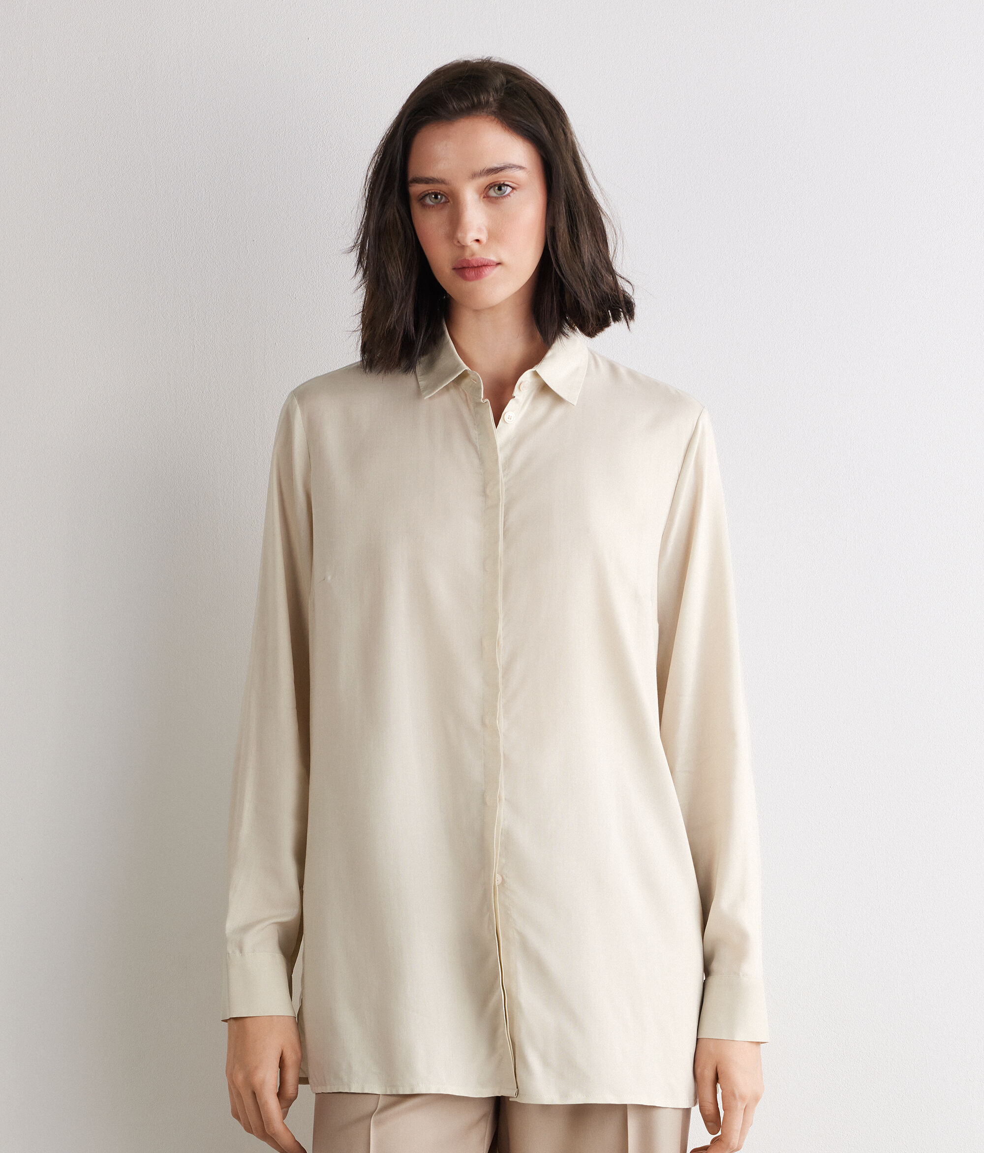 Camisa folgada, expressió d'una elegància natural i contemporània. El coll recorda un estil clàssic renovat, mentre que l'espatlla lleugerament caiguda i el tall folgat li donen un encant relaxat. La màniga tipus globus afegeix volum i feminitat, i s'equilibra amb les obertures laterals altes.
