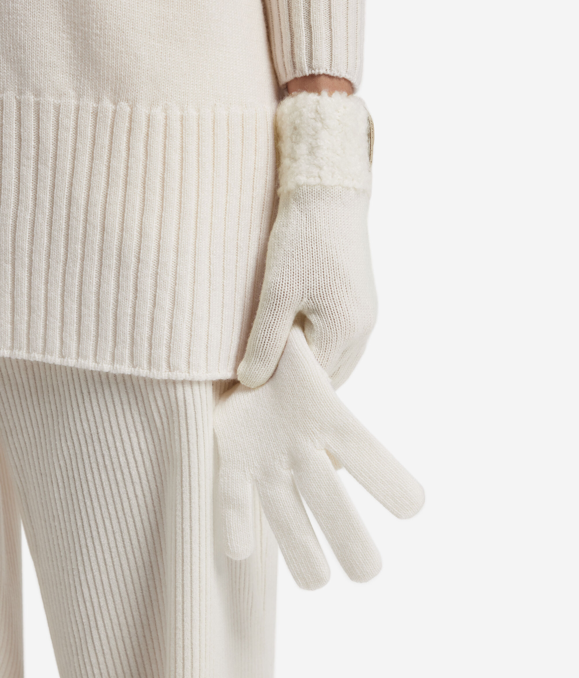 El fil de primera qualitat del cashmere ultrasoft dona a aquests guants una suavitat envoltant i una textura refinada. L'acabat de canalé de bouclé afegeix un detall refinat, transformant l'essencialitat en un gest de pura elegància. Un accessori que envolta les mans amb un luxe discret i un encant atemporal.