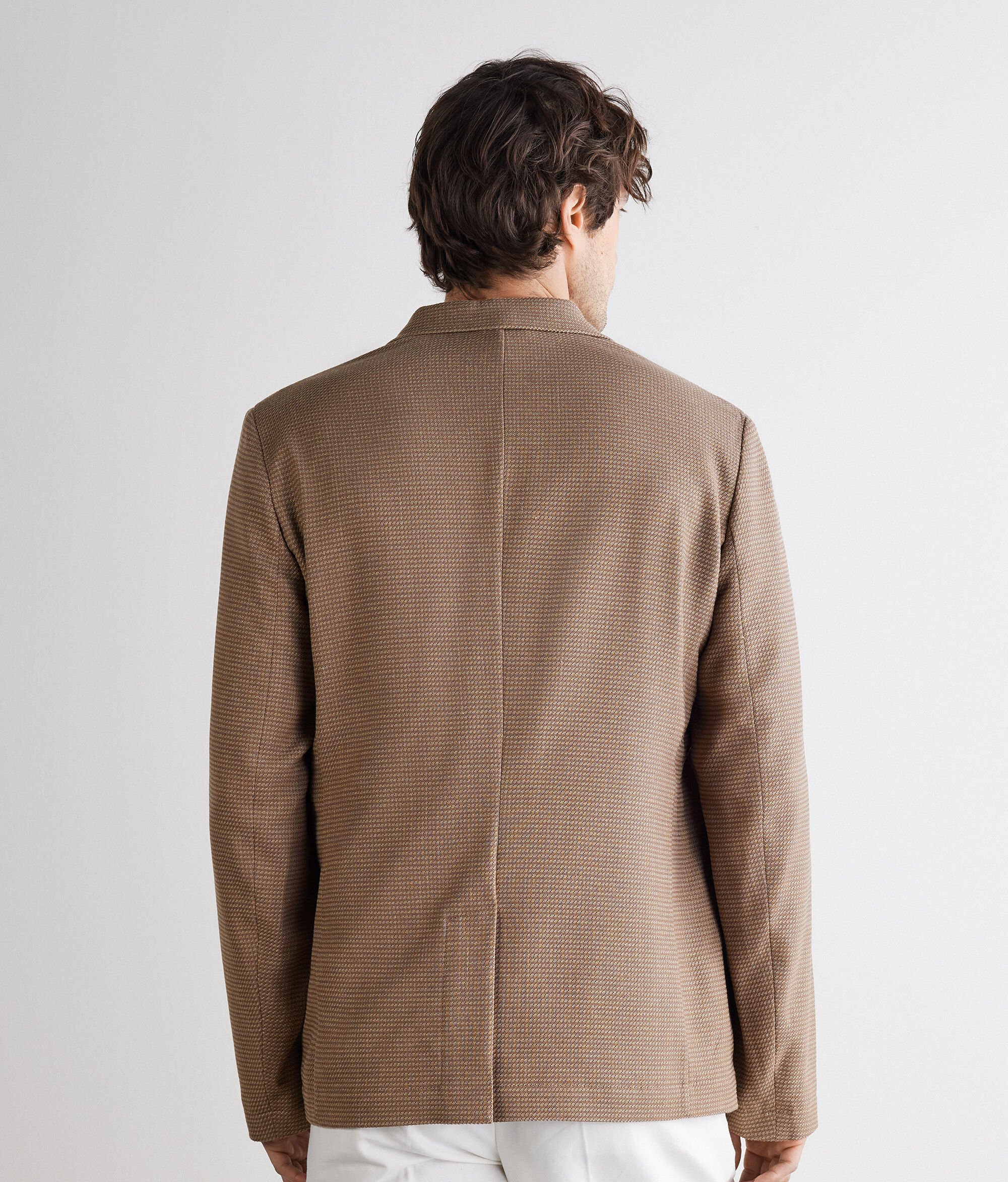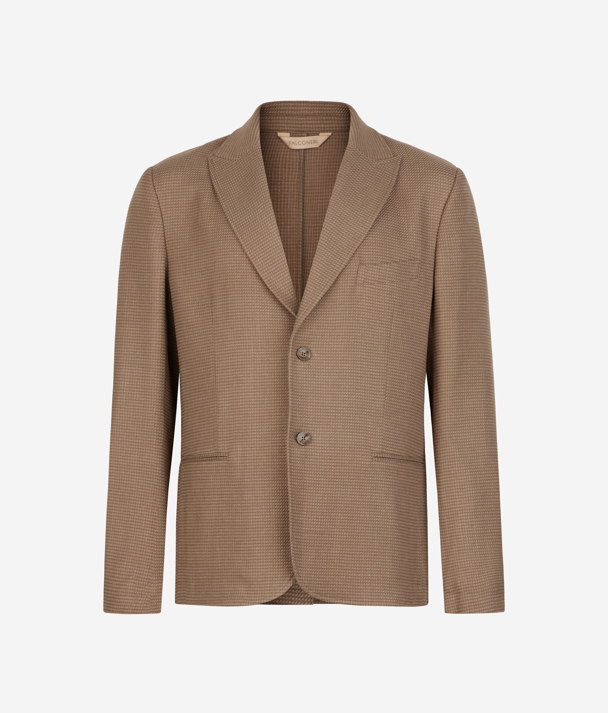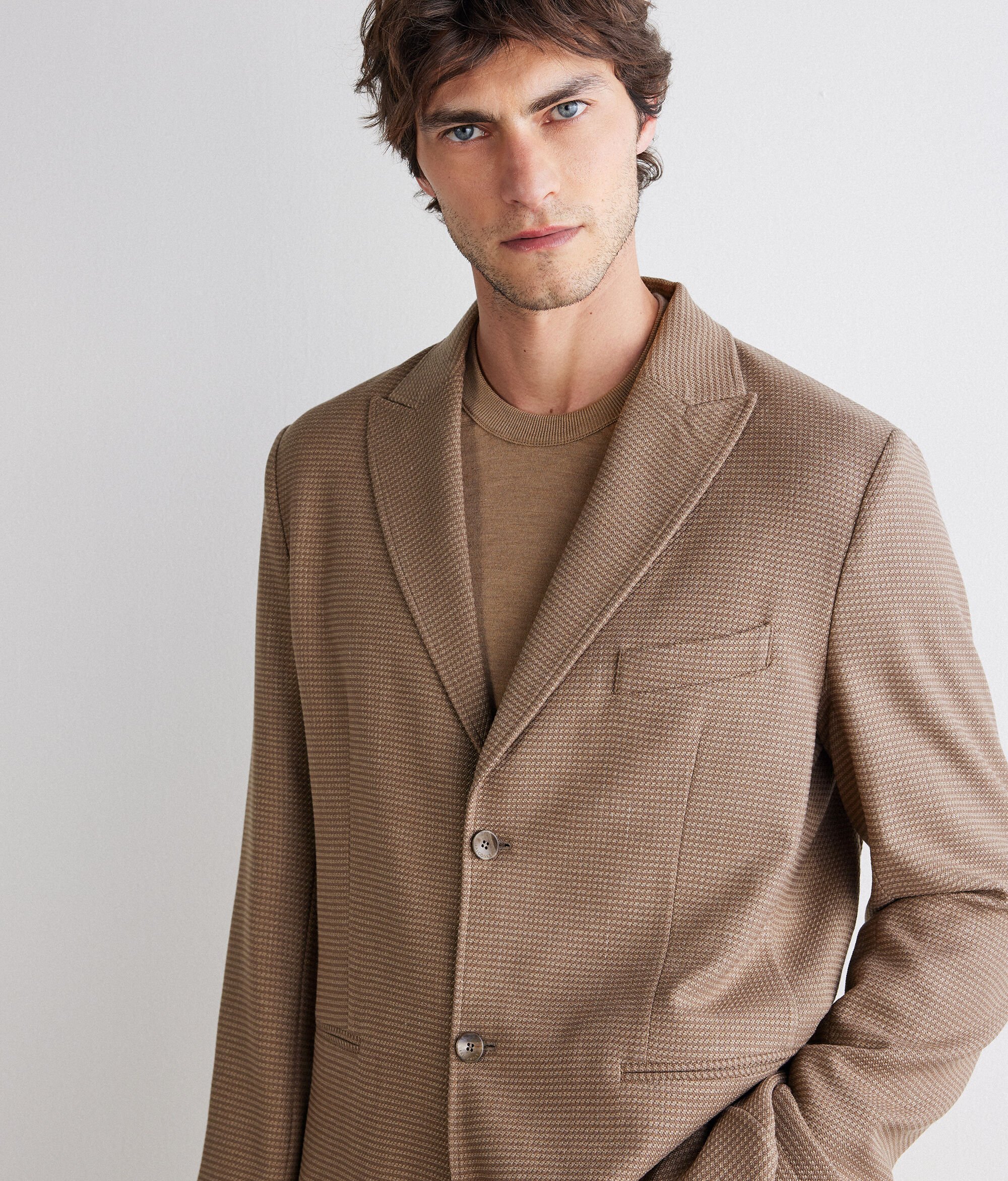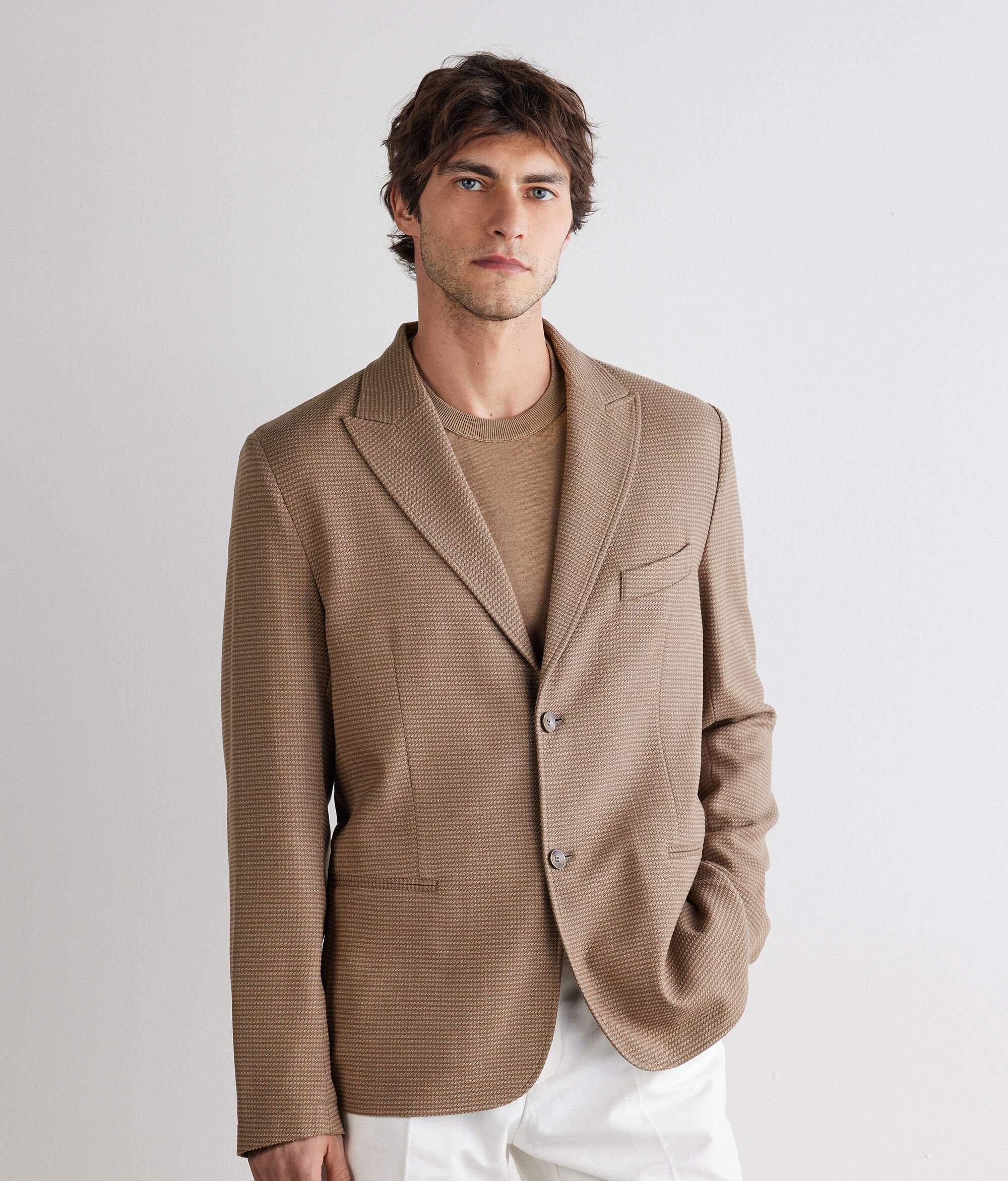 Jaqueta de teixit de cashmere i seda guarnida amb un elegant motiu de pota de gall. Caracteritzada per una solapa en punta de llança i tancament recte amb dos botons, es realça encara més amb les butxaques aplicades al davant. El canesú interior folrat confereix estructura i una suavitat envoltant, mentre que el tall estàndard abraça la figura amb una elegància natural.