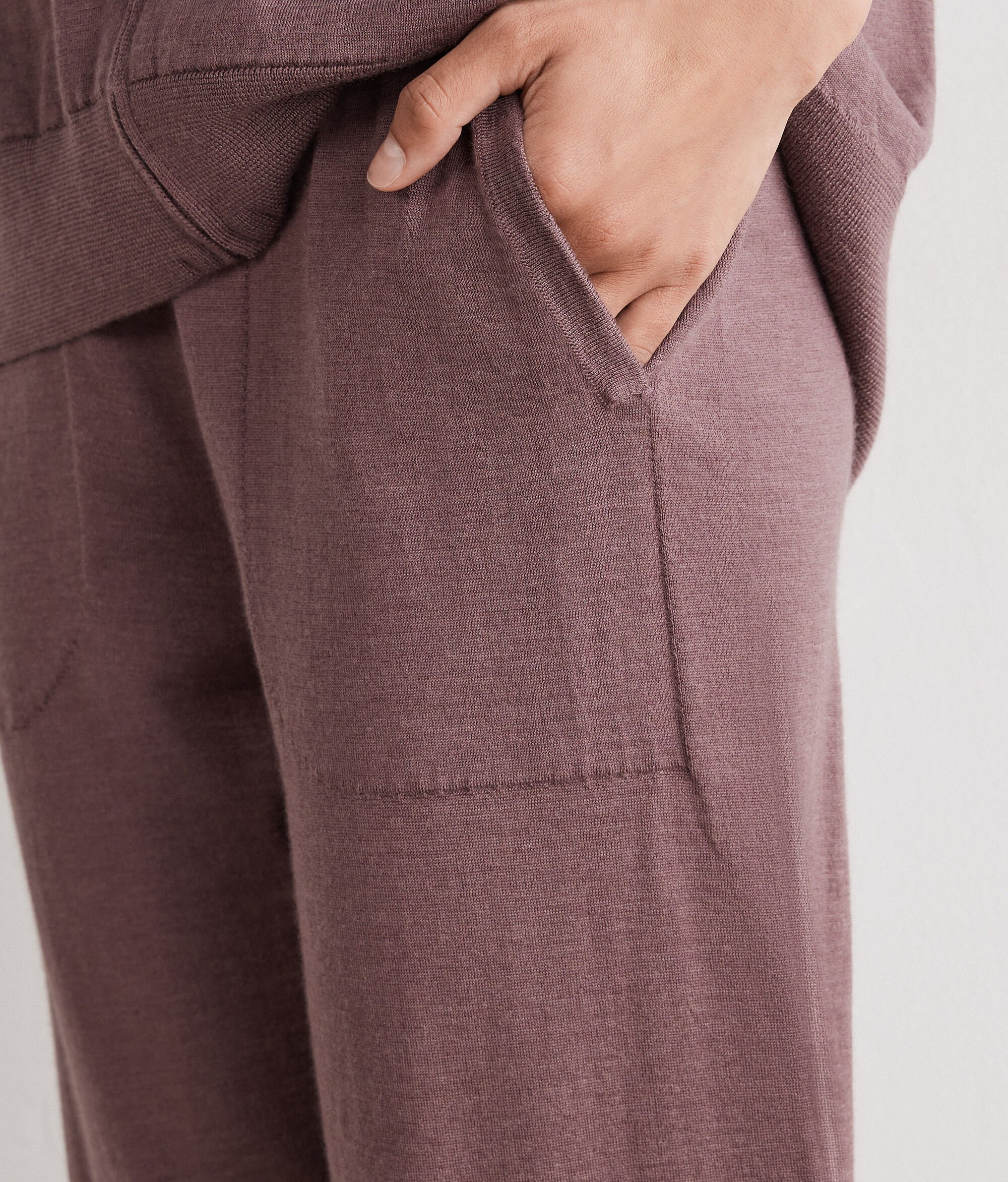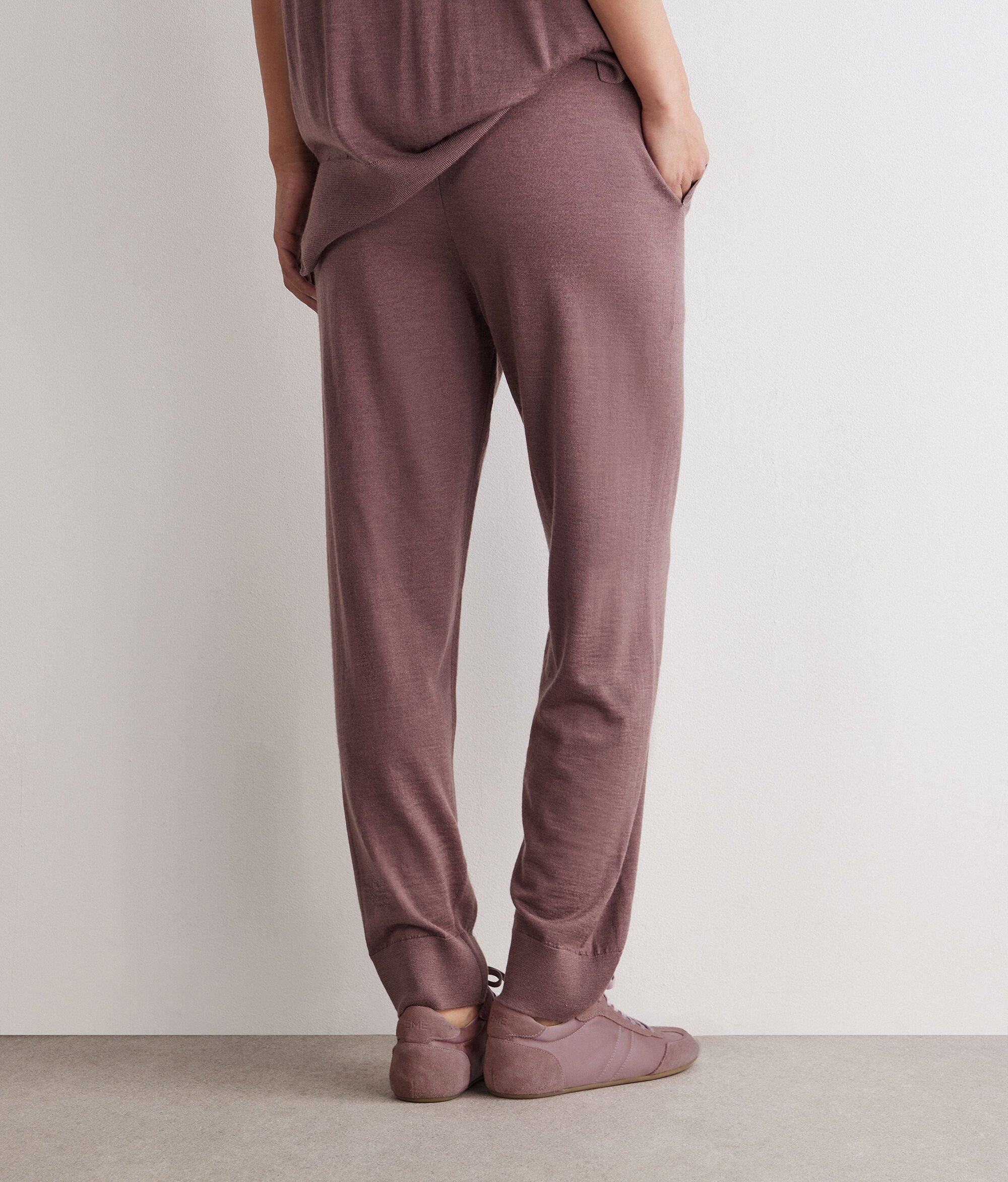 Pantalons baggy confeccionats amb Cashmere Ultrafine amb cinturilla elàstica a la cintura i tir lleugerament baix. La vora del puny als baixos és de canalé. Completen la peça les butxaques obliqües de trau. El tall és folgat.