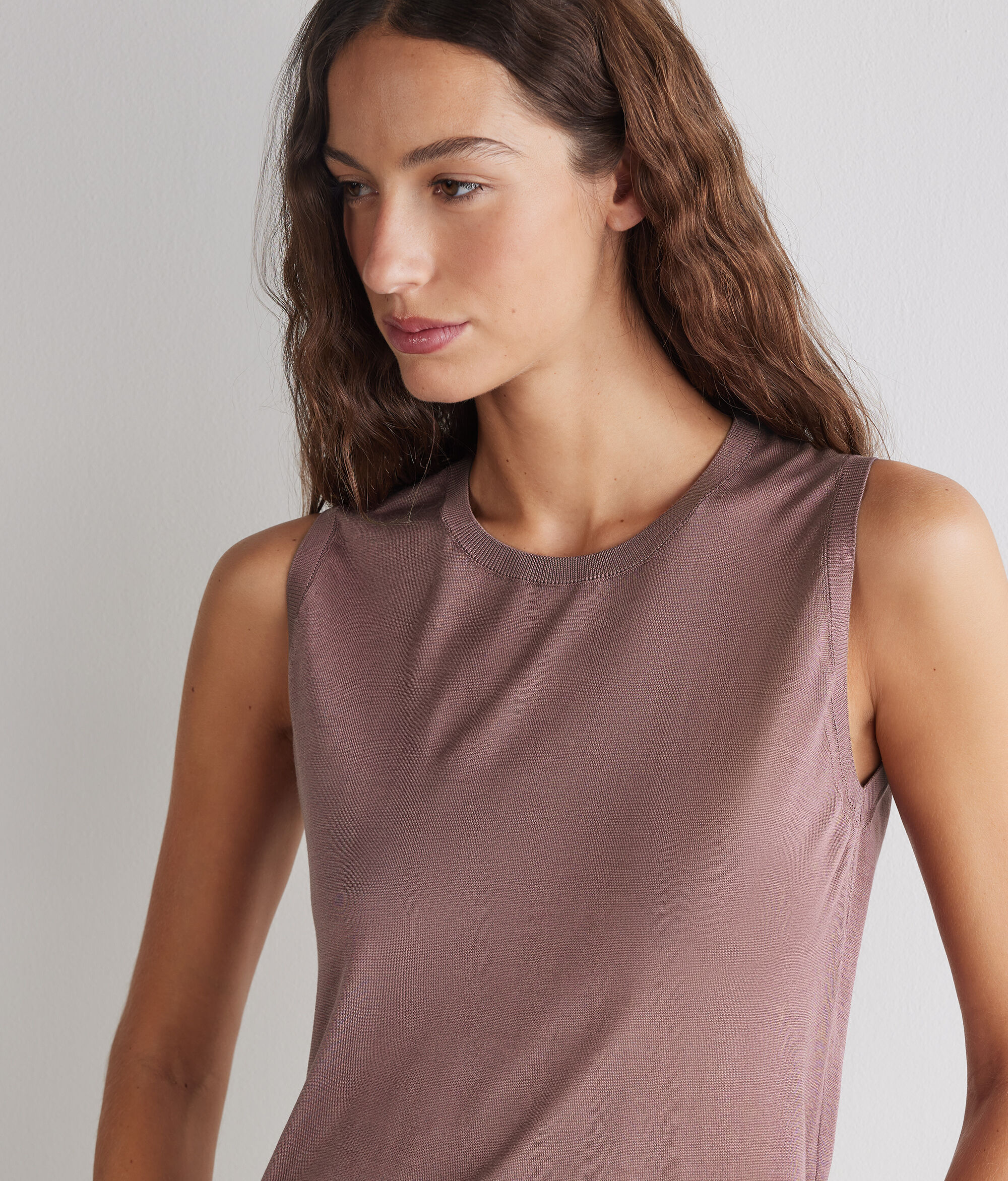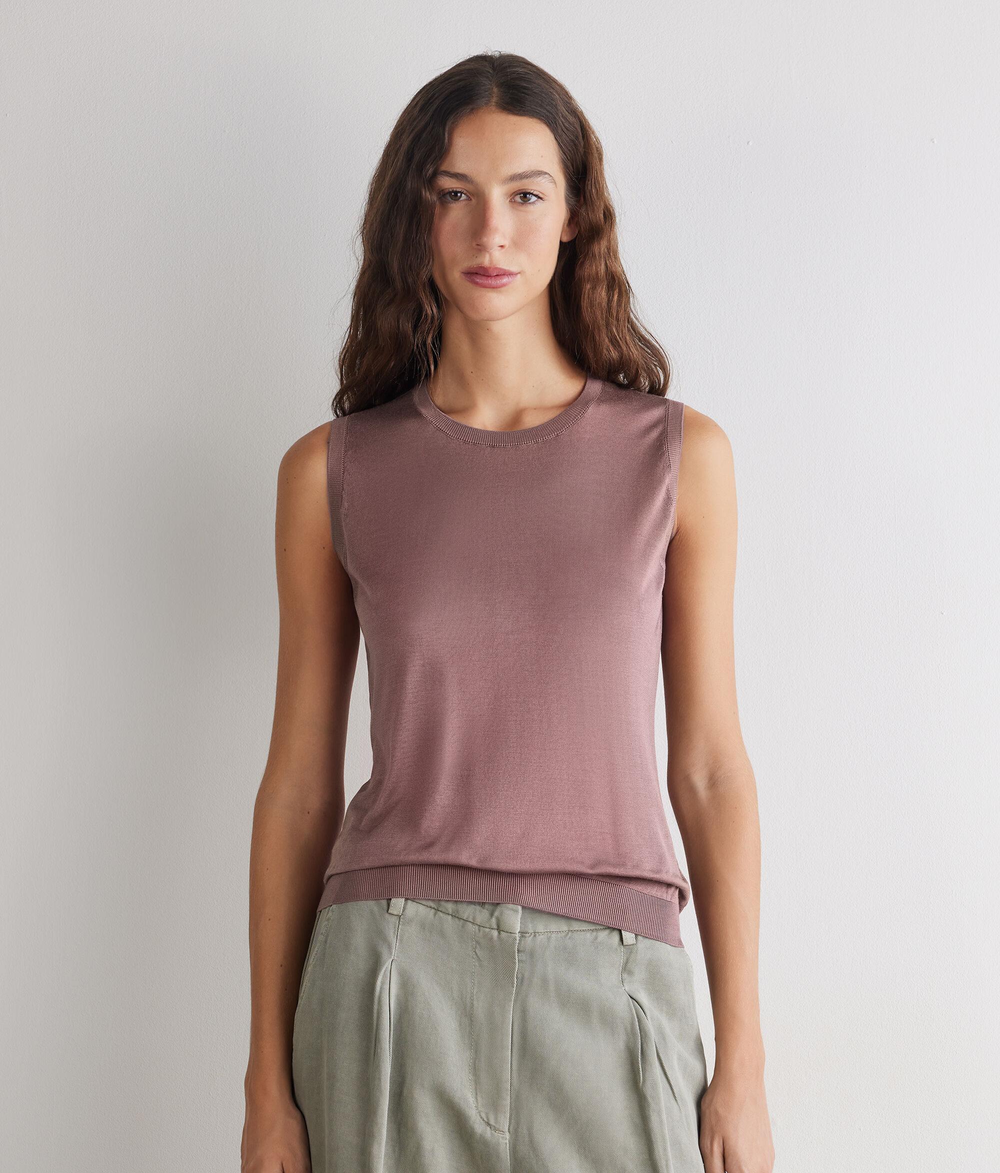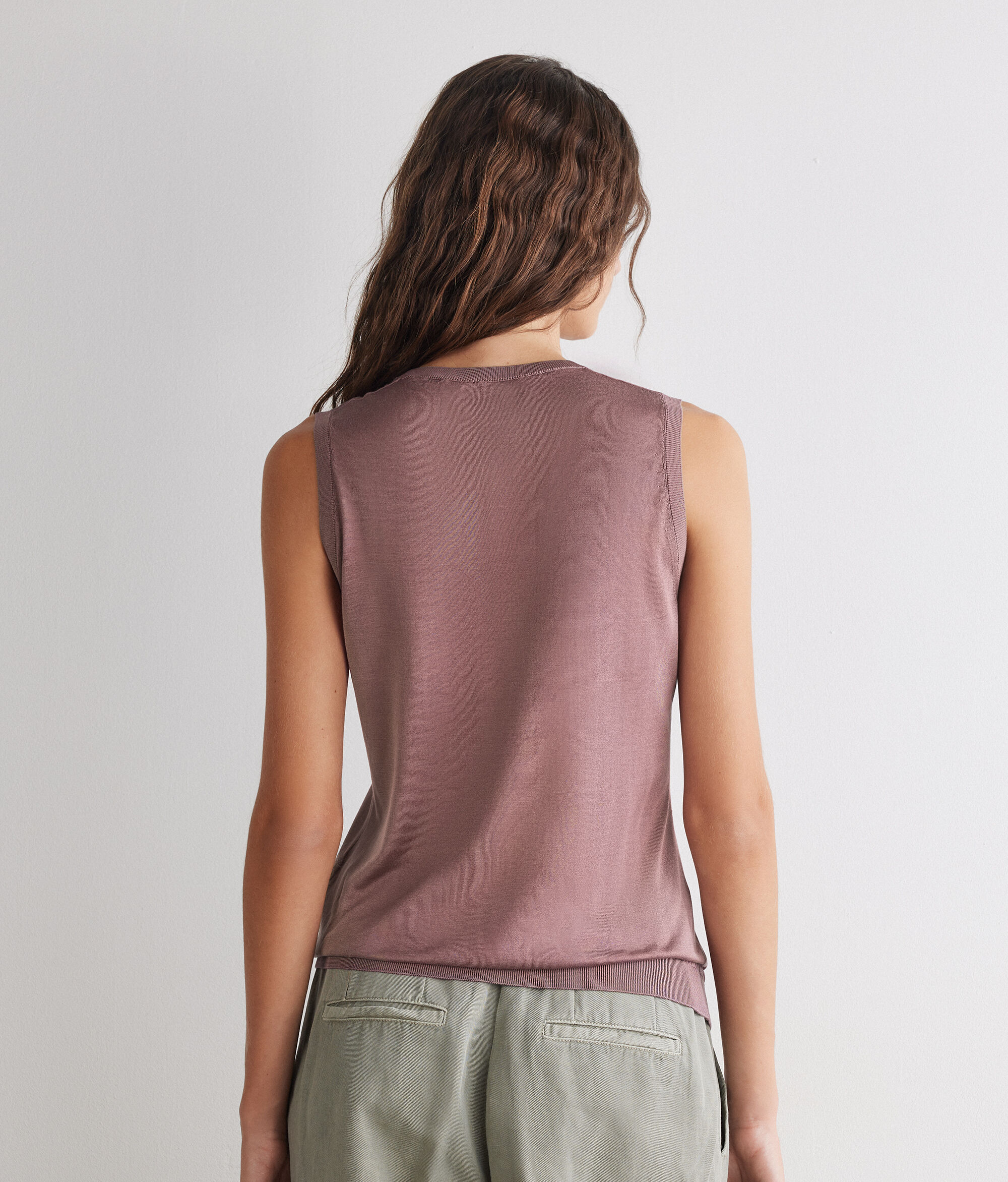 Confeccionada amb esplèndid punt de seda, aquesta samarreta sense mànigues destaca pel disseny essencial i versàtil. Els acabats amb detalls de canalé a les vores donen textura a la peça de tall entallat. Lleugera i refinada, és perfecta per portar sola o sota jaquetes i blazers.