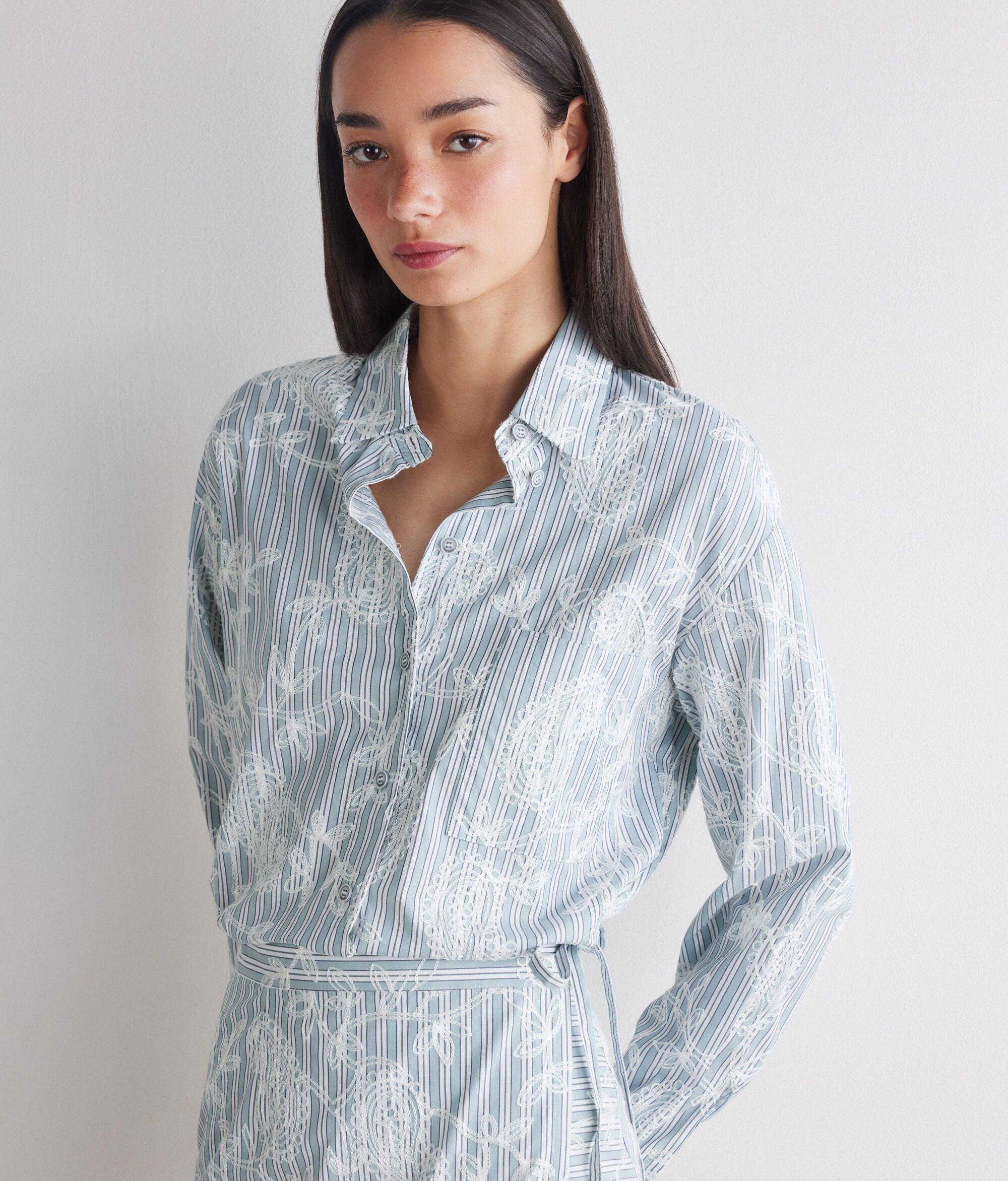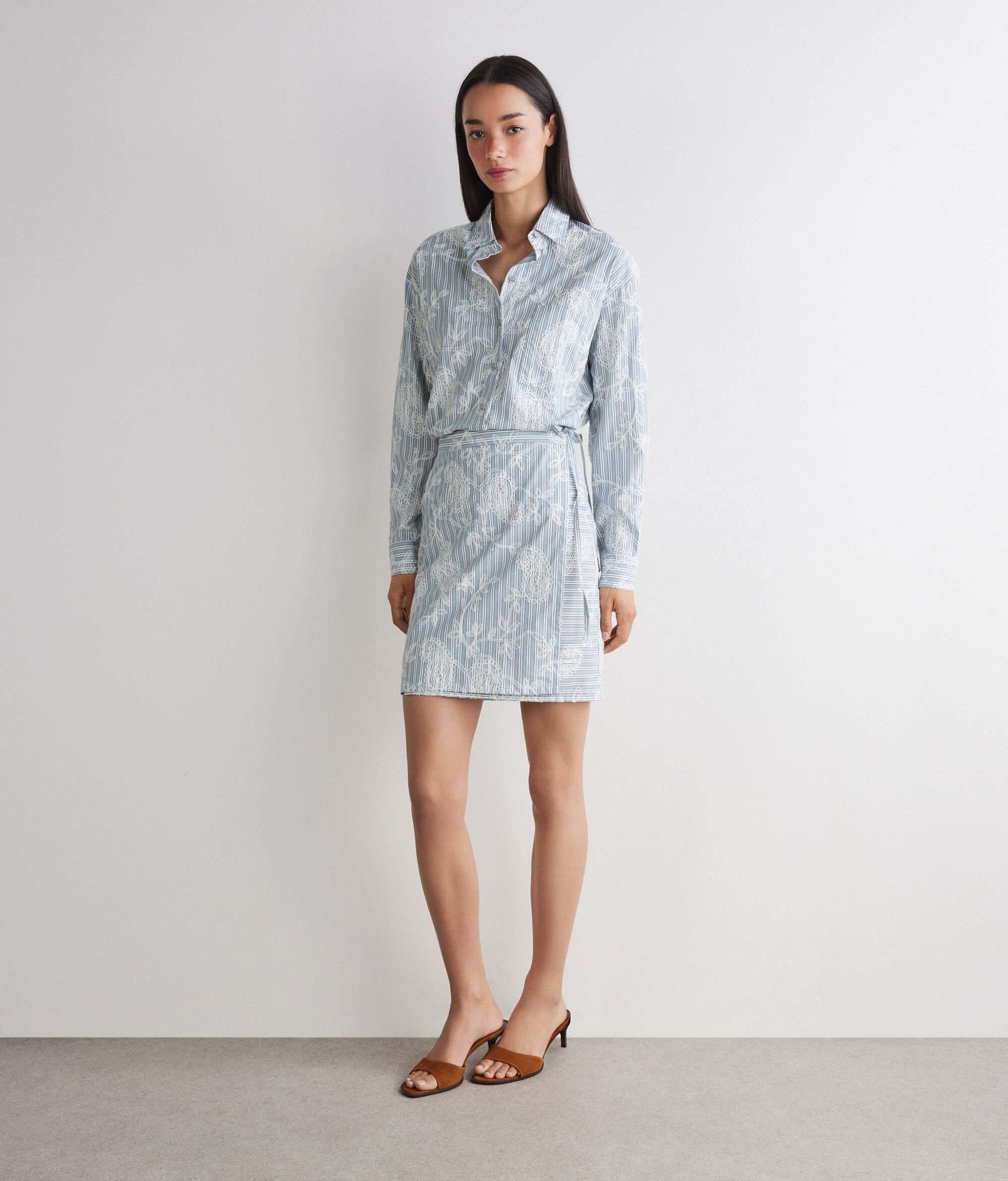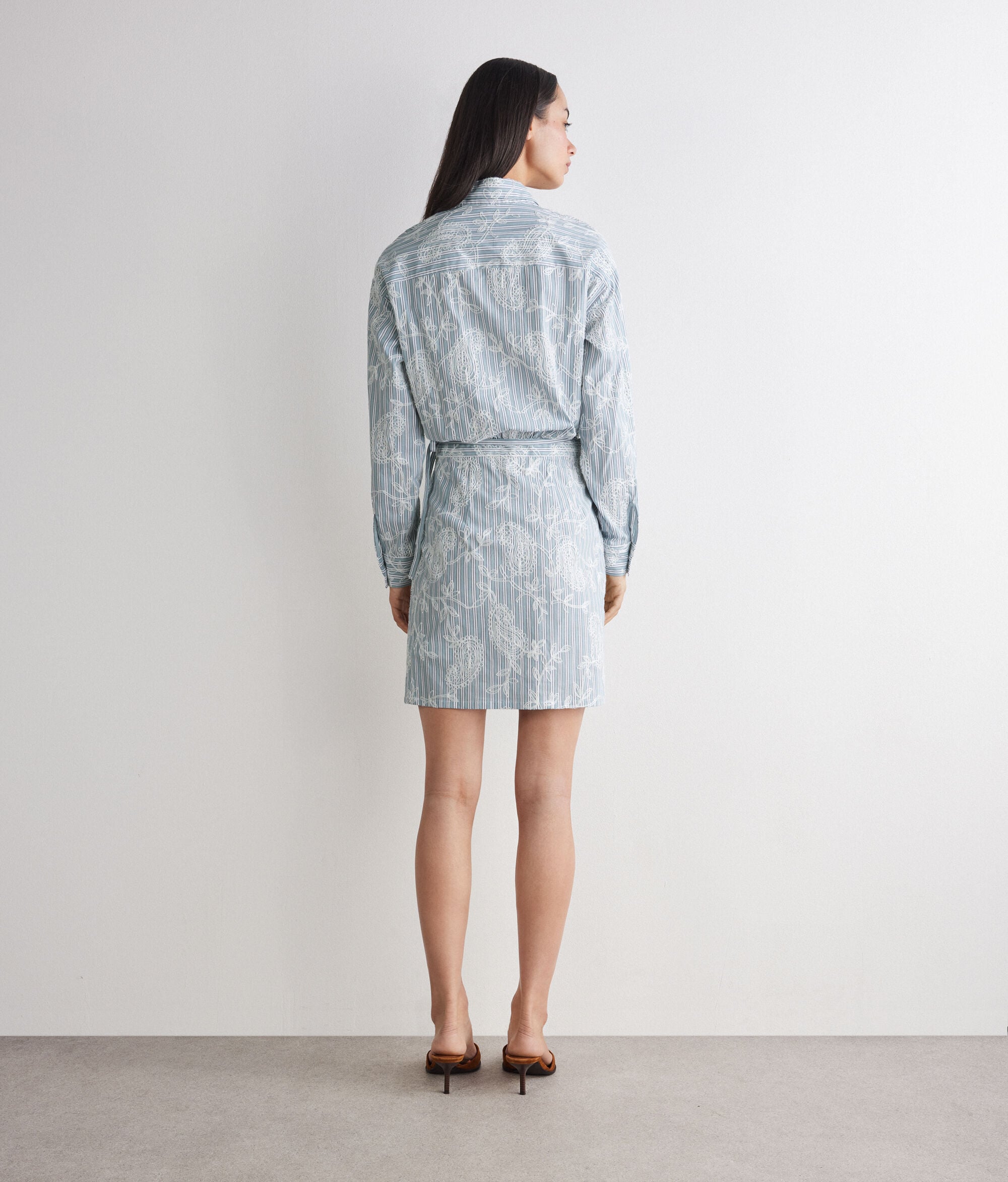 Per a la col·lecció primavera/estiu 2026, Falconeri presenta una nova càpsula d'edició limitada. Aquest vestit de cotó es caracteritza per un refinat tancament recte i es completa amb un brodat floral que se superposa a l'estampat de ratlles, creant un elegant joc de contrastos.