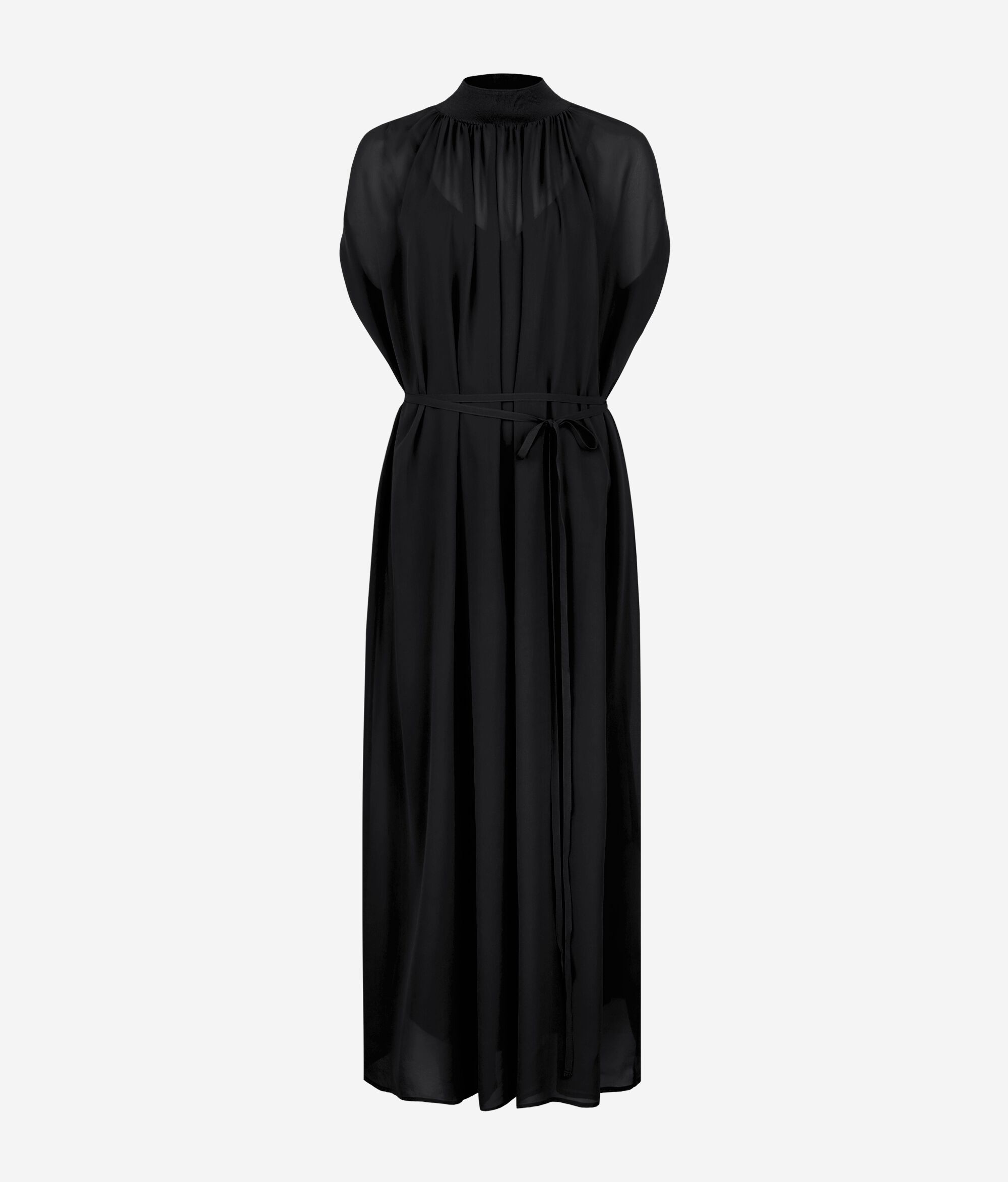 Vestit llarg de georgette de seda amb un refinat coll alt de canalé de punt de cotó. Els frunzits a l'espatlla i l'escot transmeten moviment i feminitat a la silueta, mentre que el cinturó de georgette amb travetes defineix la cintura amb elegància. La peça es completa amb una combinació de punt de cotó amb escot en punta, tirants regulables i acabat de canalé als baixos.