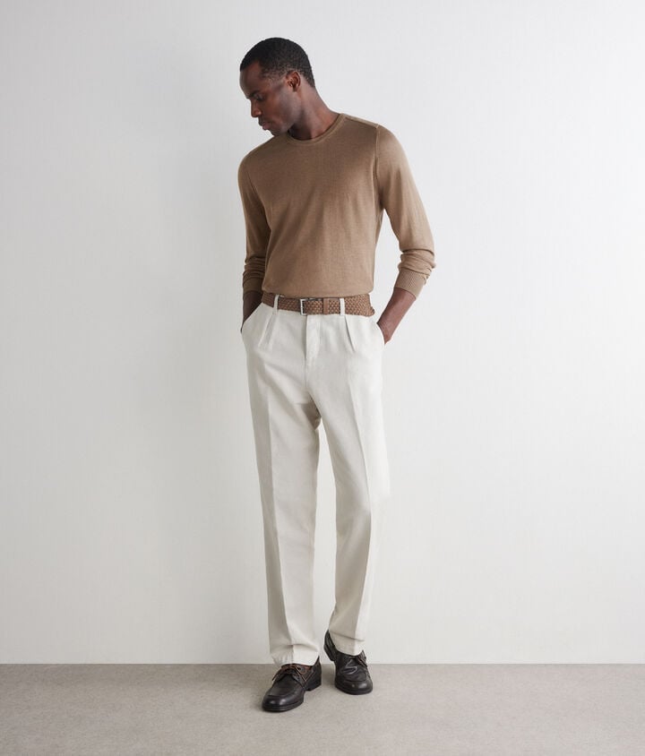 Nuestros cortes equilibran elegancia y funcionalidad, con siluetas rectas que favorecen y permiten libertad de movimiento. La paleta de colores, que incluye neutros clásicos, azules profundos y tonos tierra, está inspirada en la naturaleza mediterránea, aportando frescura y versatilidad. Las prendas se adaptan tanto a un día de trabajo como a momentos de ocio, y combinan fácilmente con otras piezas Falconeri para crear outfits de hombre completos. El resultado es un estilo auténtico que acompaña al hombre moderno con confianza allá donde vaya.