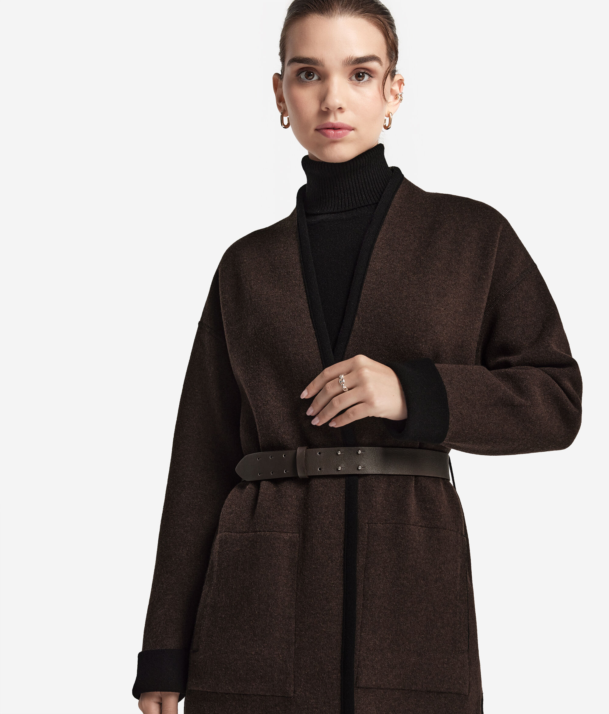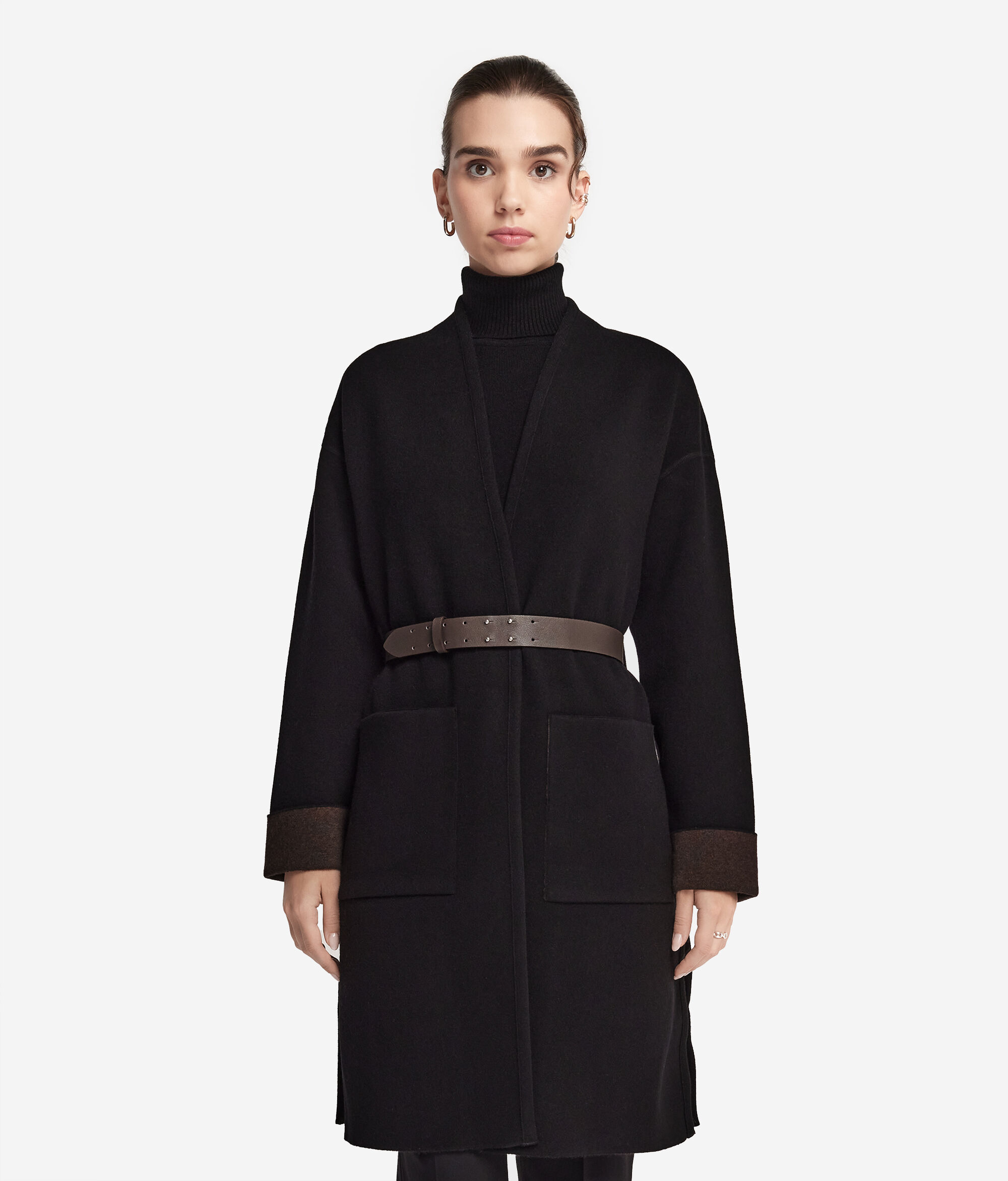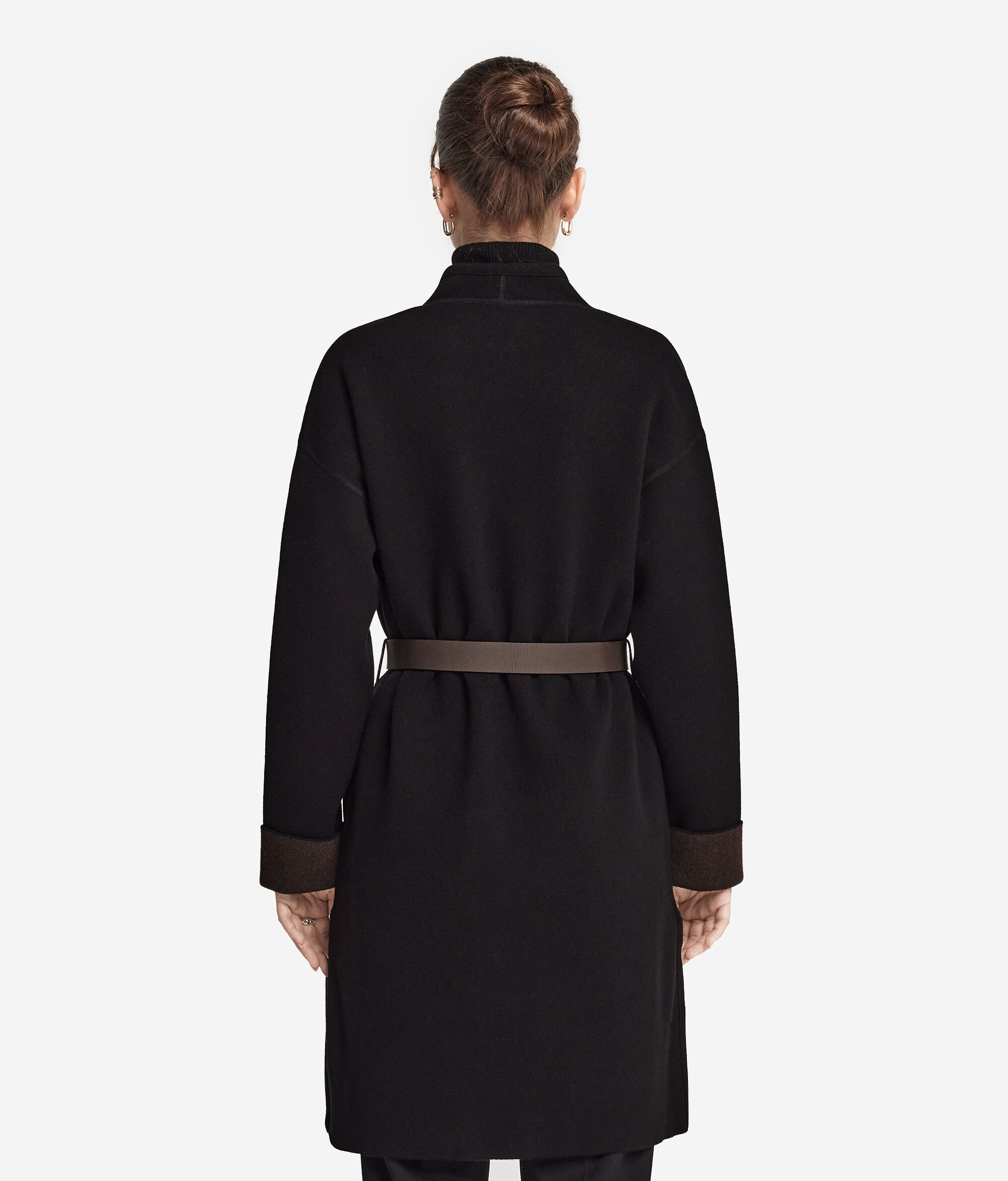 Intérprete de un gusto elegante y sofisticado, este abrigo reversible en puro cashmere se distingue por sus detalles de sastrería y por el cinturón de piel que resalta sus líneas delineando la cintura.