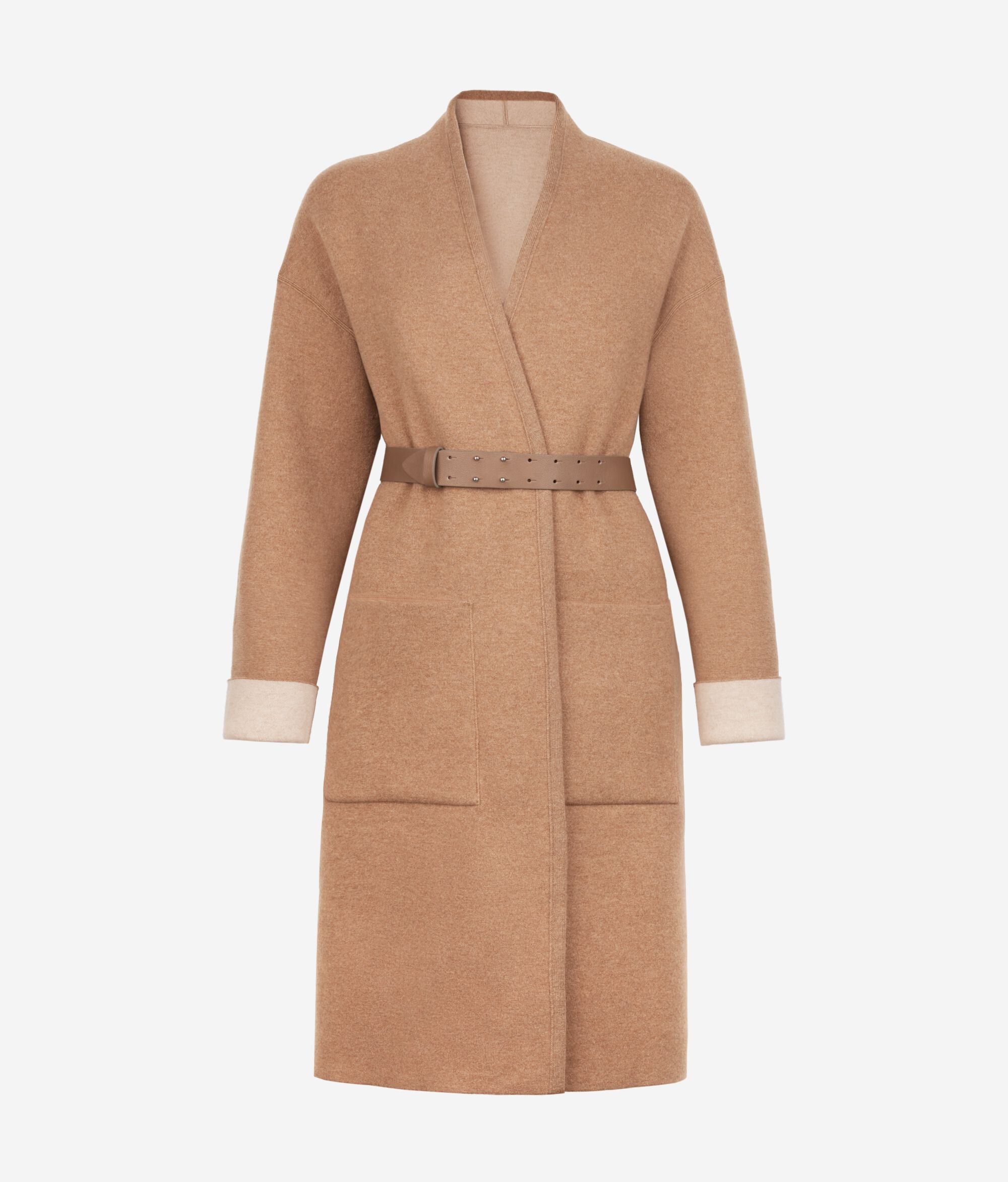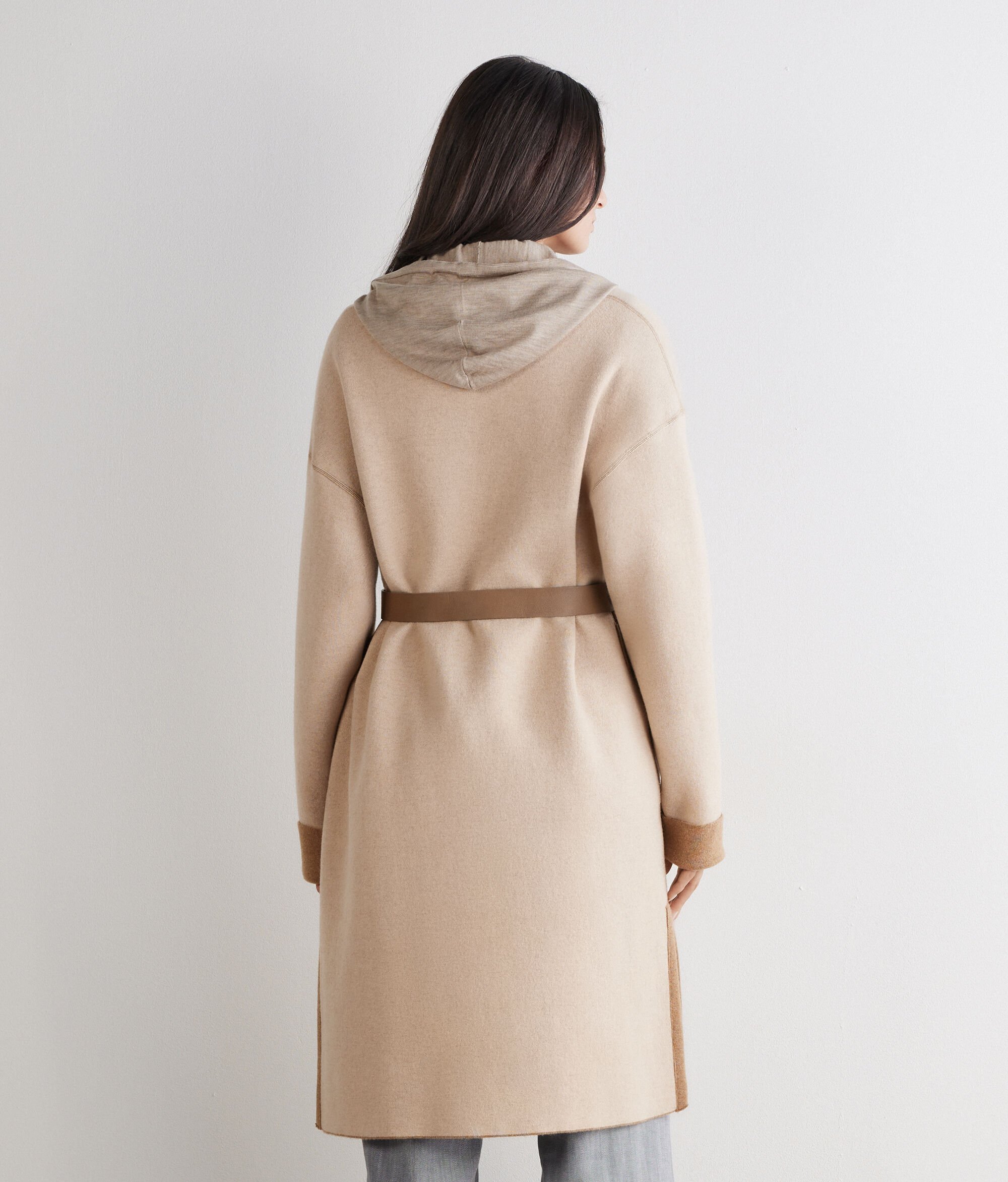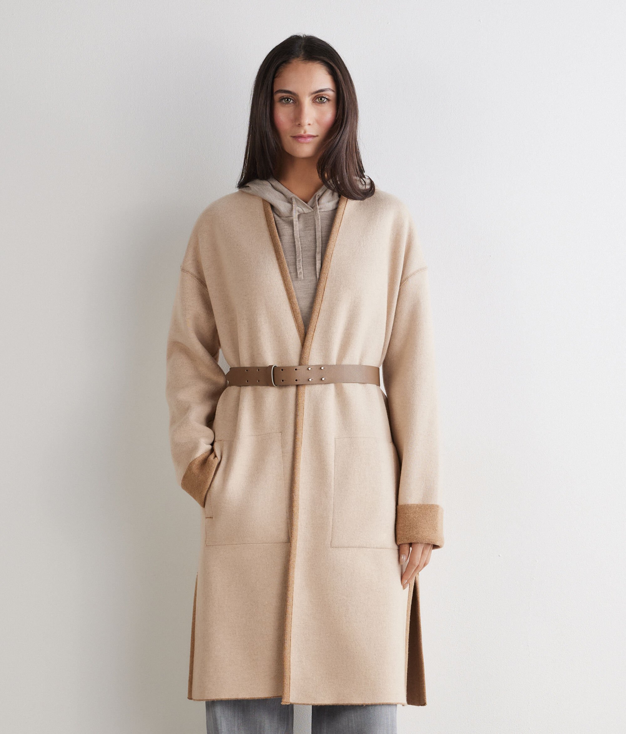 Intérprete de un gusto elegante y sofisticado, este abrigo reversible en puro cashmere se distingue por sus detalles de sastrería y por el cinturón de piel que resalta sus líneas delineando la cintura.
