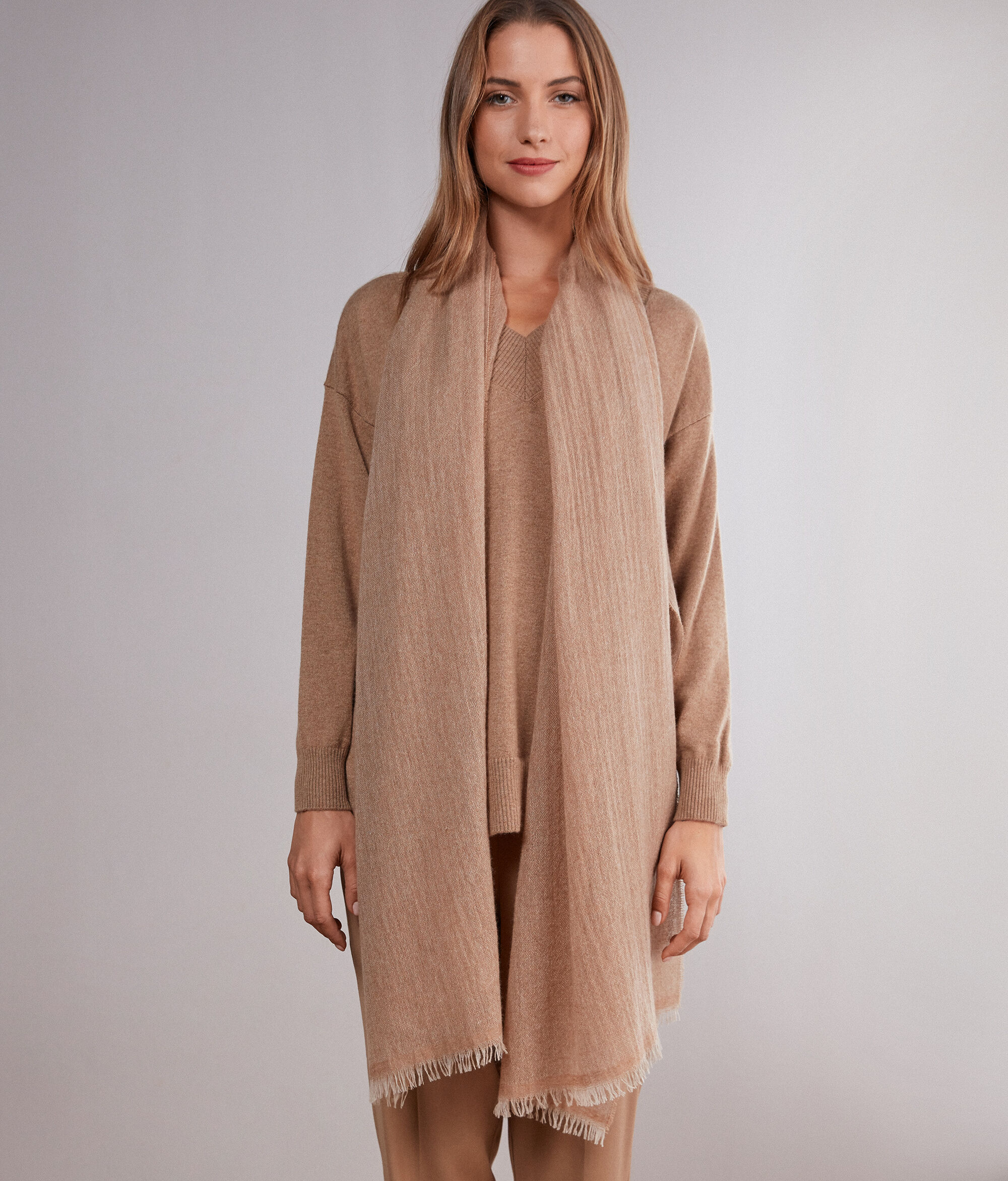 Esta bufanda, realizada en suave cashmere ultrafine, es el accesorio ideal para aportar un toque de estilo y elegancia a tus looks. Ligera pero increíblemente cálida, envuelve con delicadeza el cuello y lo protege durante las jornadas más frías.