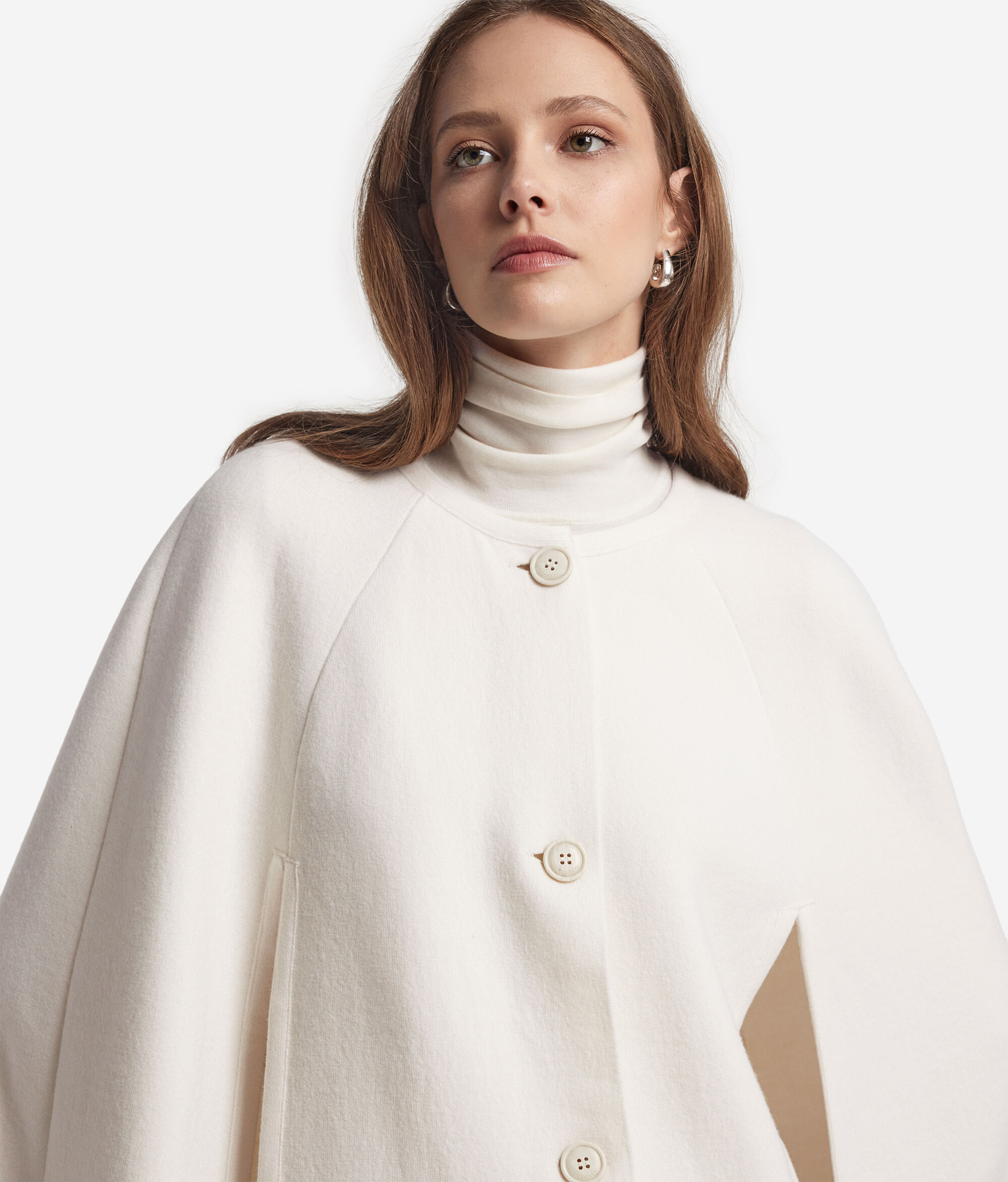 Esta capa, confeccionada en tejido de cashmere, es la prenda ideal para completar cualquier estilismo con ligereza y total calidez. La botonadura central y las aberturas laterales completan su diseño relajado y le confieren un toque de clase que hace que no pase desapercibida.
