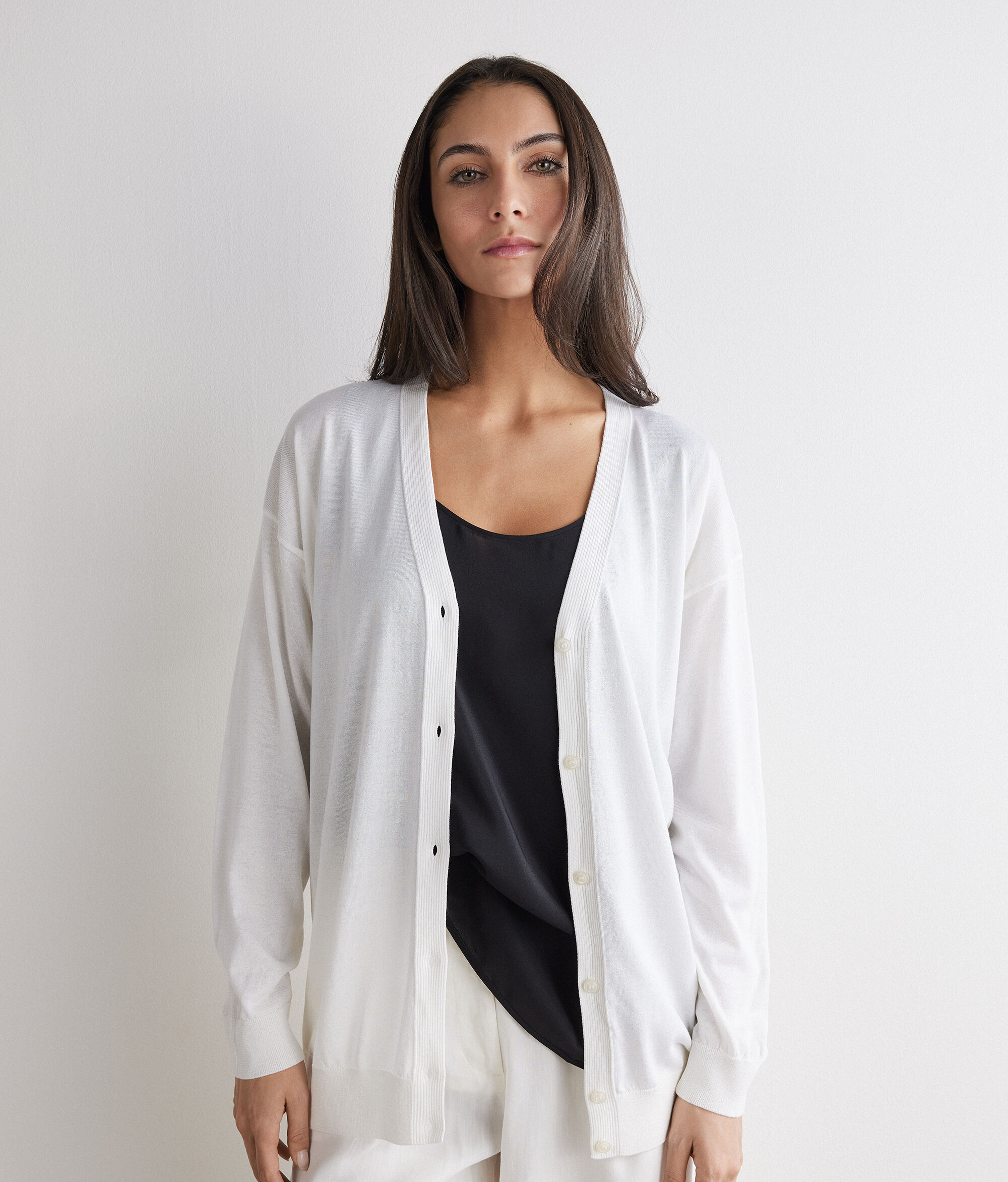Realizado en una elegante mezcla de seda y algodón, este cárdigan propone un equilibrio perfecto entre ligereza y suavidad. Los remates de canalé del cuello, los hombros y el bajo resaltan su tejido envolvente aportando textura y un toque de elegancia al diseño esencial de la prenda.